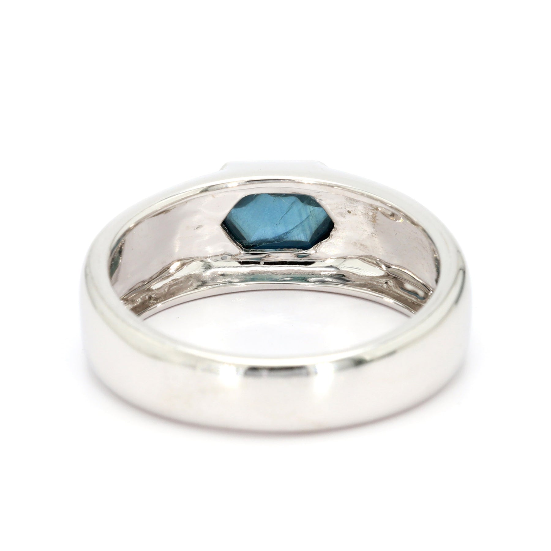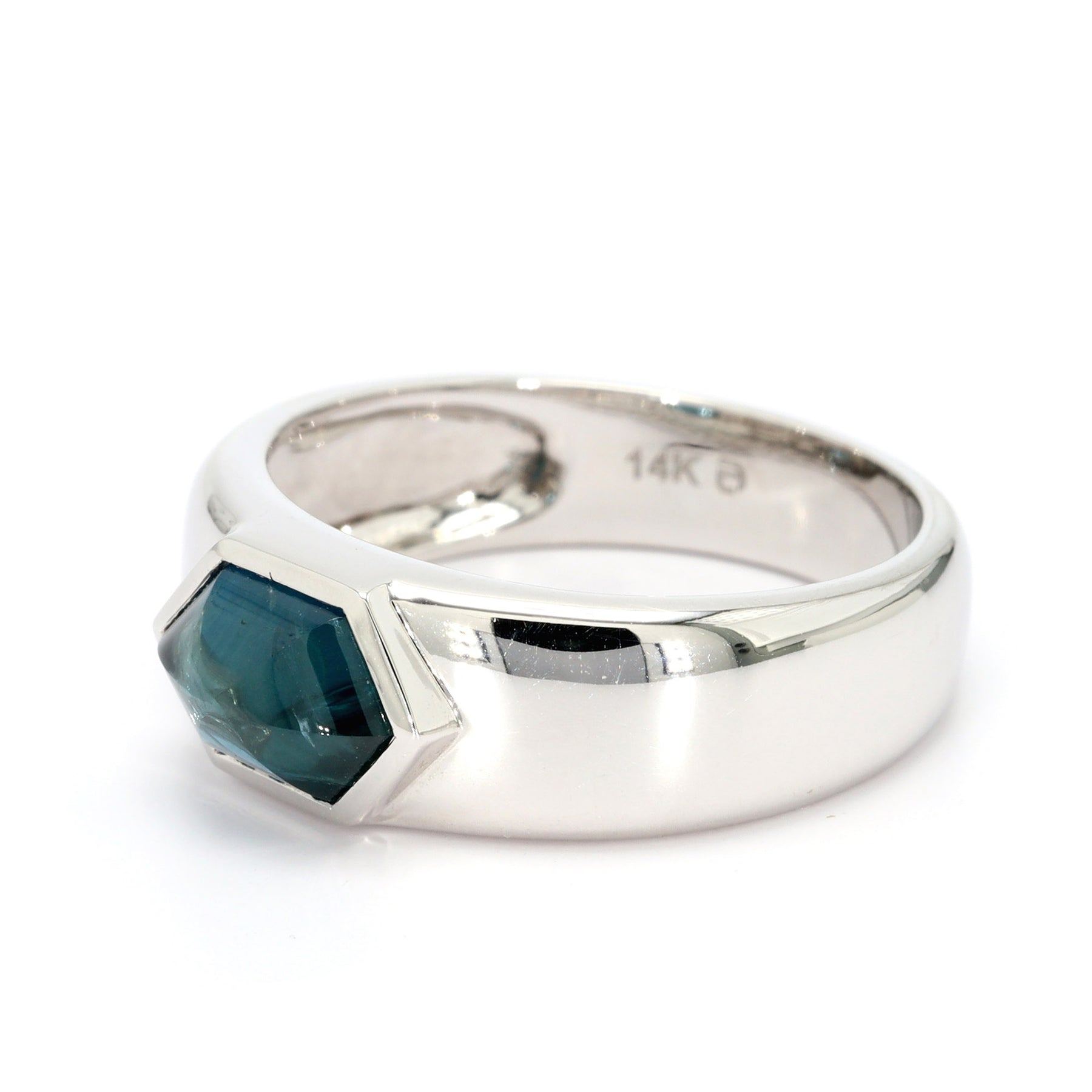 Solitaire fashion ring in 14-karat white gold, featuring a 1.45 carat hexagonal sugarloaf cut blue Sapphire in a bezel setting.