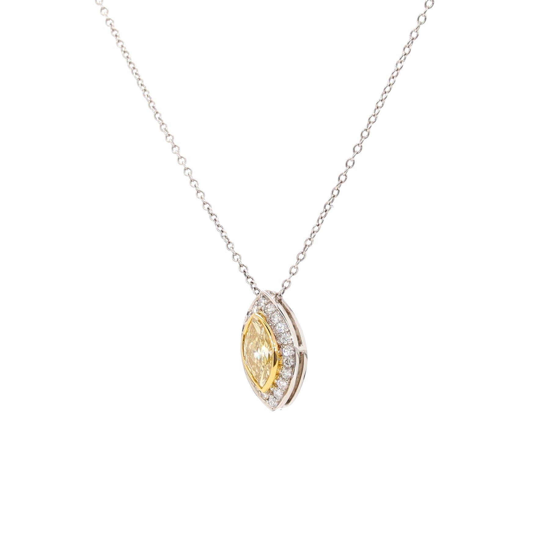 Fixed pendant necklace in platinum and 18-karat yellow gold a0.52 carat marquise-cut yellow diamond, accented with 20 round brilliant cut side diamonds with a combined weight of 0.06 carats, on an 18" platinum chain.
