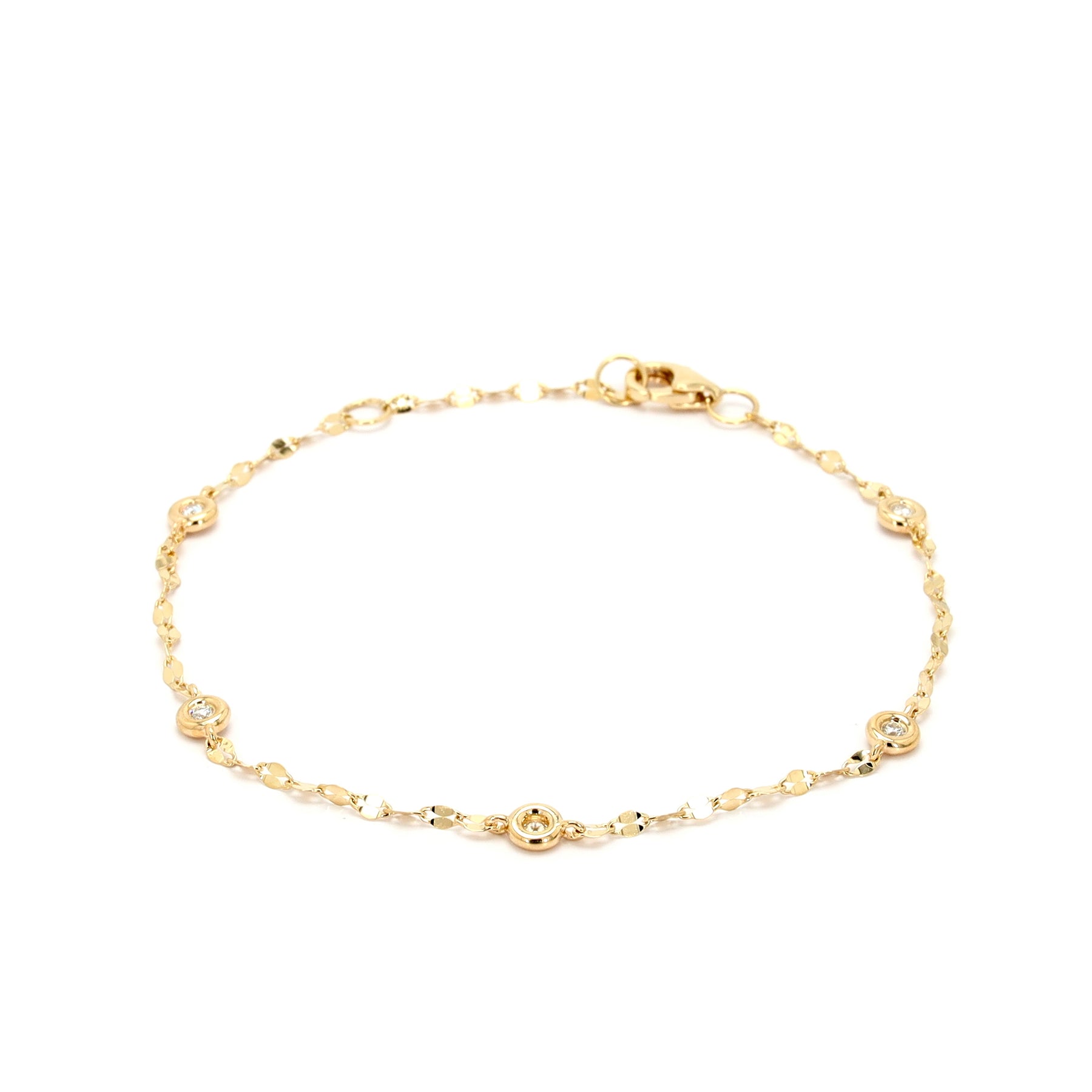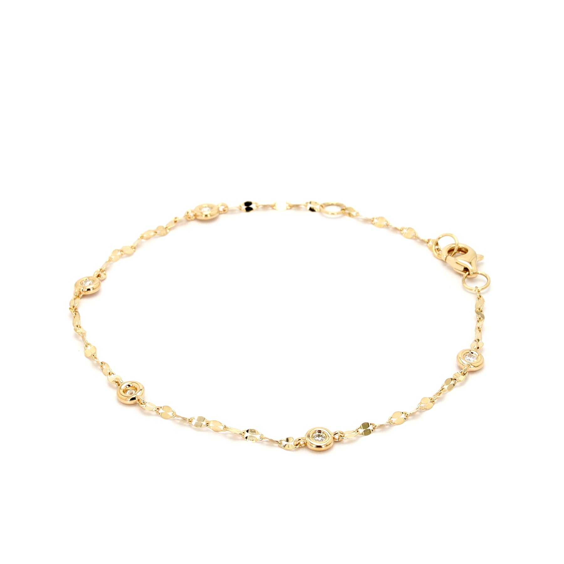 Station bracelet in 14-karat yellow gold, featuring five bezel-set diamonds with a combined weight of 0.10 carats, stationed along an adjustable 7 inch chain.