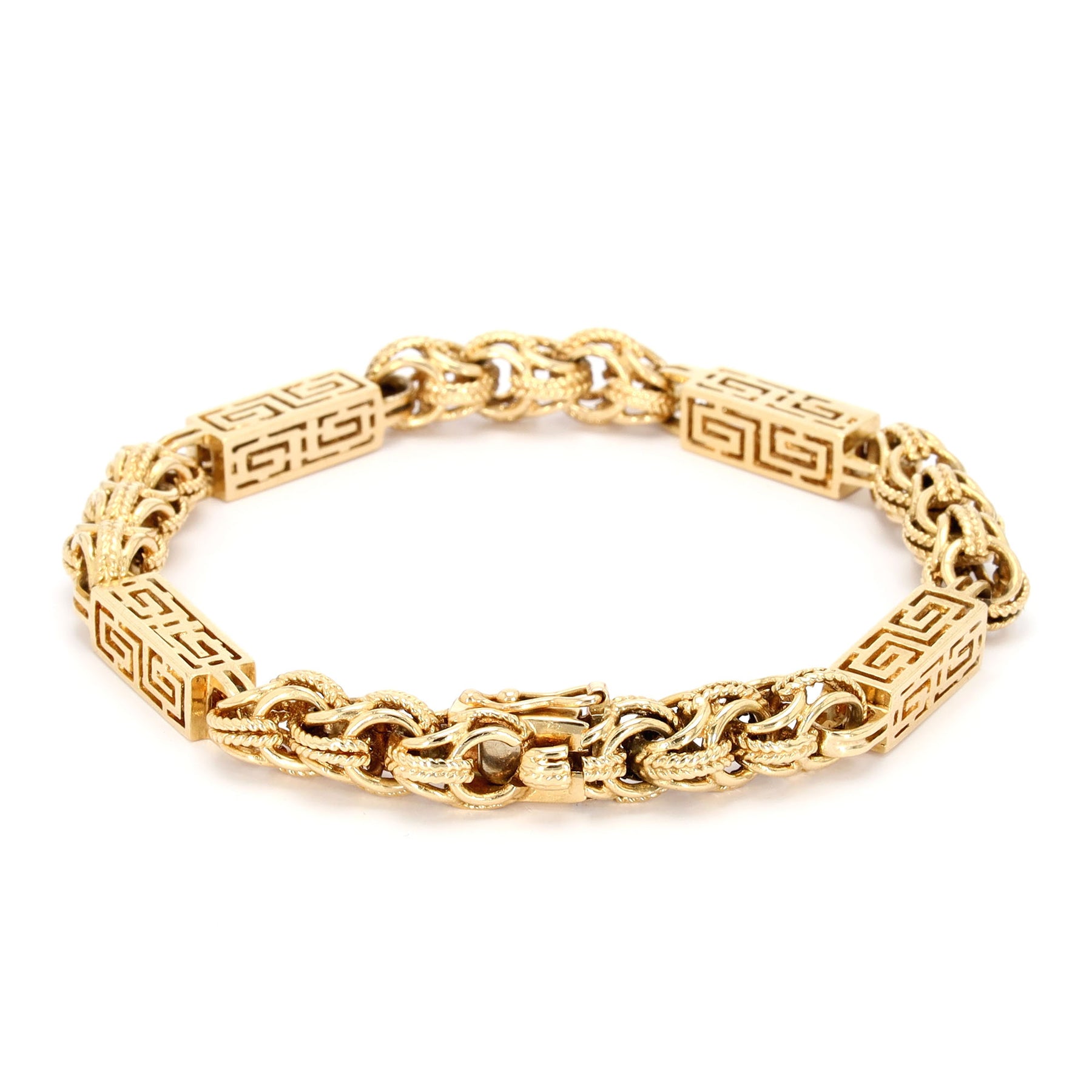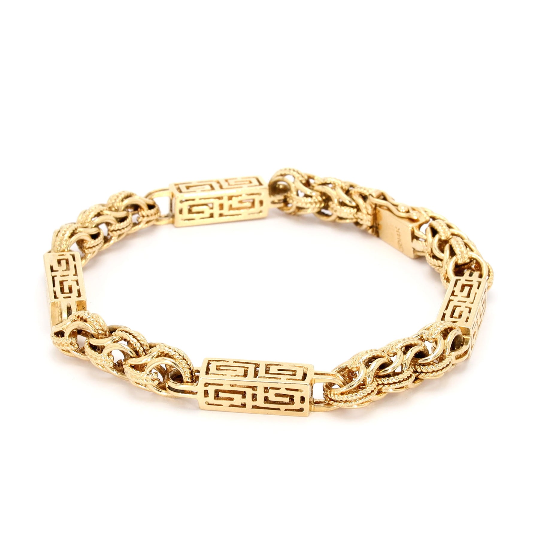 Bracelet in 14-karat yellow gold, featuring five rectangular box stations with a cutaway Greek key motif.