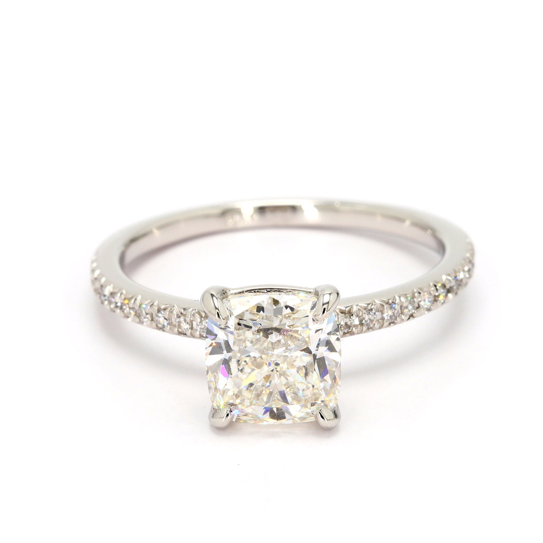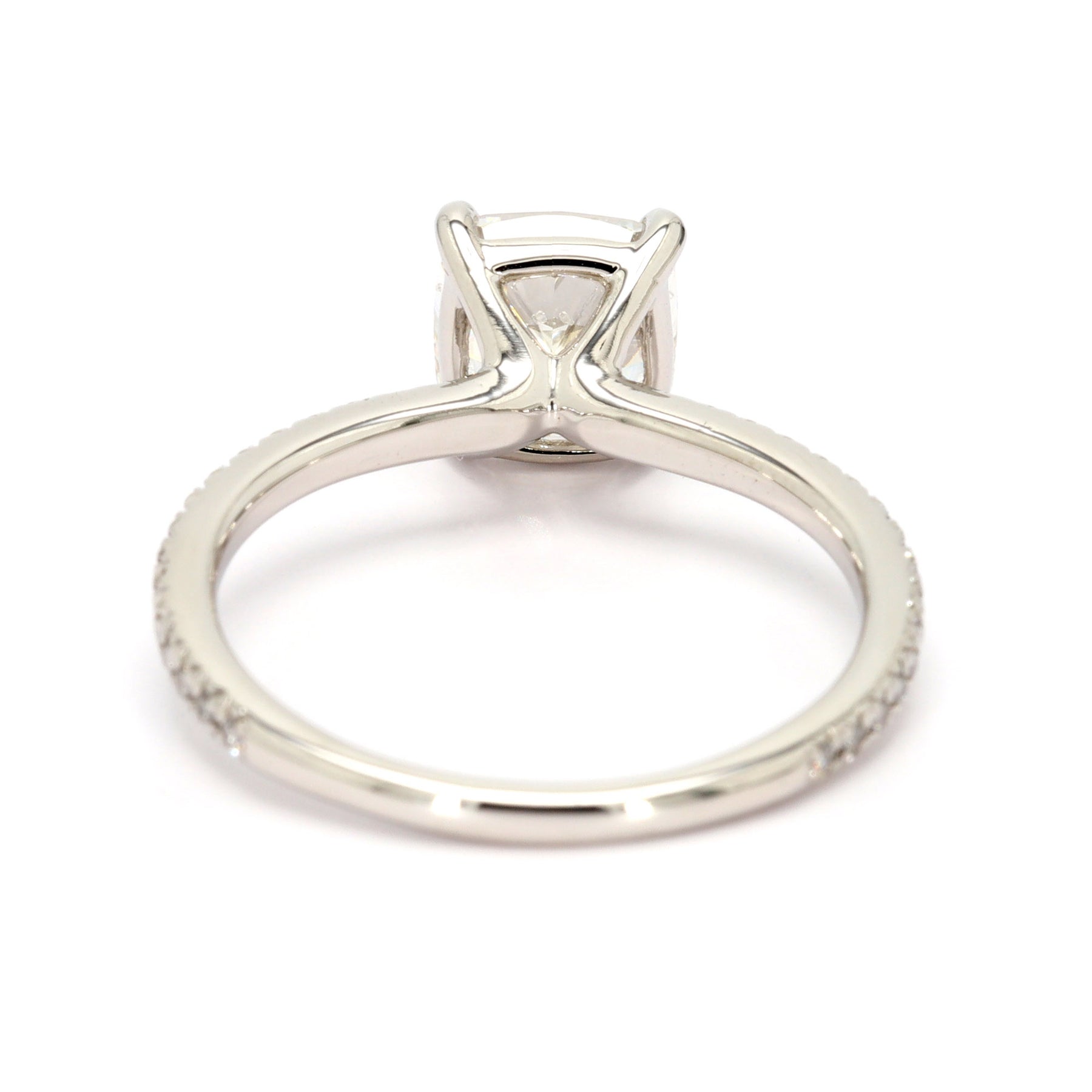Engagement ring in platinum, featuring a 2.00 carat cushion-cut diamond, accented with 34 round brilliant diamonds with a combined weight of 0.20 carats.
