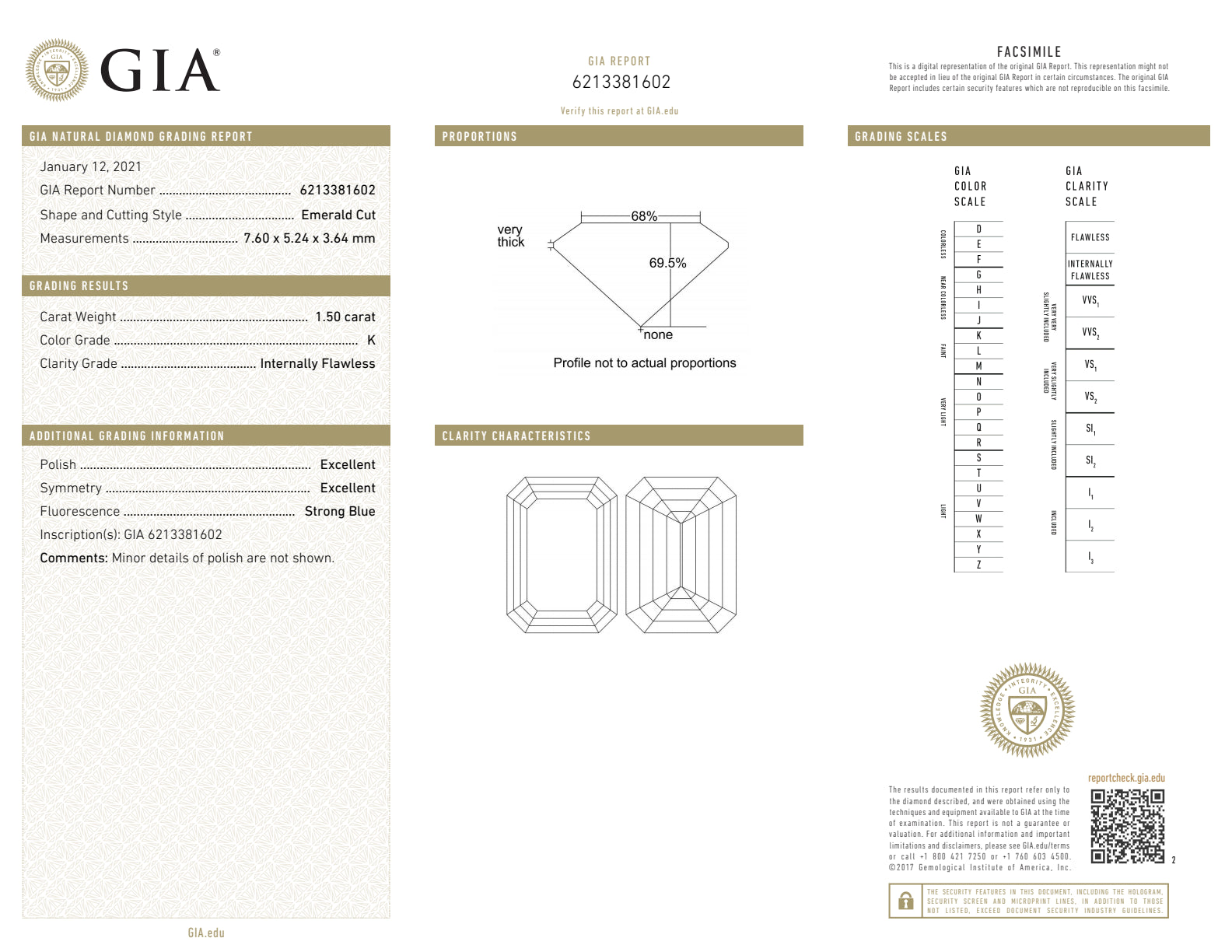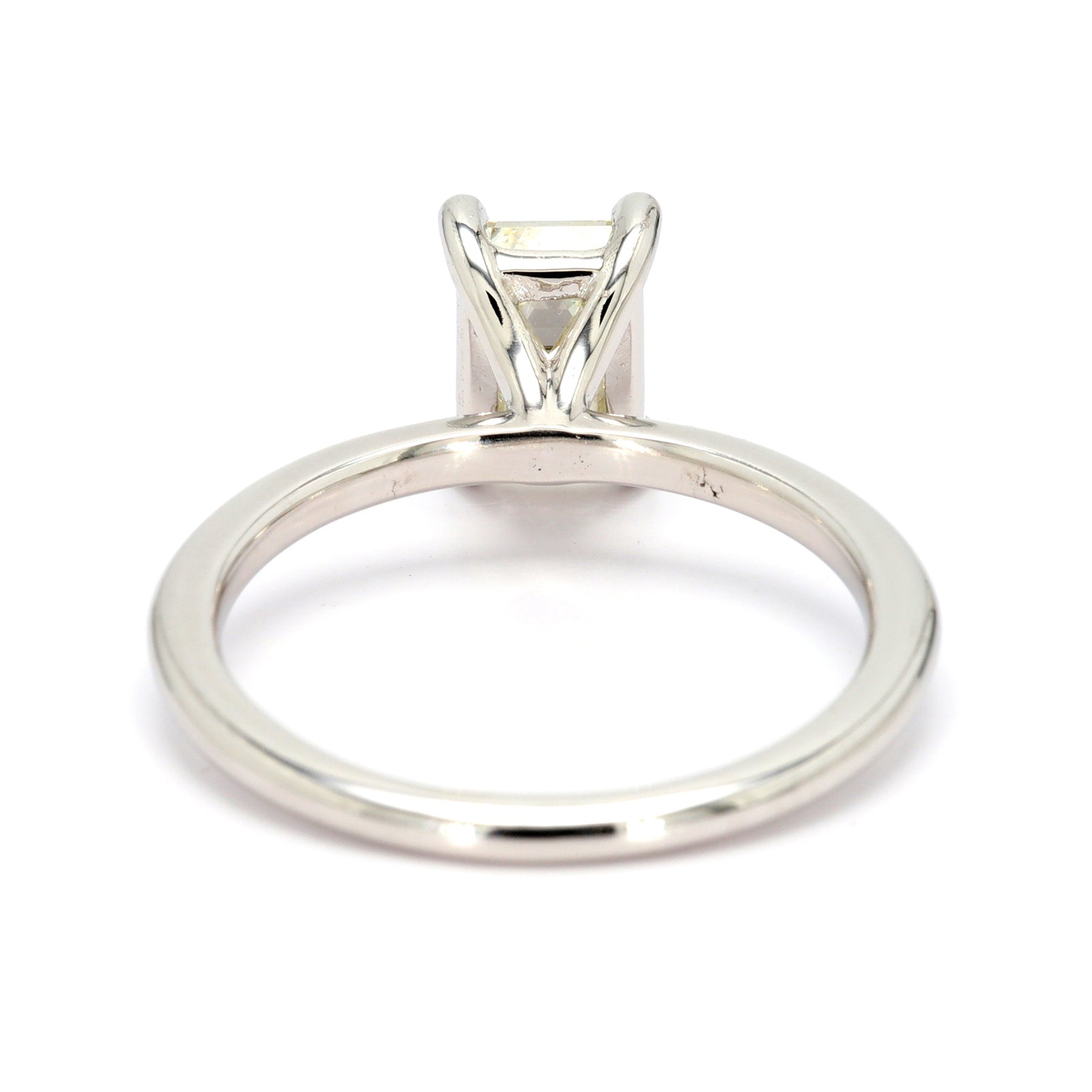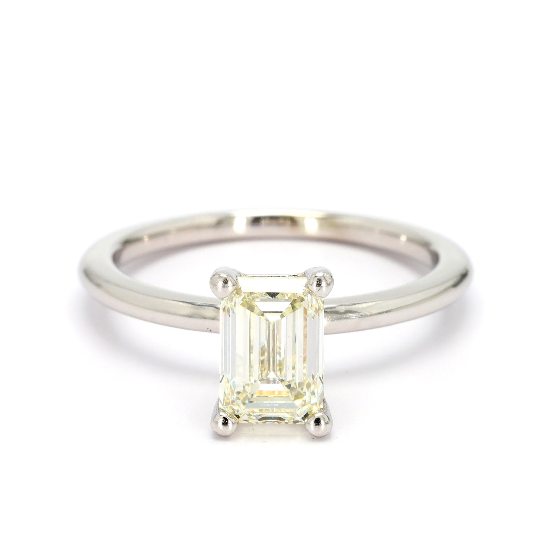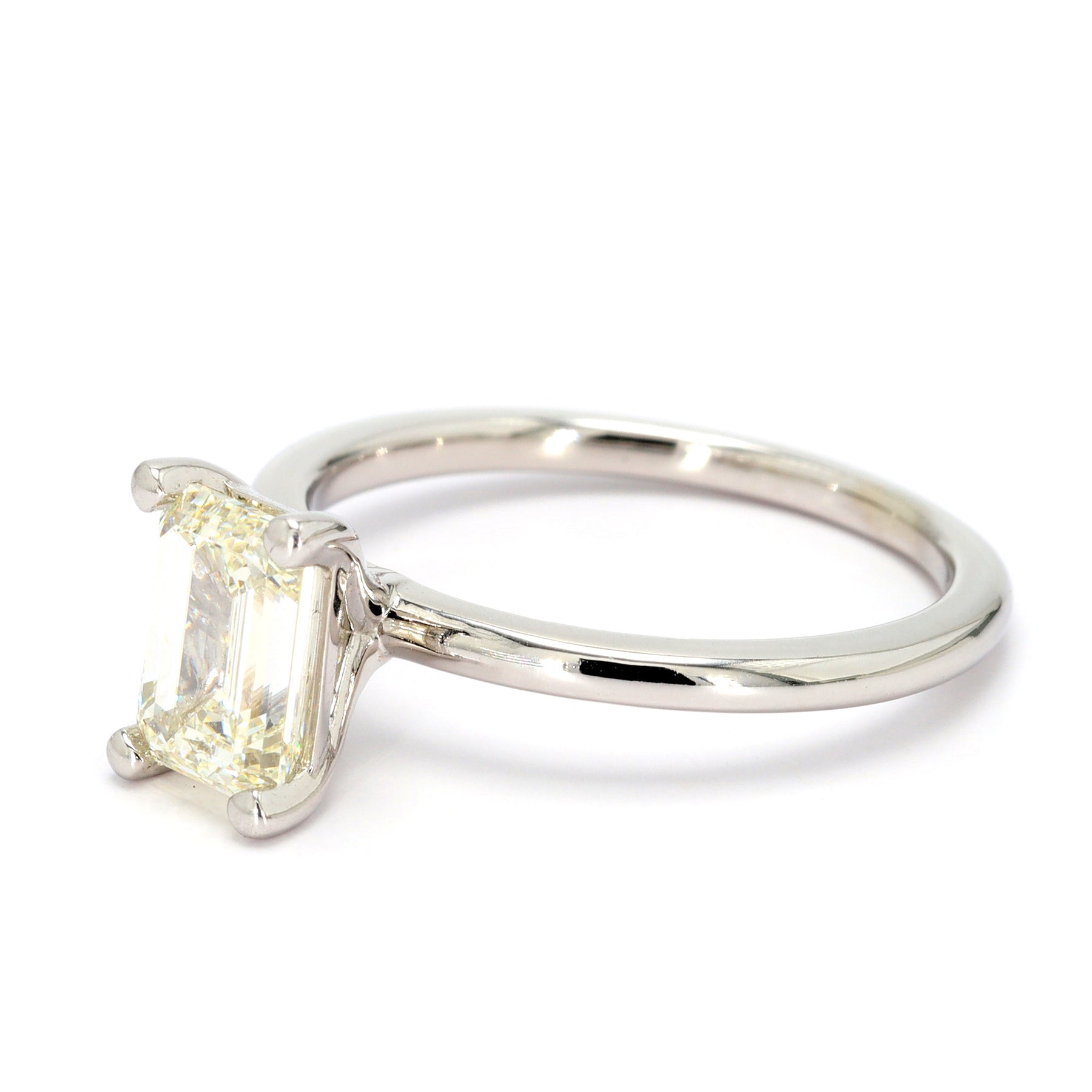 Solitaire engagement ring in 14-karat white gold featuring a 1.50 carat internally flawless emerald cut Diamond (GIA#6213381602).