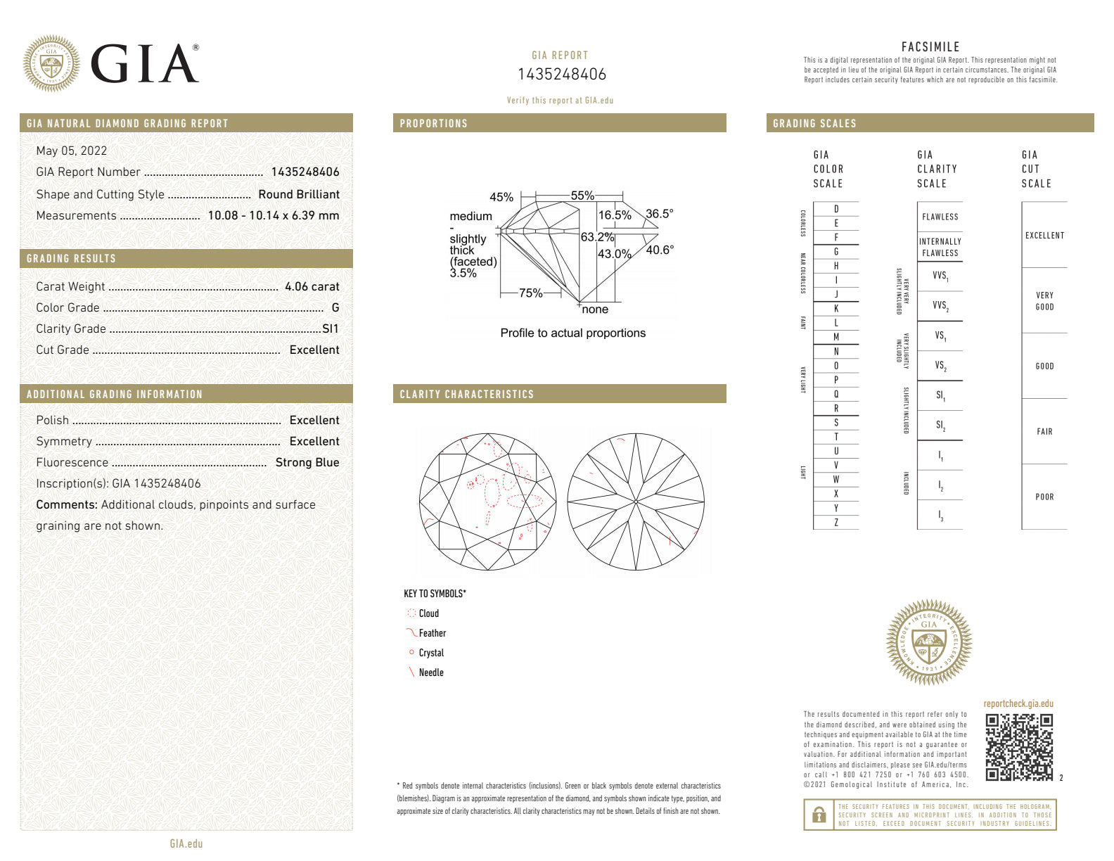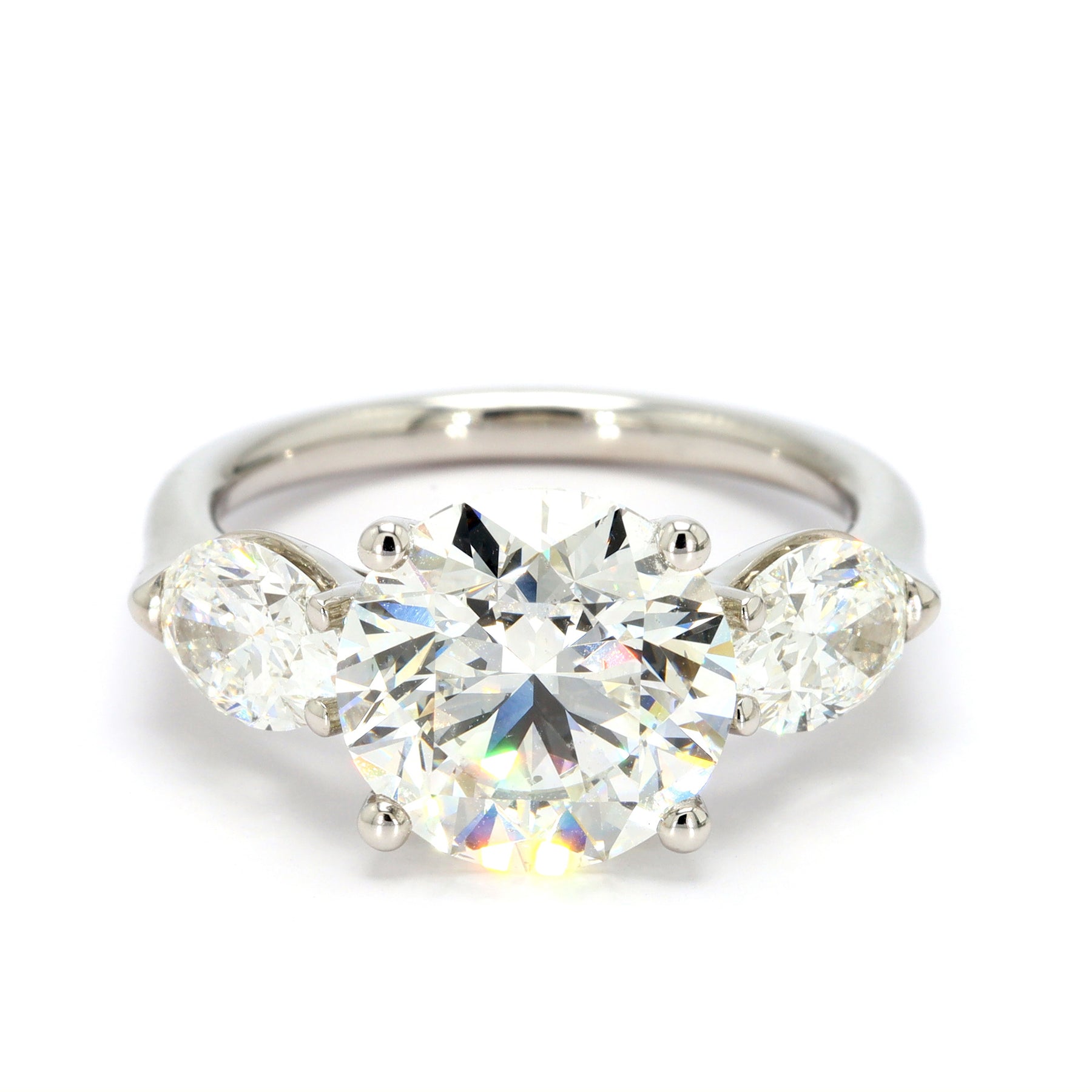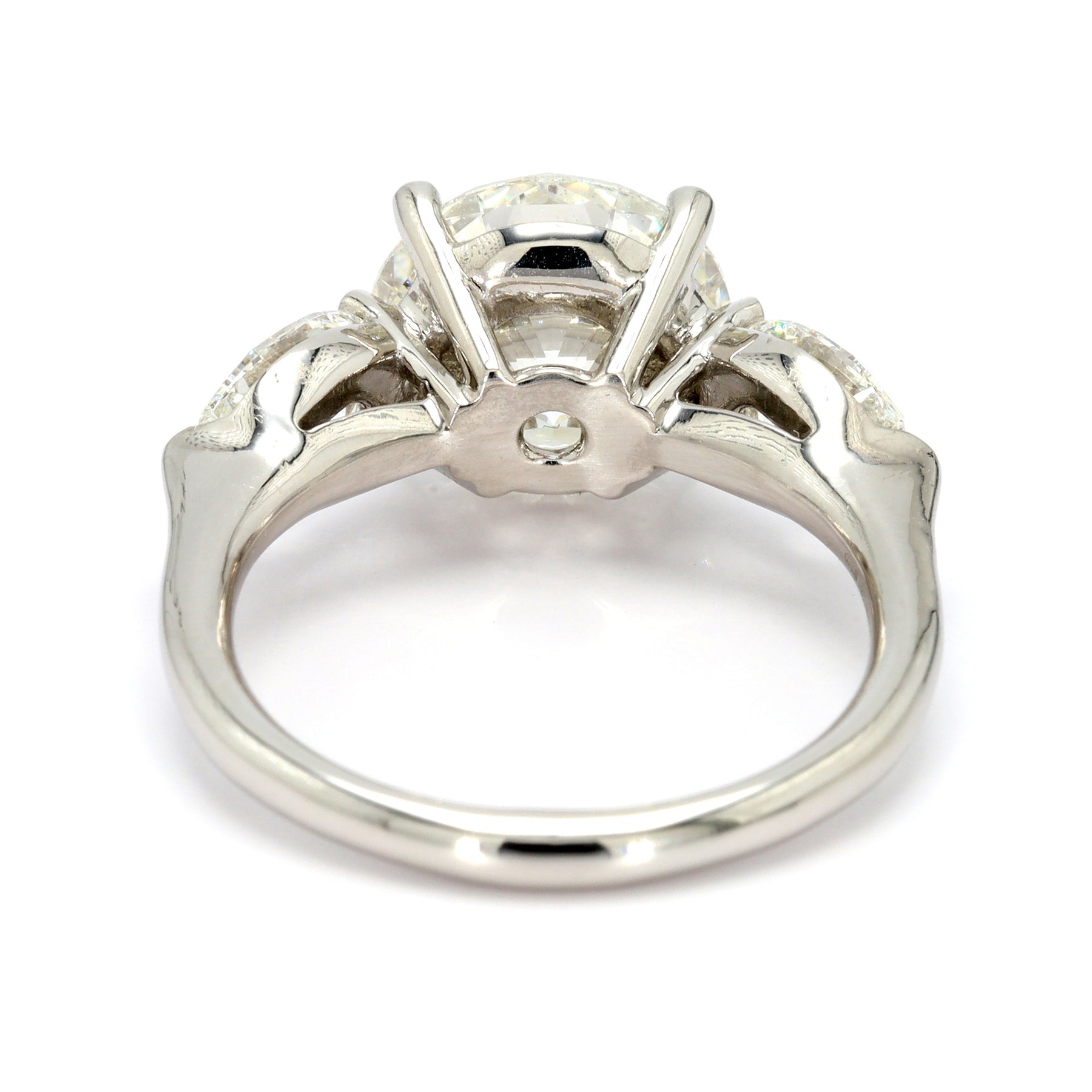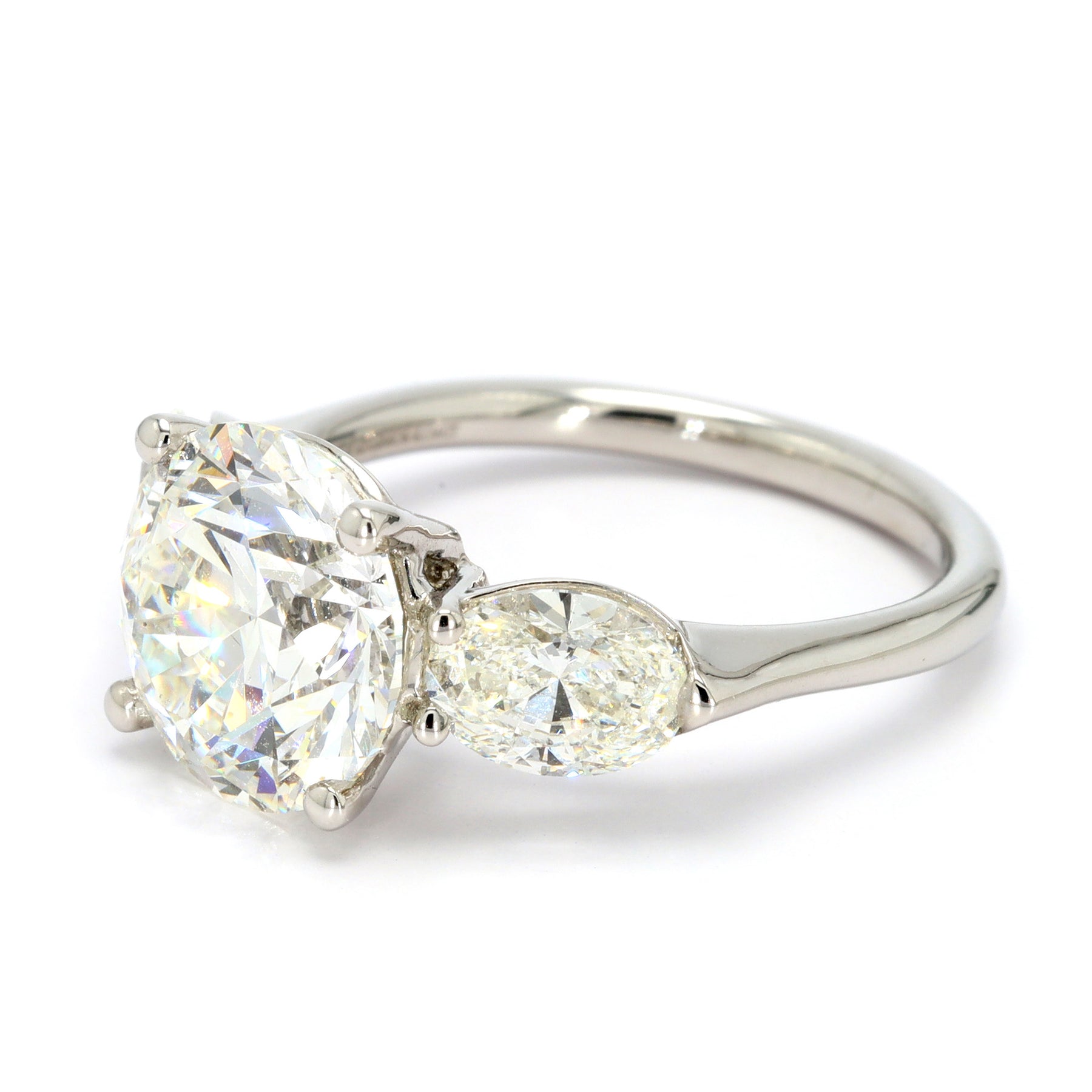 Three Stone Diamond Engagement Ring in Platinum, featuring a 4.06 carat round brilliant cut G SI1 Diamond (GIA#1435248406), accented with two oval cut H SI Diamond side stones totaling 1.36 carats.