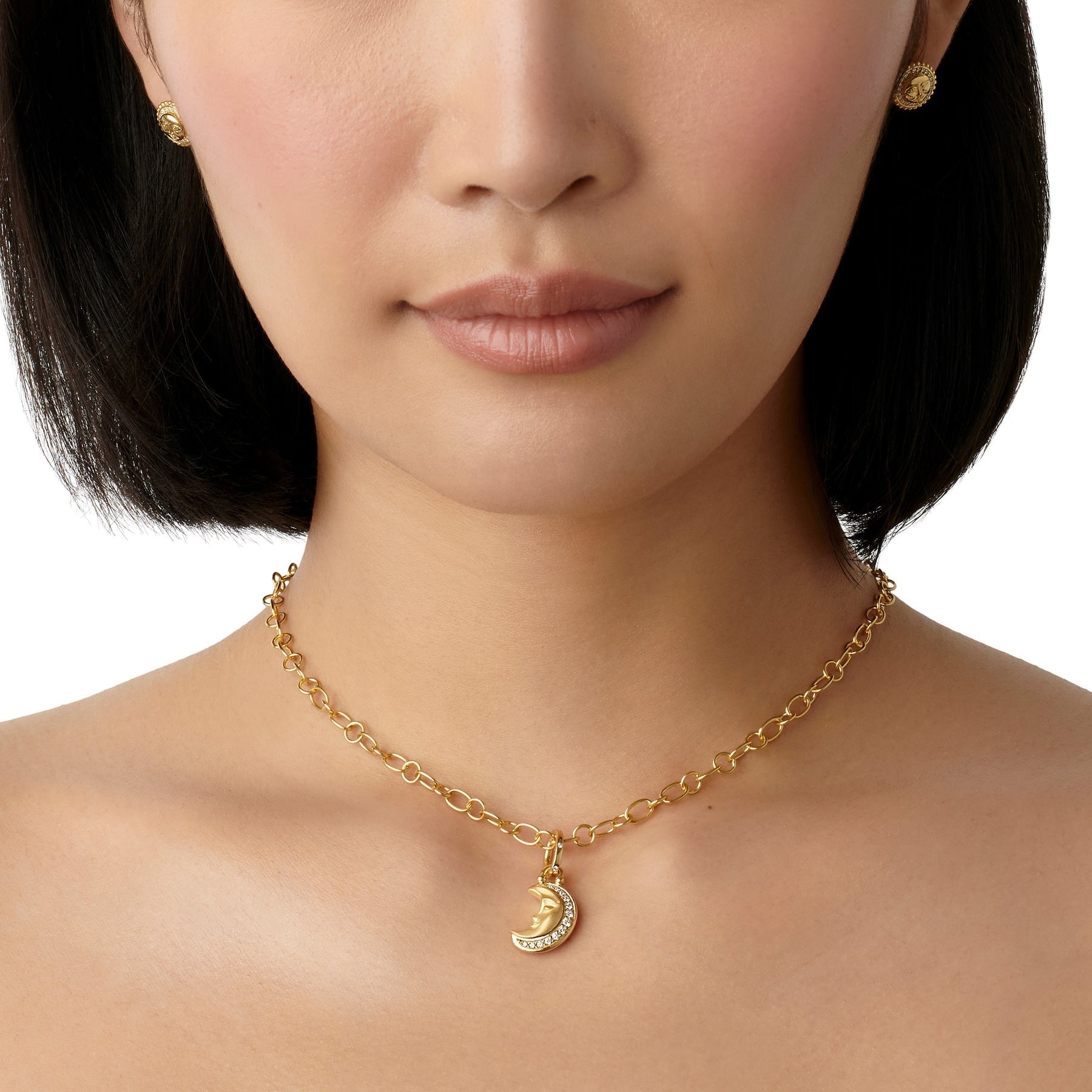 Crescent moon pendant in 18-karat yellow gold featuring 13 blue sapphires with a combined weight of 0.14 carats and 13 diamonds (G/H, VS) with a combined weight of 0.18 carats.