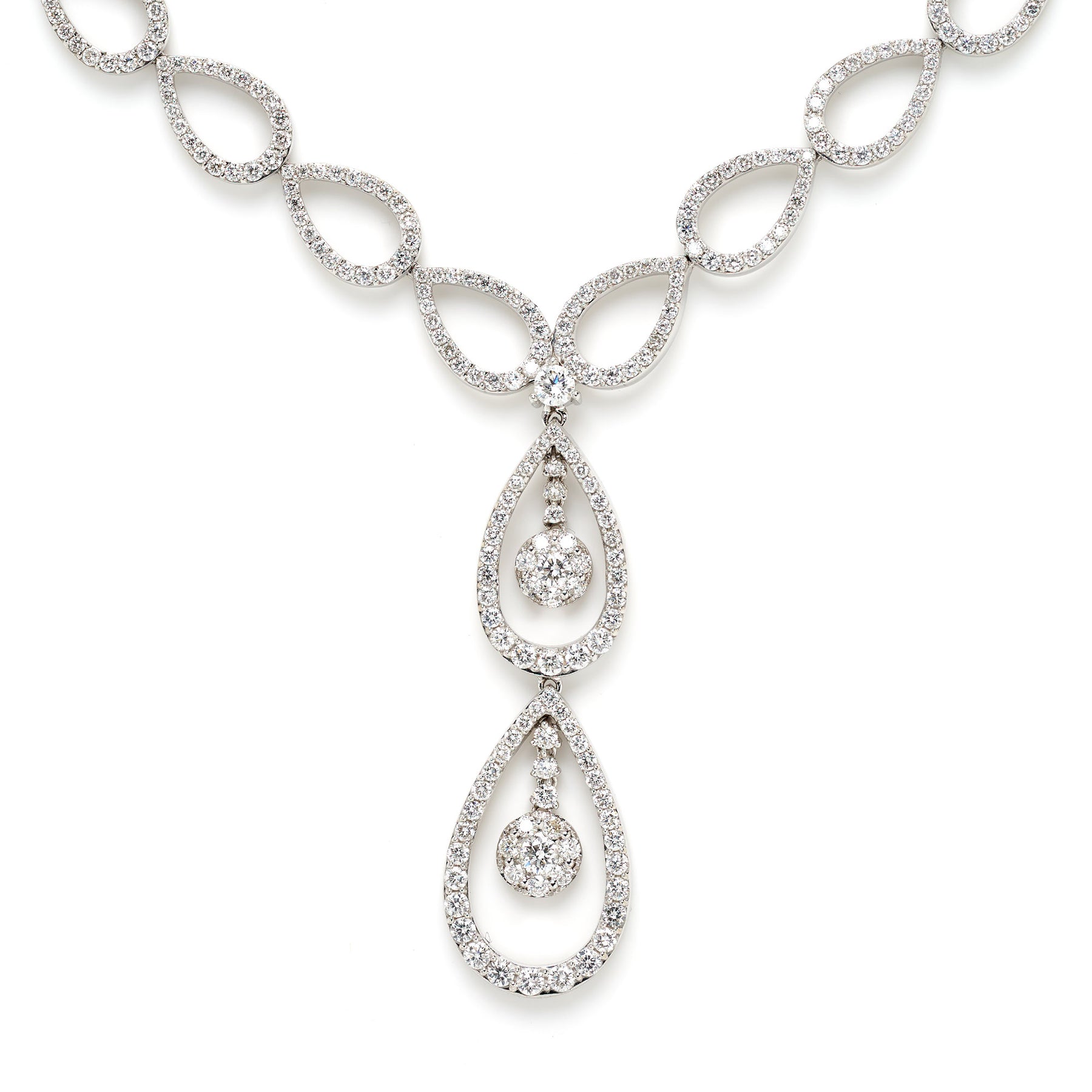 Fixed pendant drop necklace in 14-karat white gold, featuring three round brilliant cut Diamonds totaling approximately 0.23 carats , accented with 384 pavé-set diamonds totaling approximately 3.87 carats, with graduated pear-shaped links.