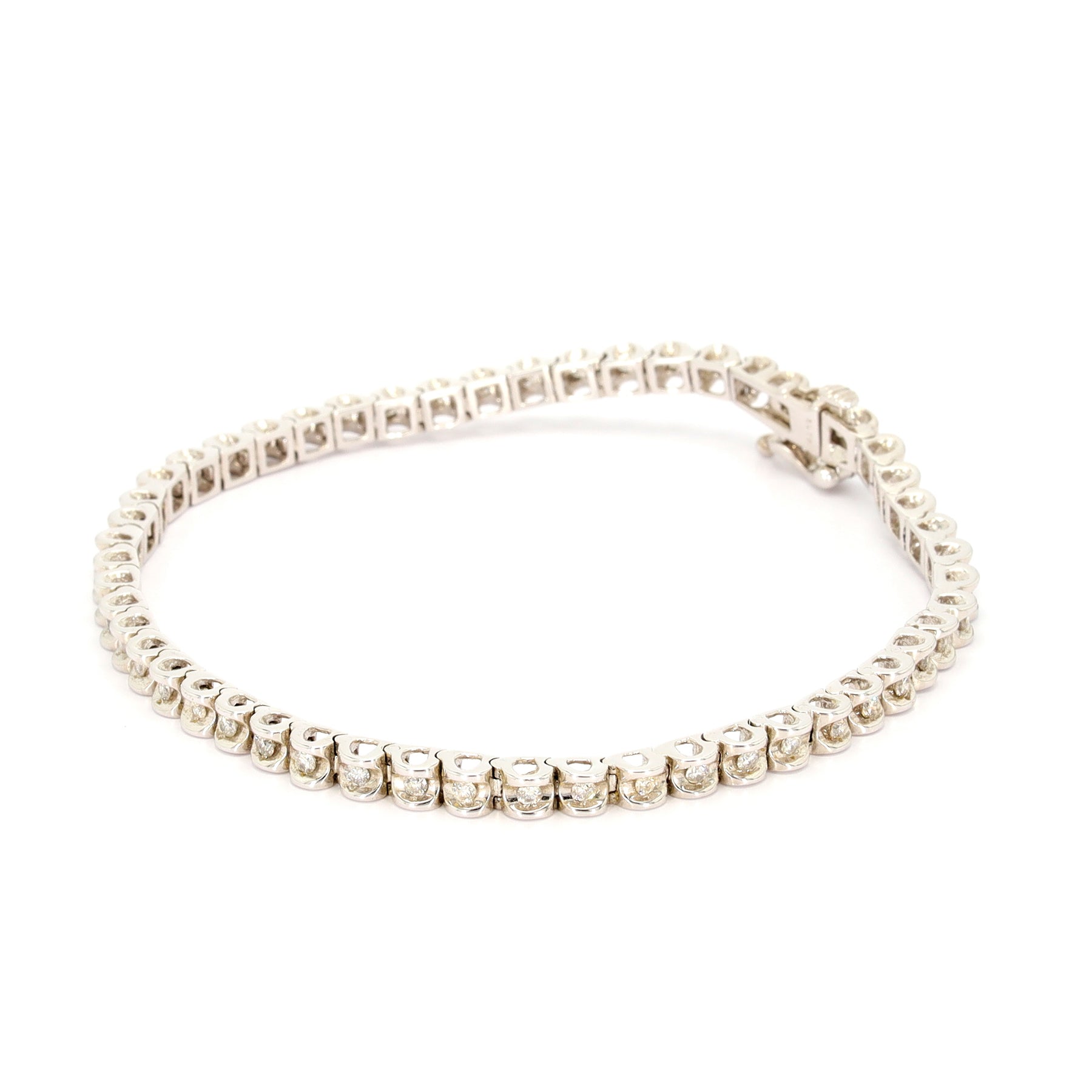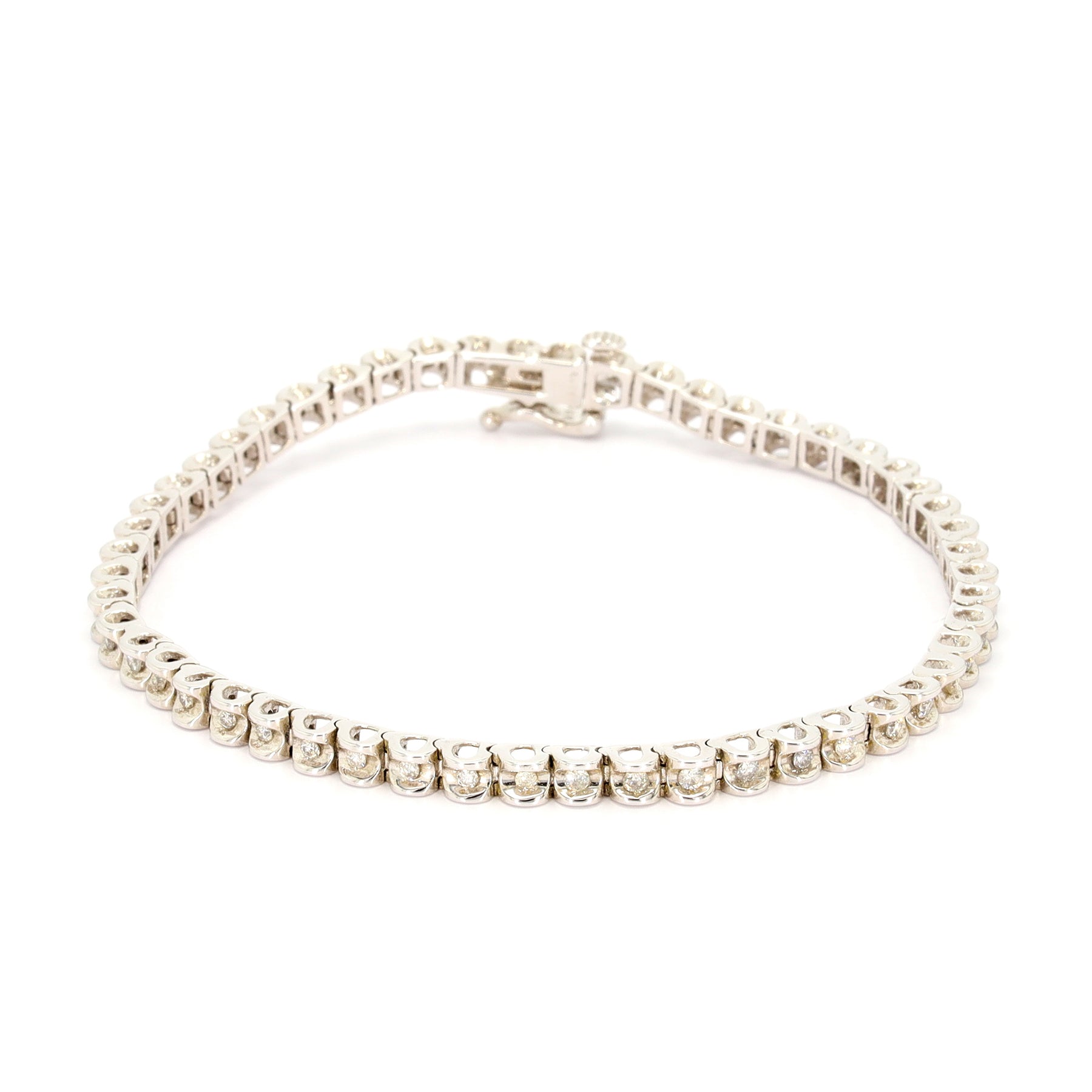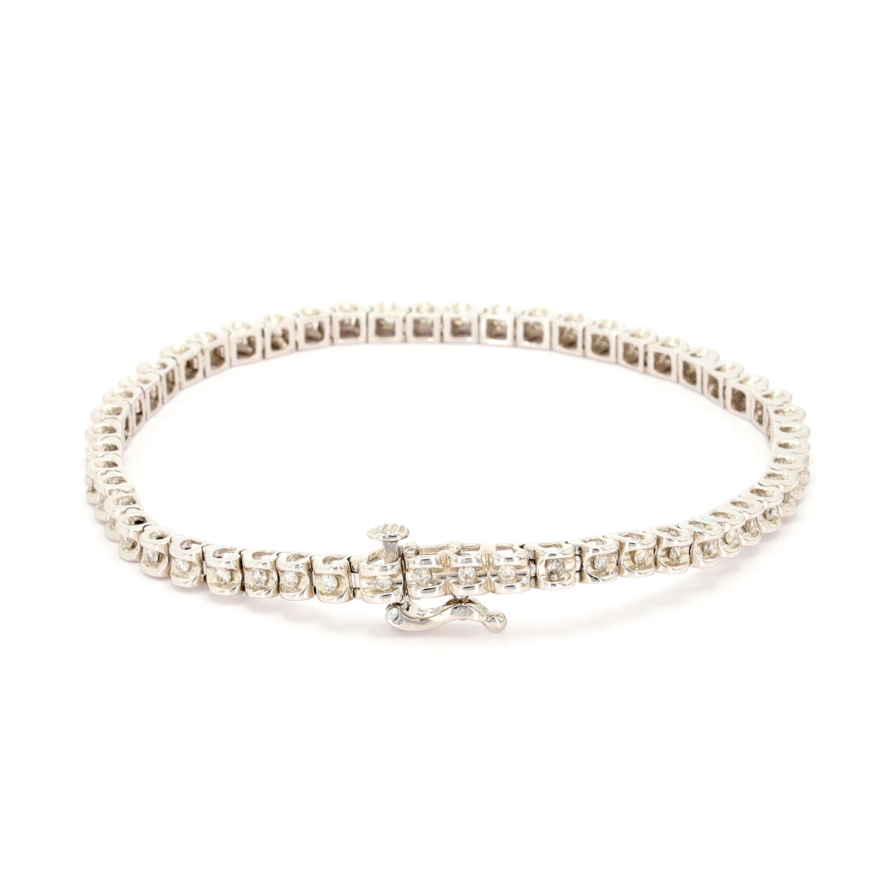 Tennis bracelet in 14-karat white gold featuring 52 diamonds with a combined weight of approximately 1.00 carat.