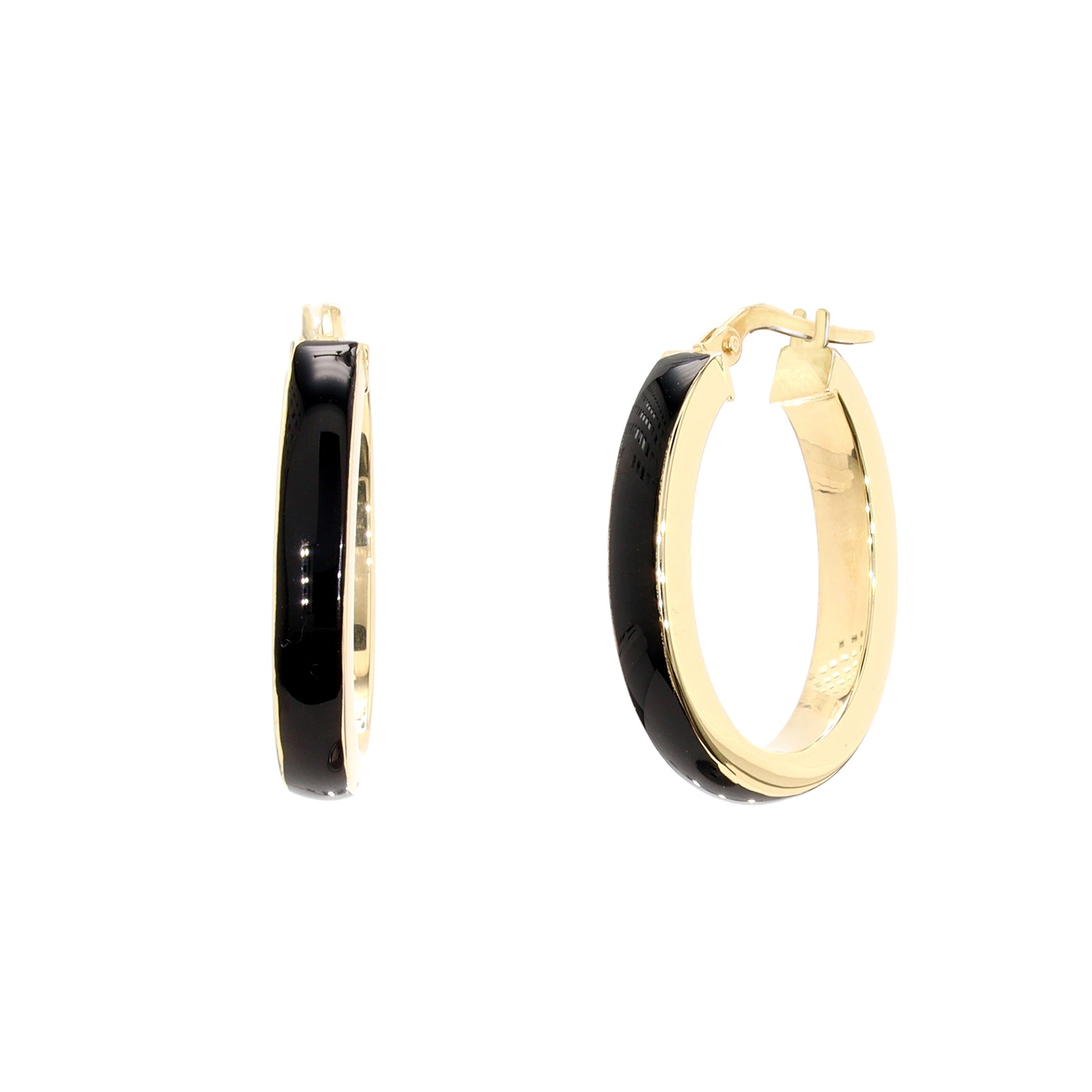 Oval hoop earrings in 14-karat yellow gold with black enamel.
