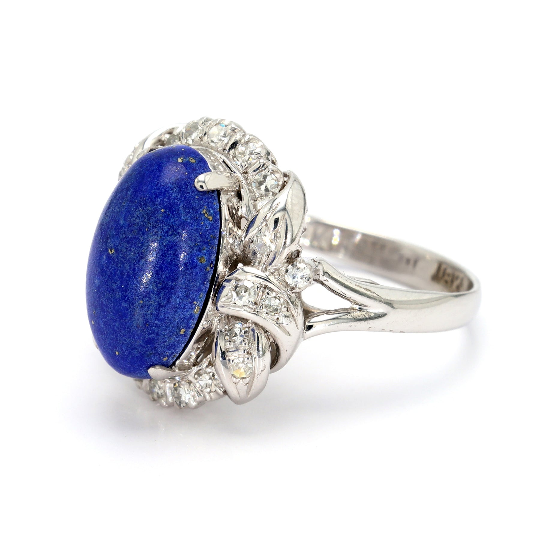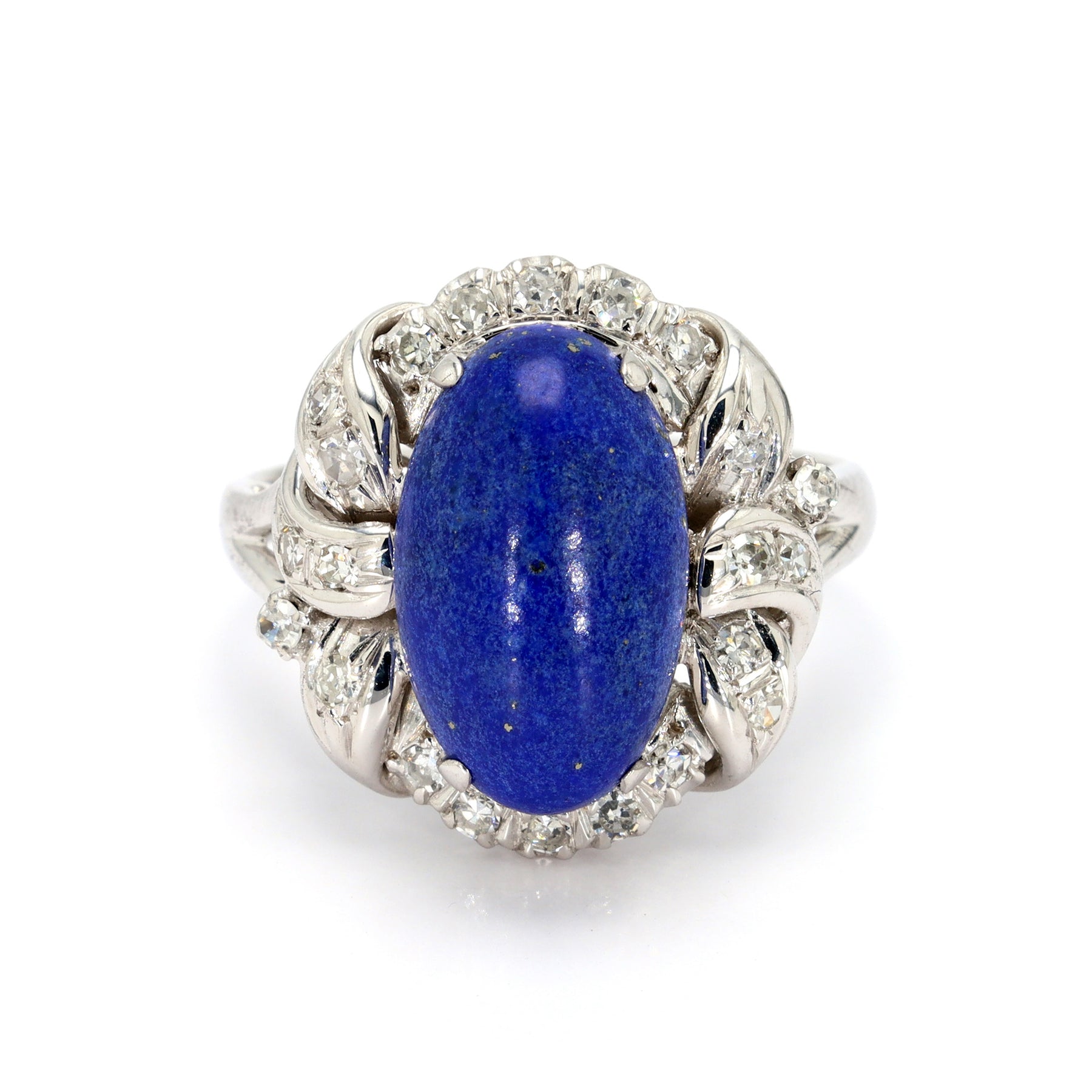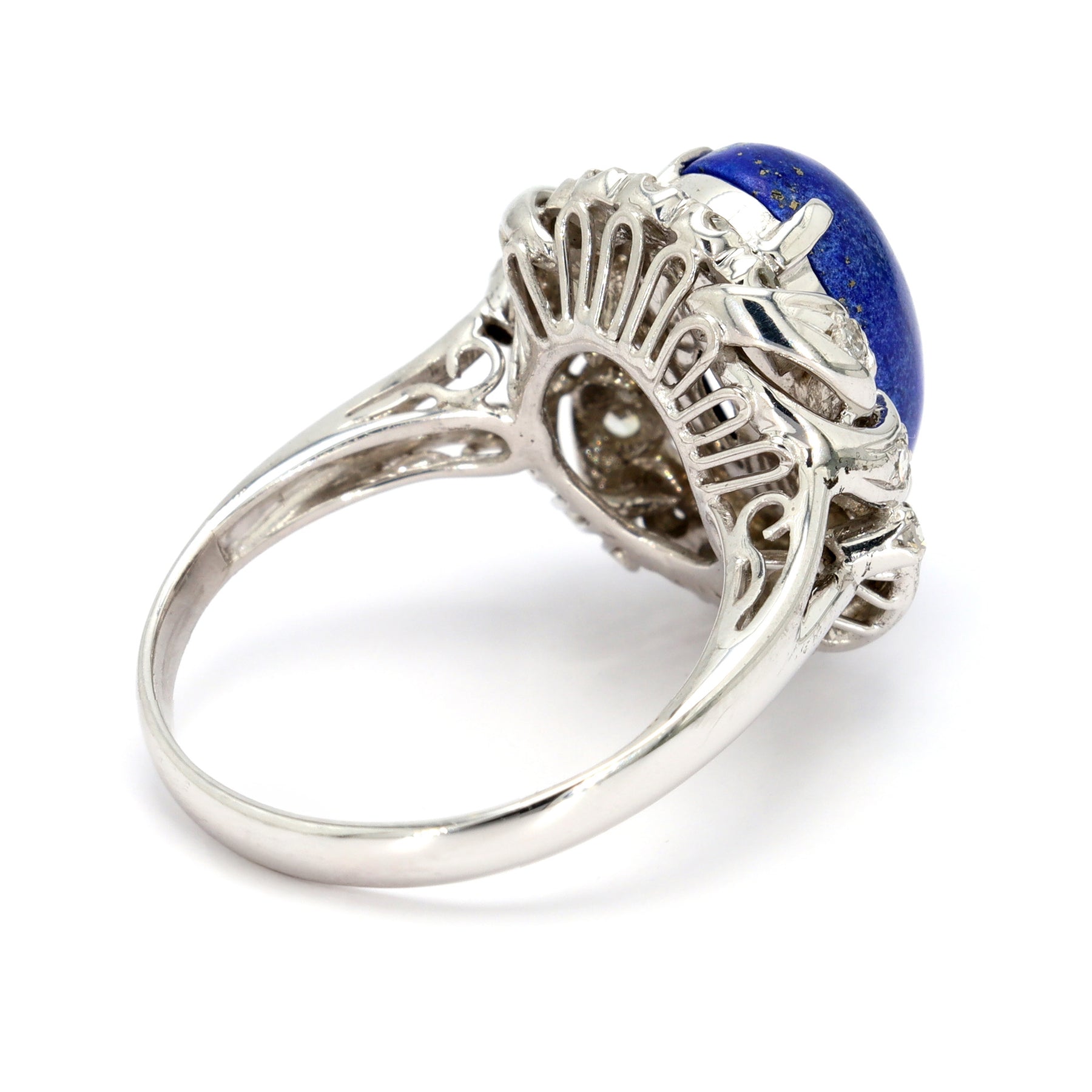Fashion ring in 18-karat white gold, featuring a 4.31 carat oval shaped Lapis cabochon and 22 diamonds with a combined weight of approximately 0.30 carats.