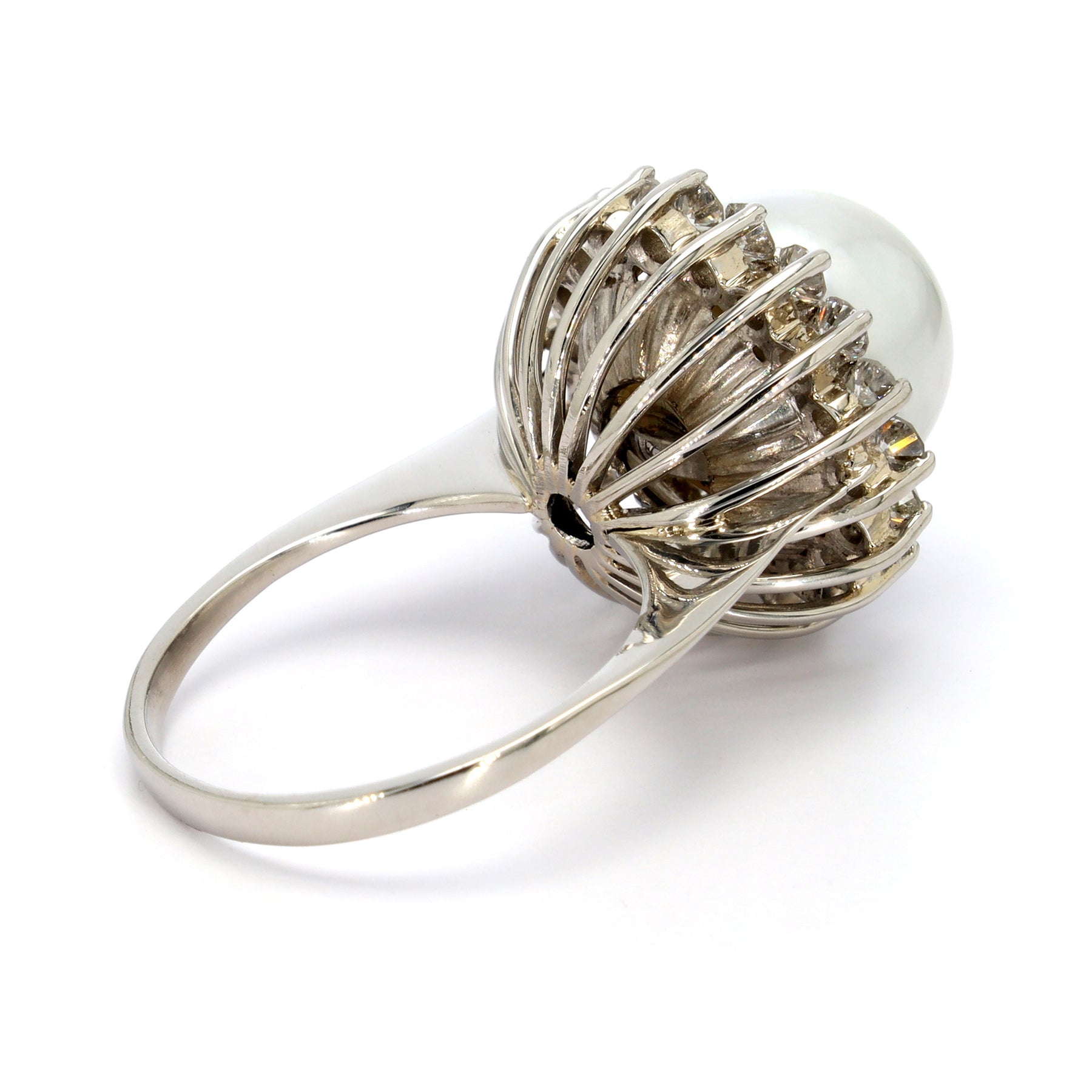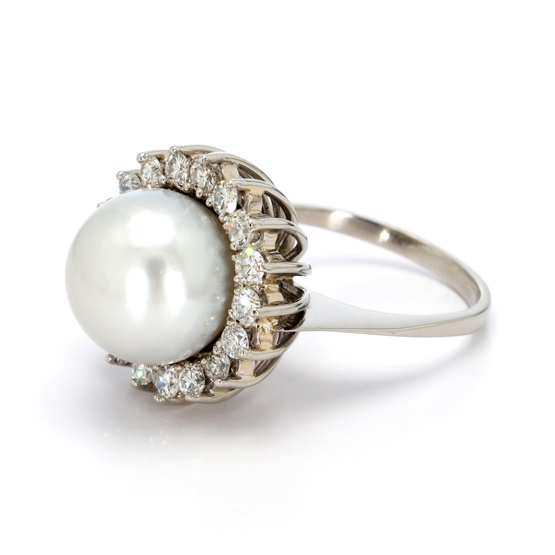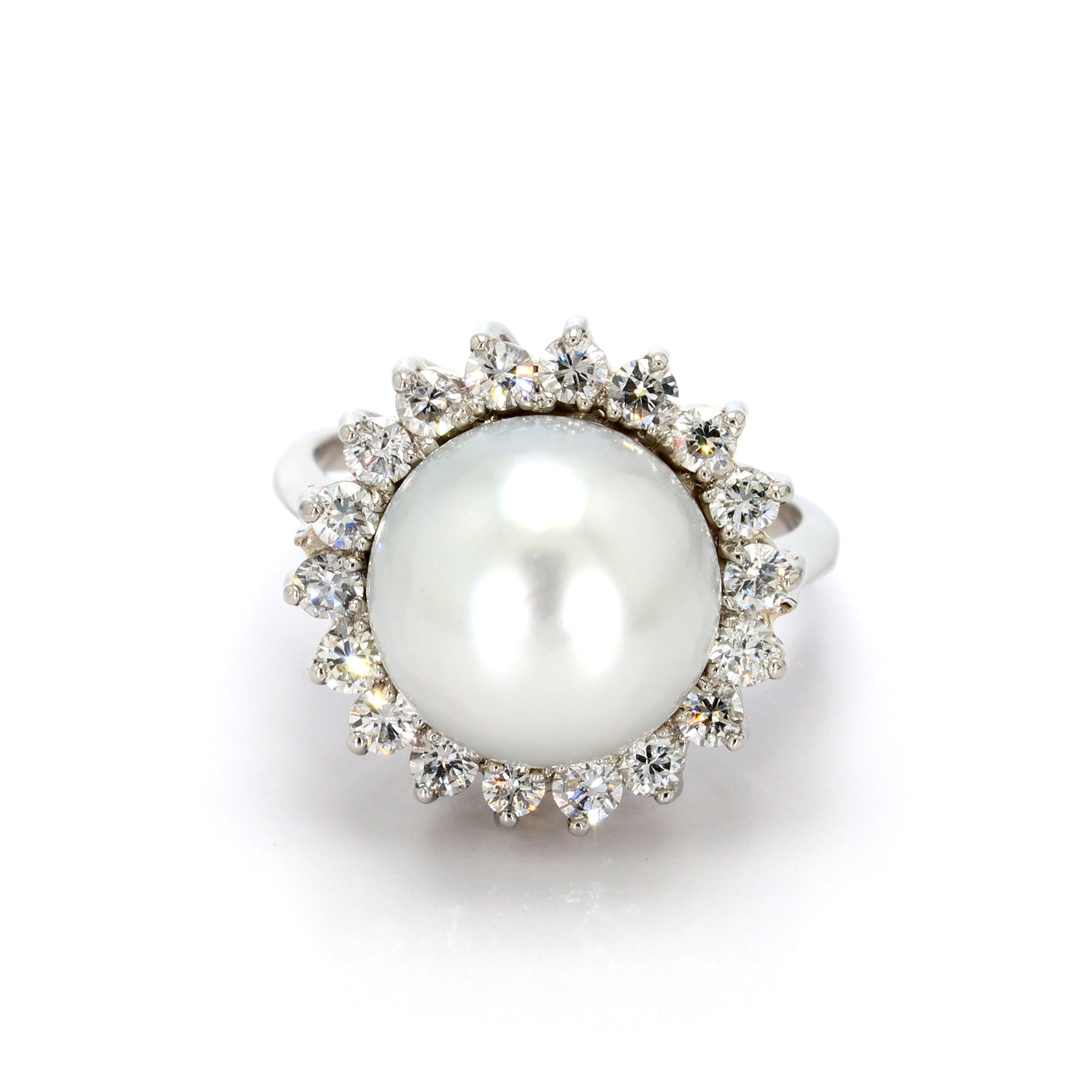 Halo ring in platinum featuring an 11.4mm white South Sea Pearl, accented with 18 Diamonds with a combined weight of approximately 0.80 carats (2 chipped).