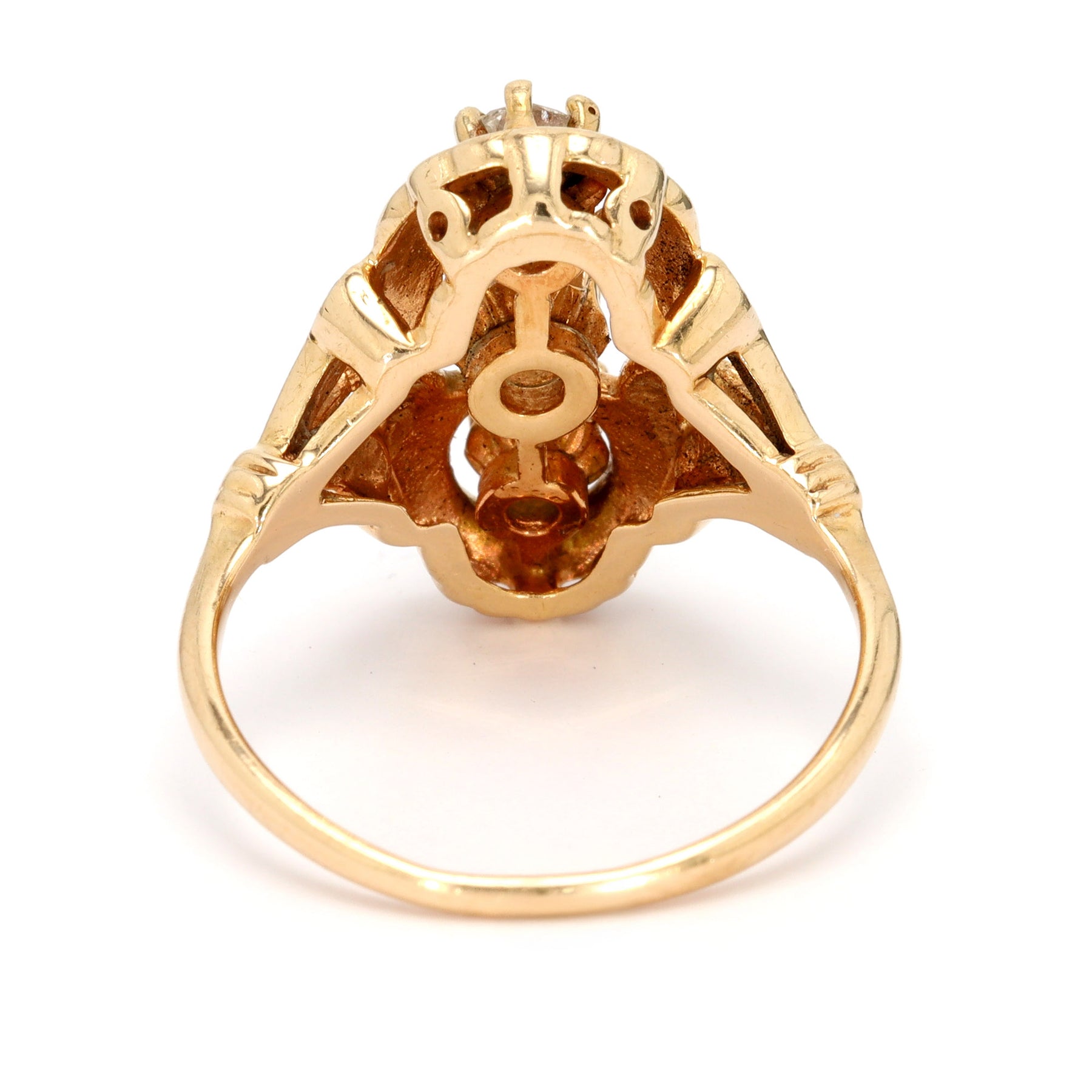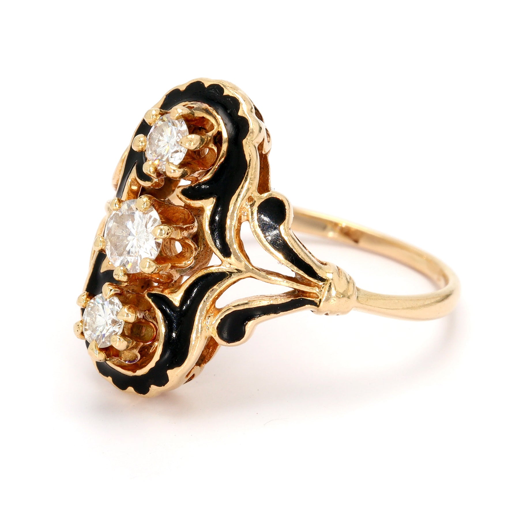 Victorian Revival fashion ring in 14-karat yellow gold with black enamel, featuring three round brilliant cut Diamonds totaling approximately 0.42 carats.