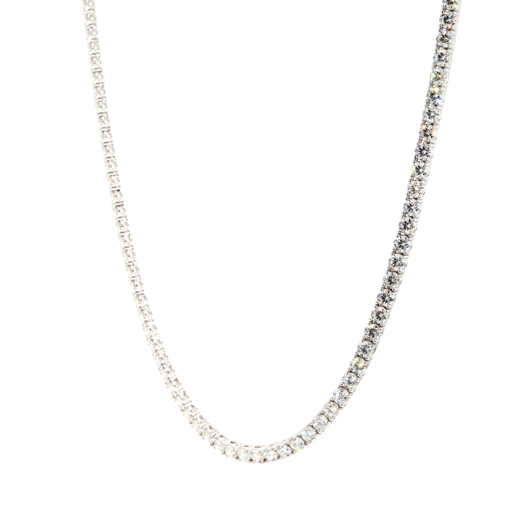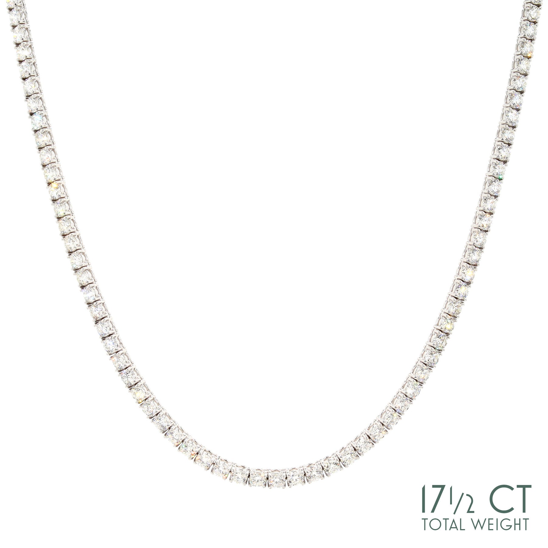 Tennis necklace measuring 18" in length in 14-karat white gold featuring 129 diamonds (F/G, SI1) with a combined weight of 17.51 carats.