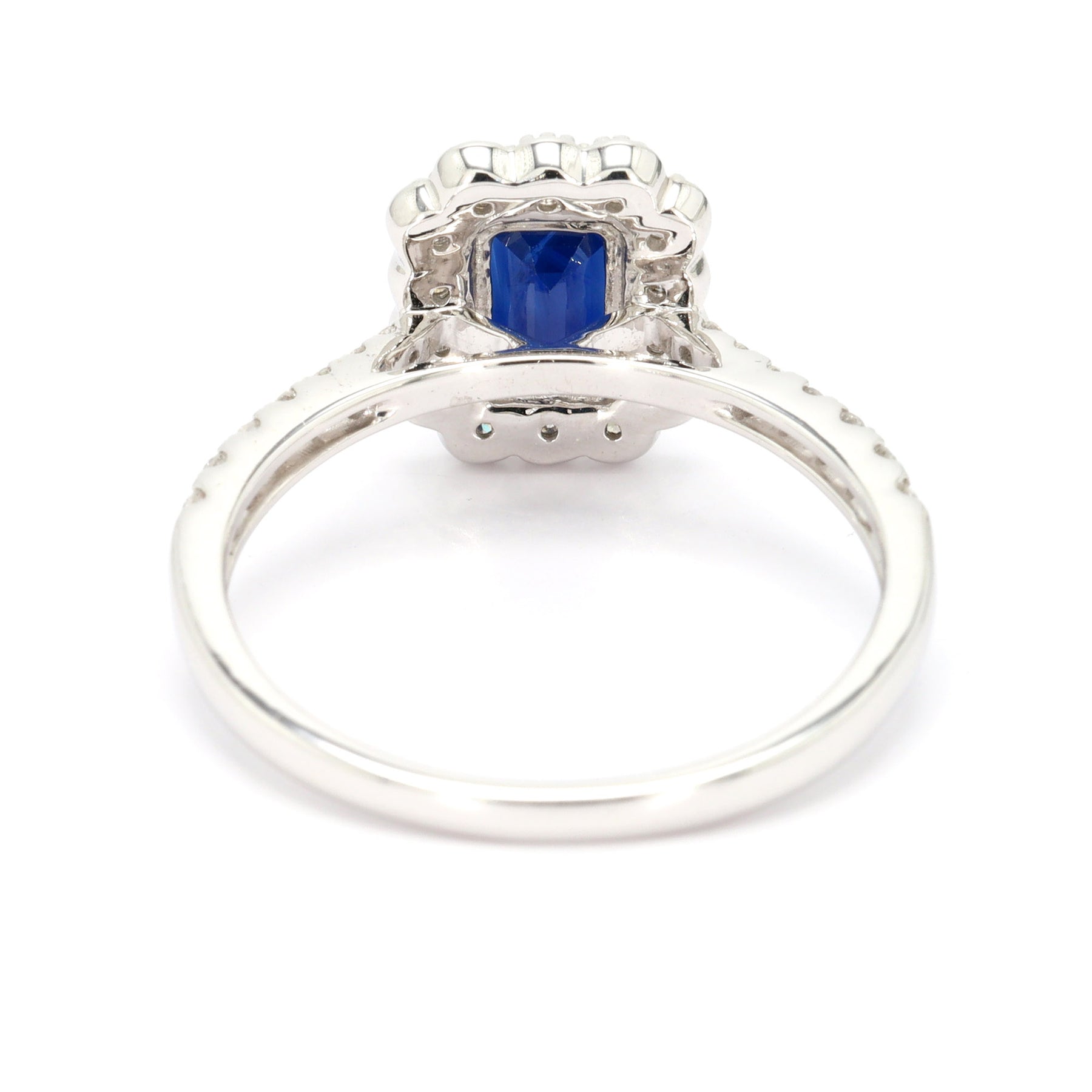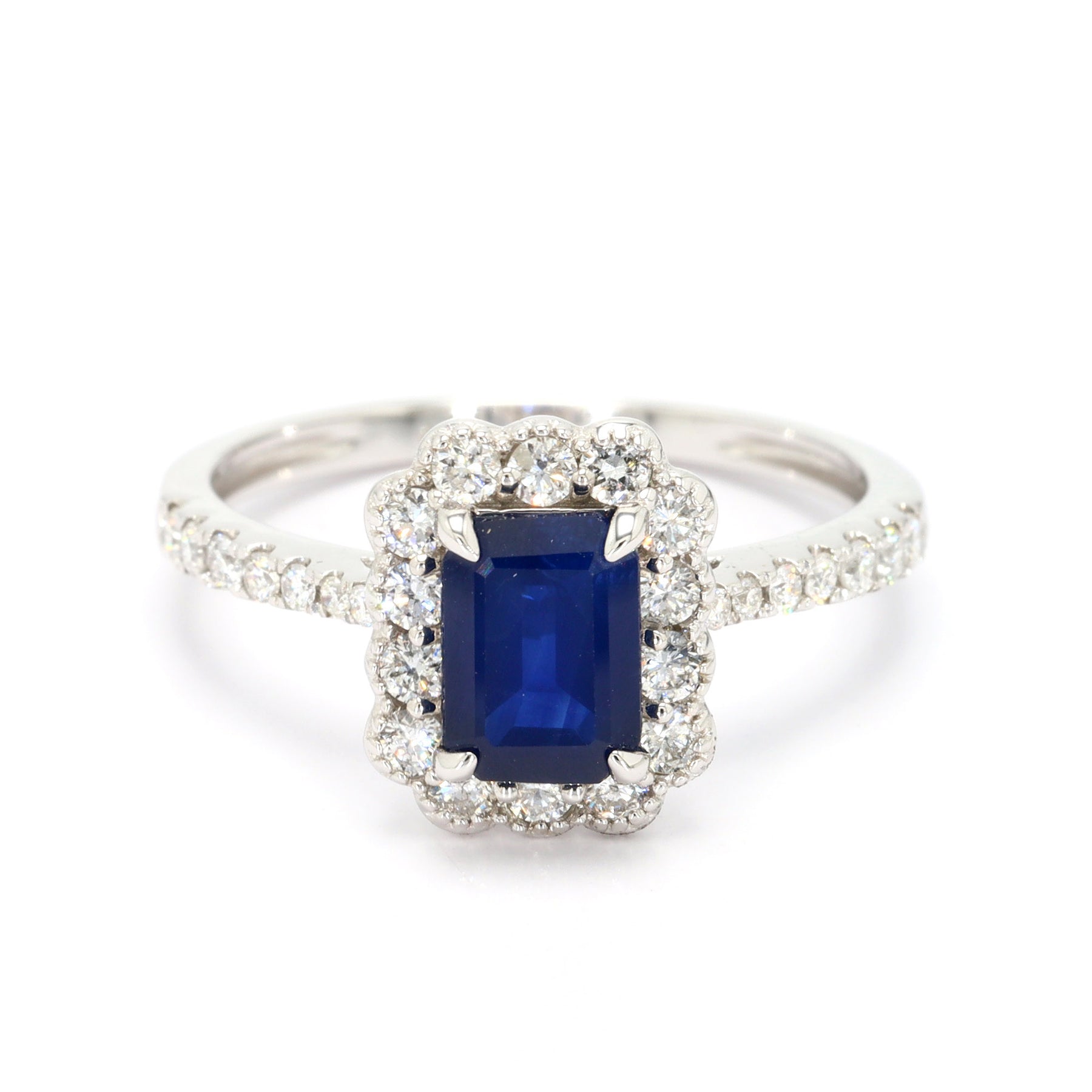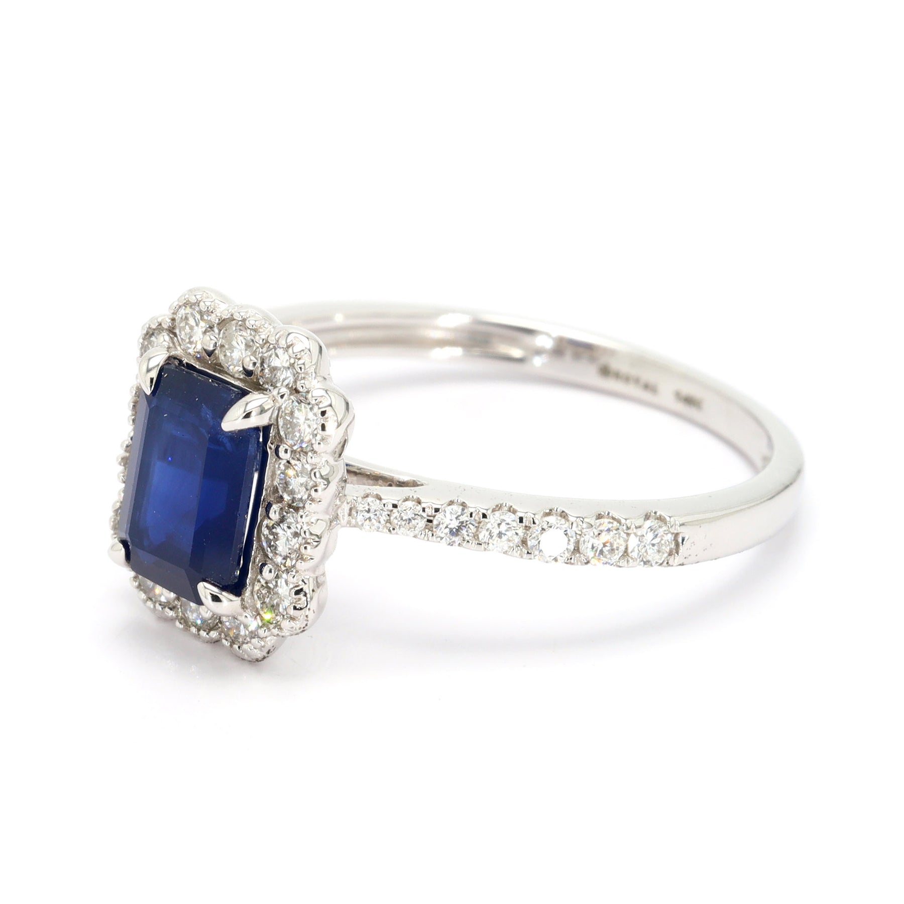 Sapphire halo ring in 14k white gold, featuring a 1.08 carat emerald cut blue Sapphire, accented with 28 round brilliant cut Diamonds totaling 0.48 carats.