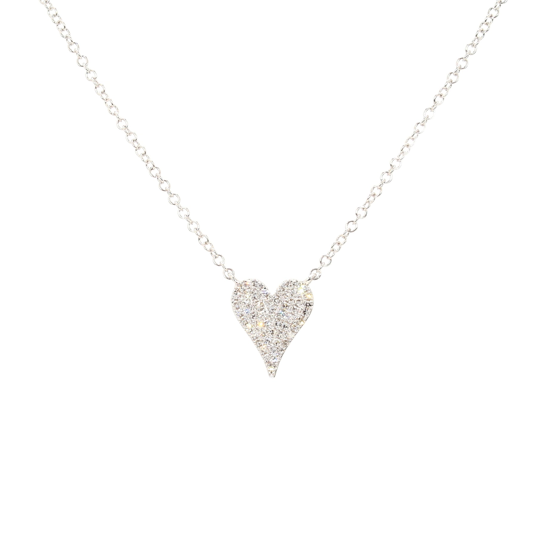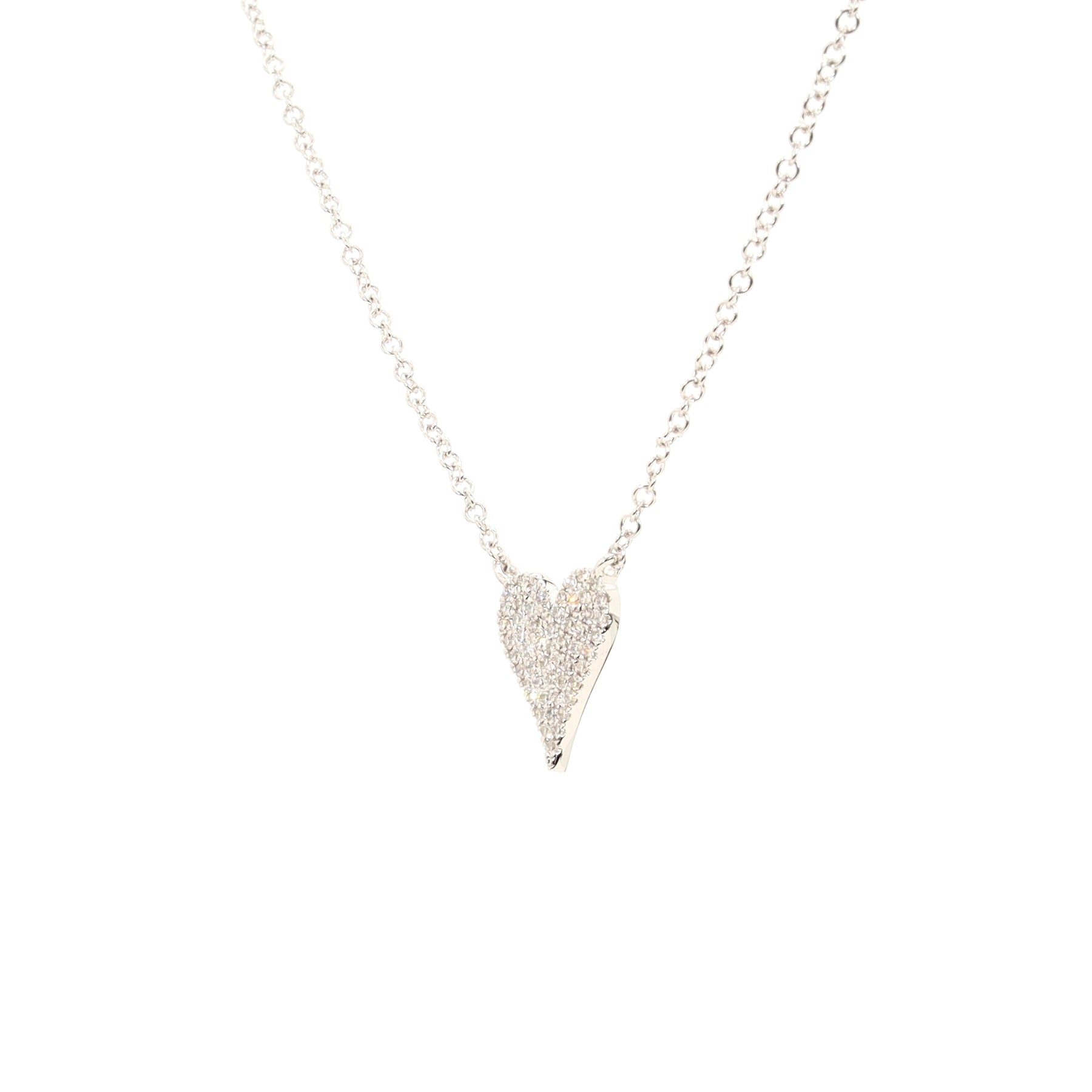 Fixed pendant heart necklace in 14-karat white gold, featuring 54 pavé diamonds (G/H SI) with a combined weight of 0.11 carats, on an adjustable 18 inch chain.