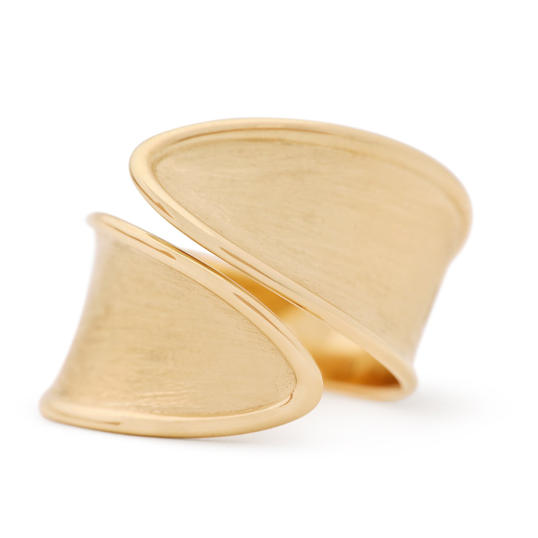 Artfully sculpted in 18K yellow gold, this open-wrap ring features flared, overlapping curves that contour gracefully around the finger. Its satin-brushed finish and hand-engraved texture capture light with fluid brilliance. A versatile and modern piece for everyday sophistication.