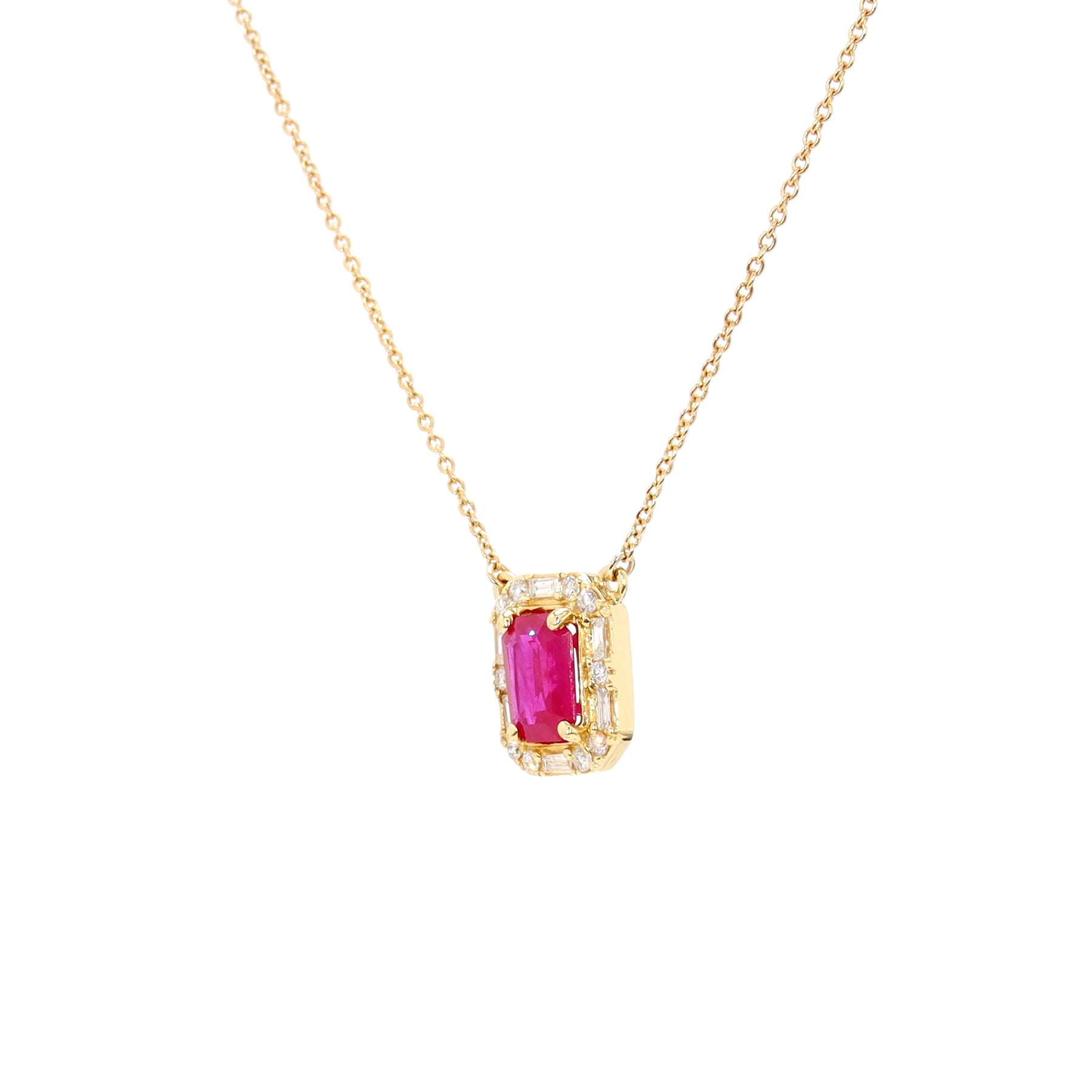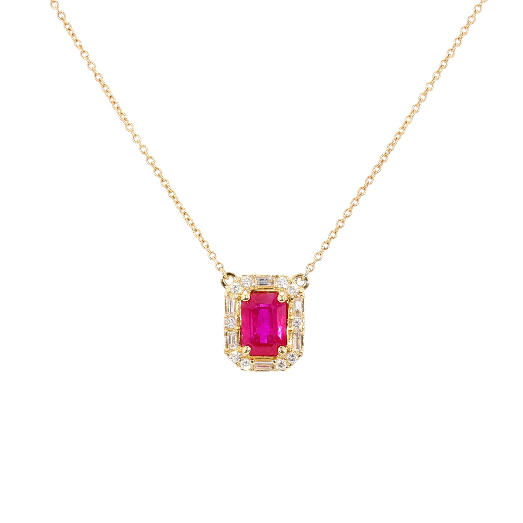 Fixed pendant necklace in 14k yellow gold, featuring a 1.10 carat emerald-cut Ruby, accented with 16 baguette and round brilliant cut Diamonds totaling 0.19 carats, on an 18 inch chain.