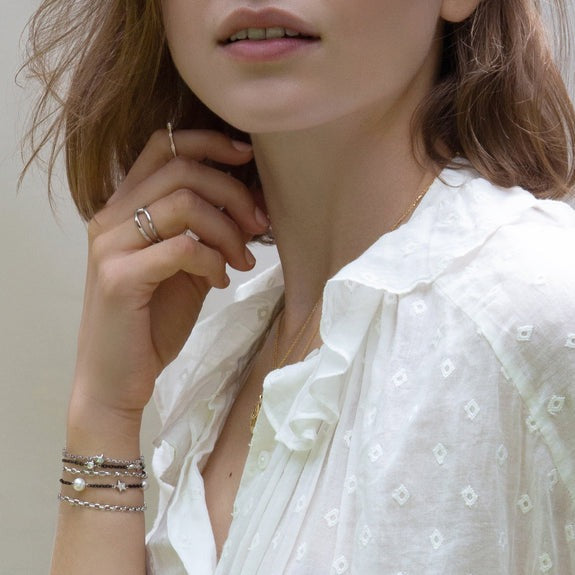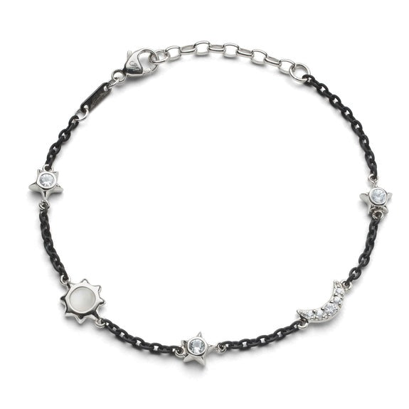 Strands of suns, moons and stars on chains with moonstones and white sapphires to combine with all your favorite bracelets. Layer on to add to your wrist story. Steel and Sterling Silver Bracelet is 7inches in length and has 0.4cts Moonstone and 0.303ct White Sapphire