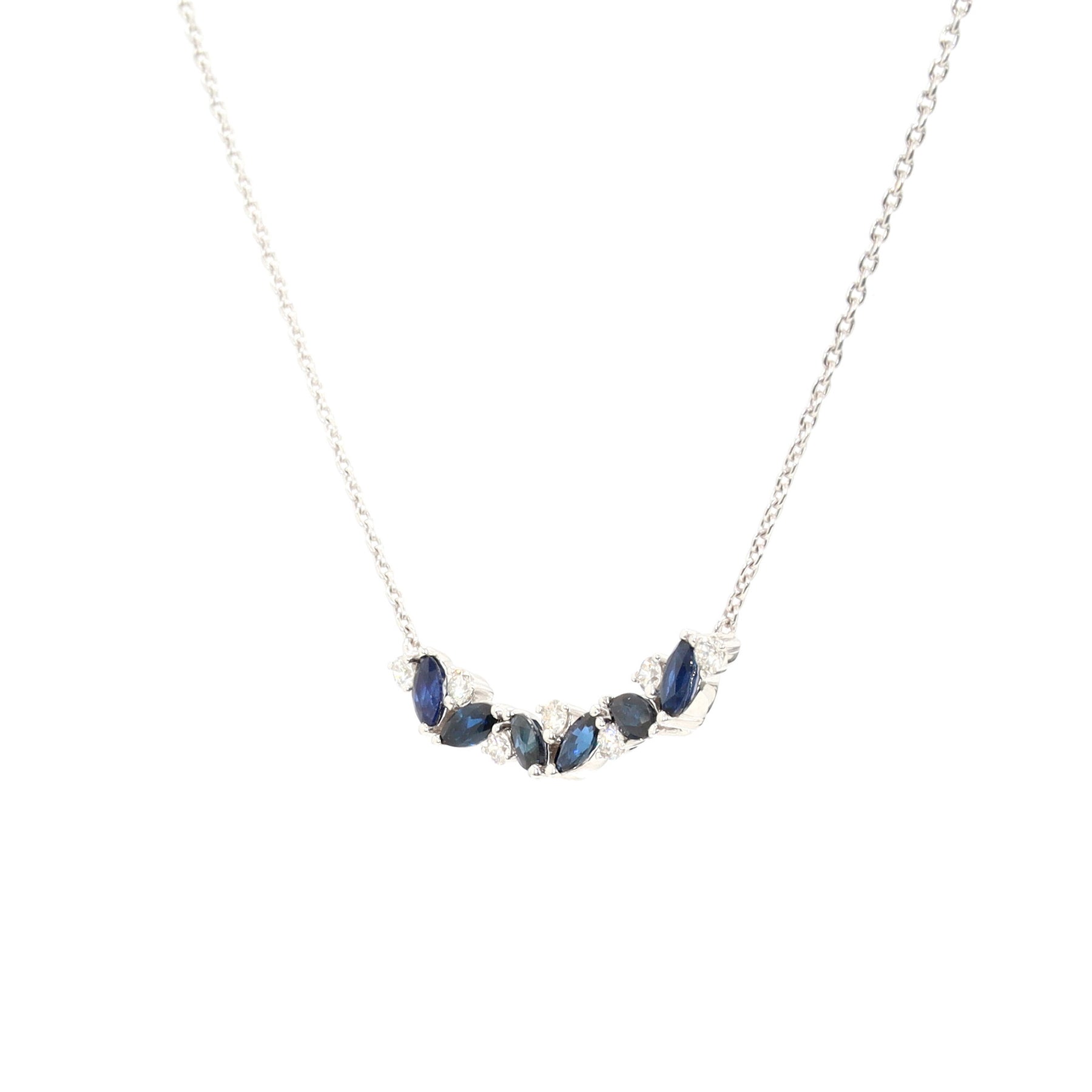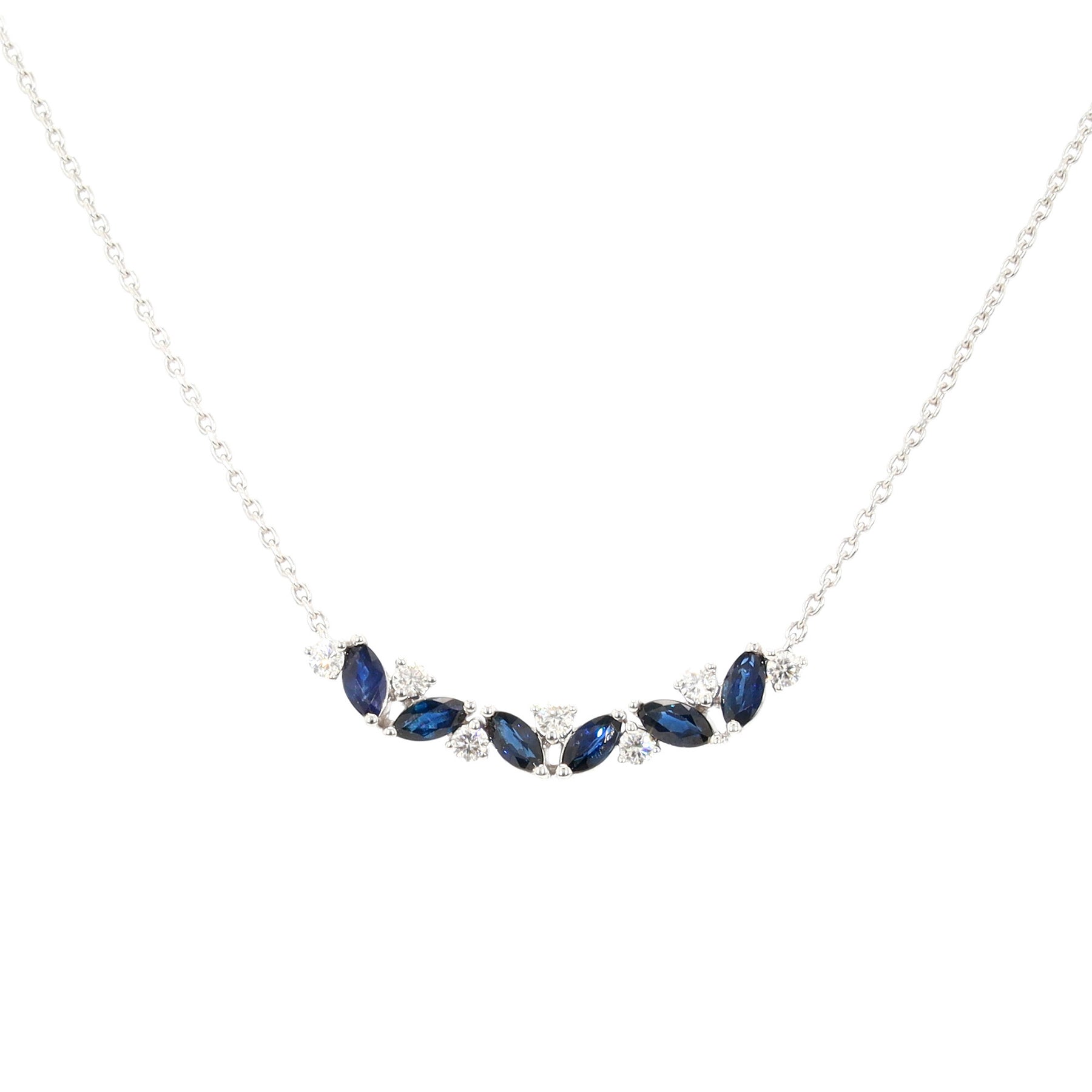 Fixed pendant necklace measuring 18" in length in 14-karat white gold featuring 6 marquise-cut blue sapphires with a combined weight of approximately 0.15 carats and 7 diamonds (I-J, I1) with a combined weight of 0.15ct.