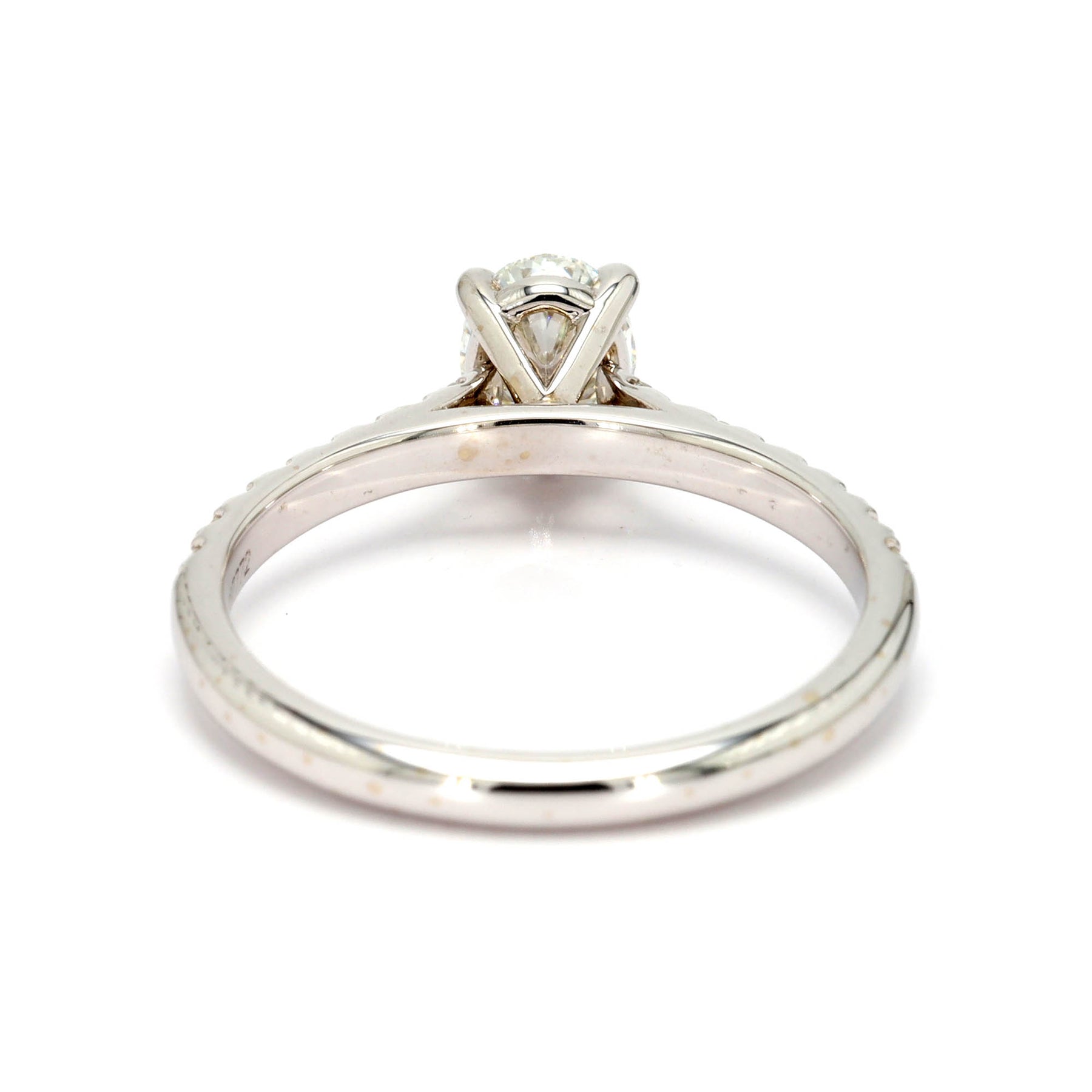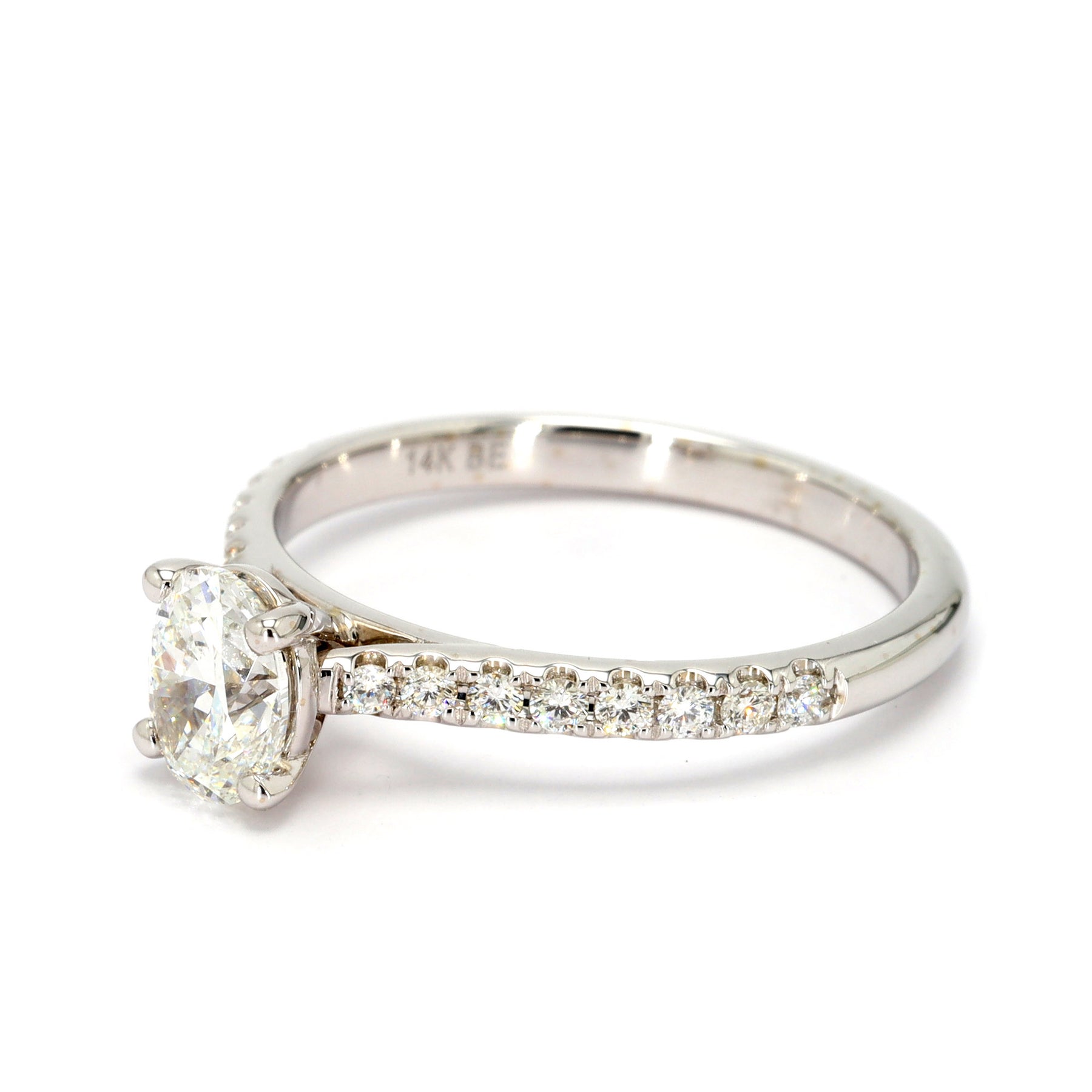 Engagement ring in 14-karat white gold, featuring a 0.70 carat oval cut Diamond, accented with 16 round brilliant cut Diamonds totaling 0.25 carats.
