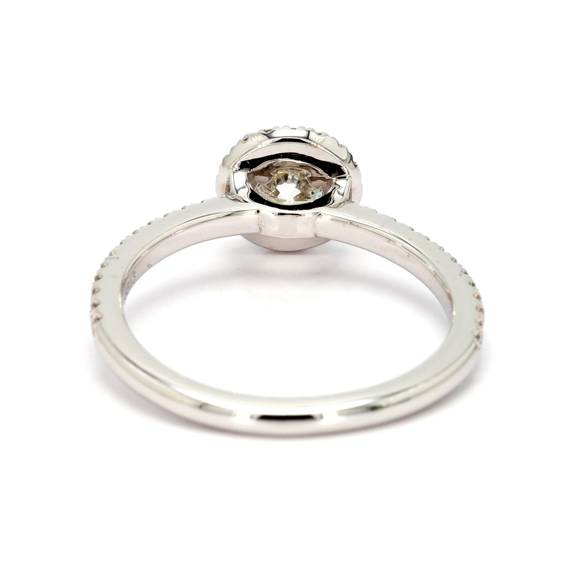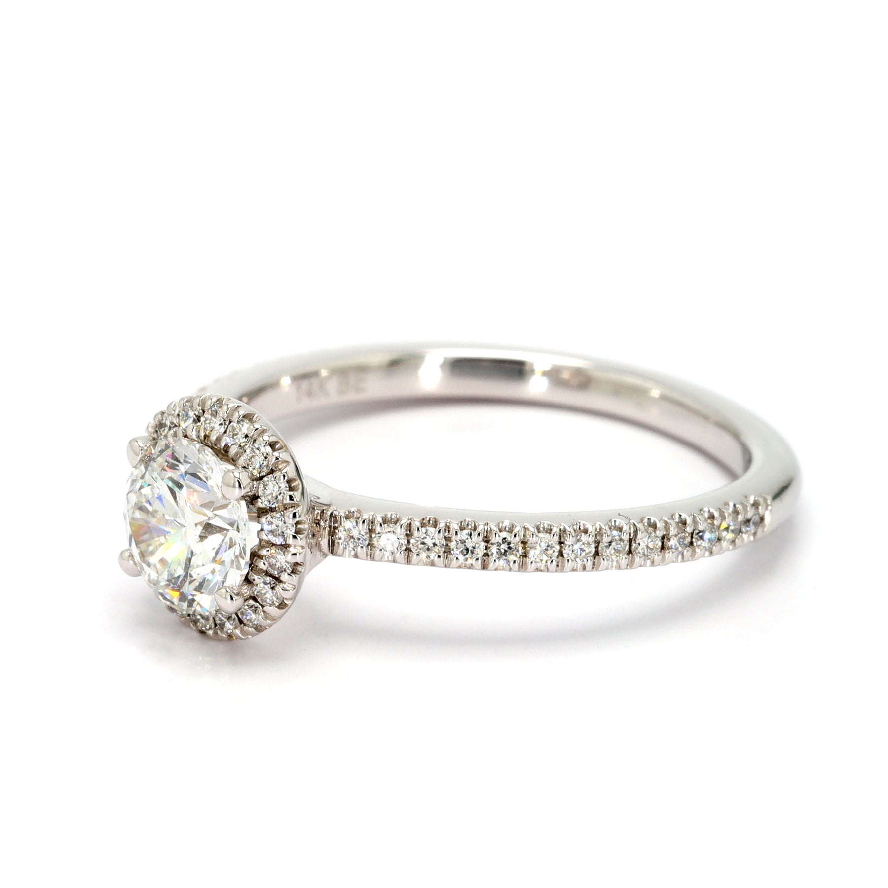 Halo engagement ring in 14-karat white gold featuring a 0.71 carat round brilliant cut Diamond (GIA#6511365513), accented with 44 round brilliant cut diamonds with a combined weight of 0.30 carats.