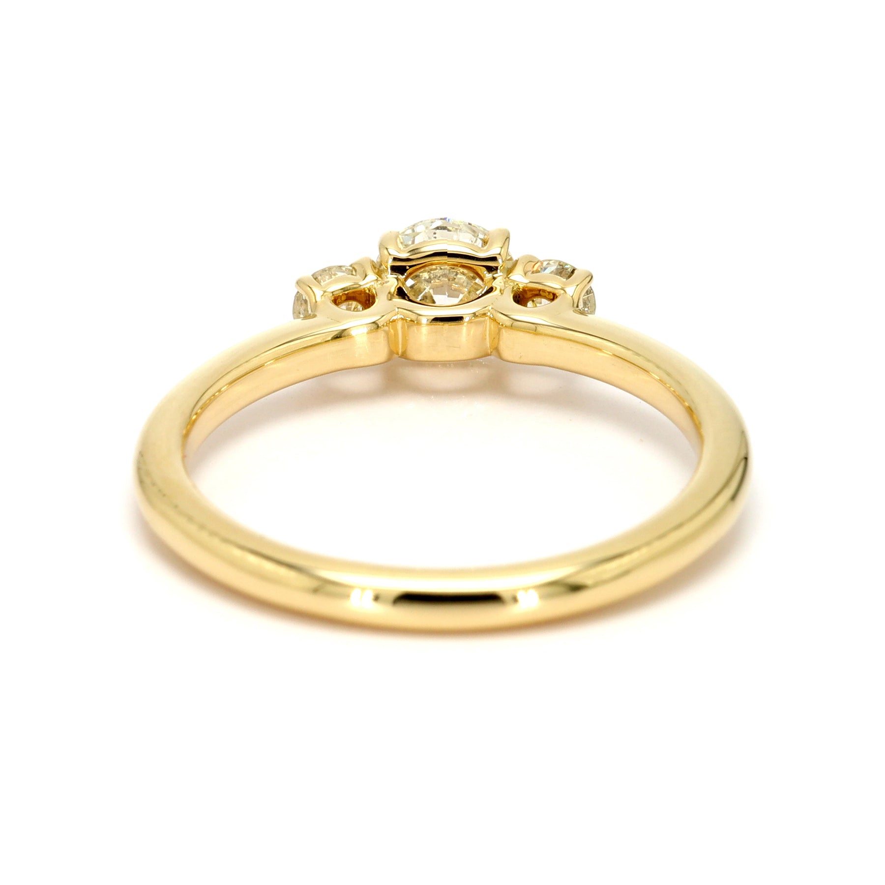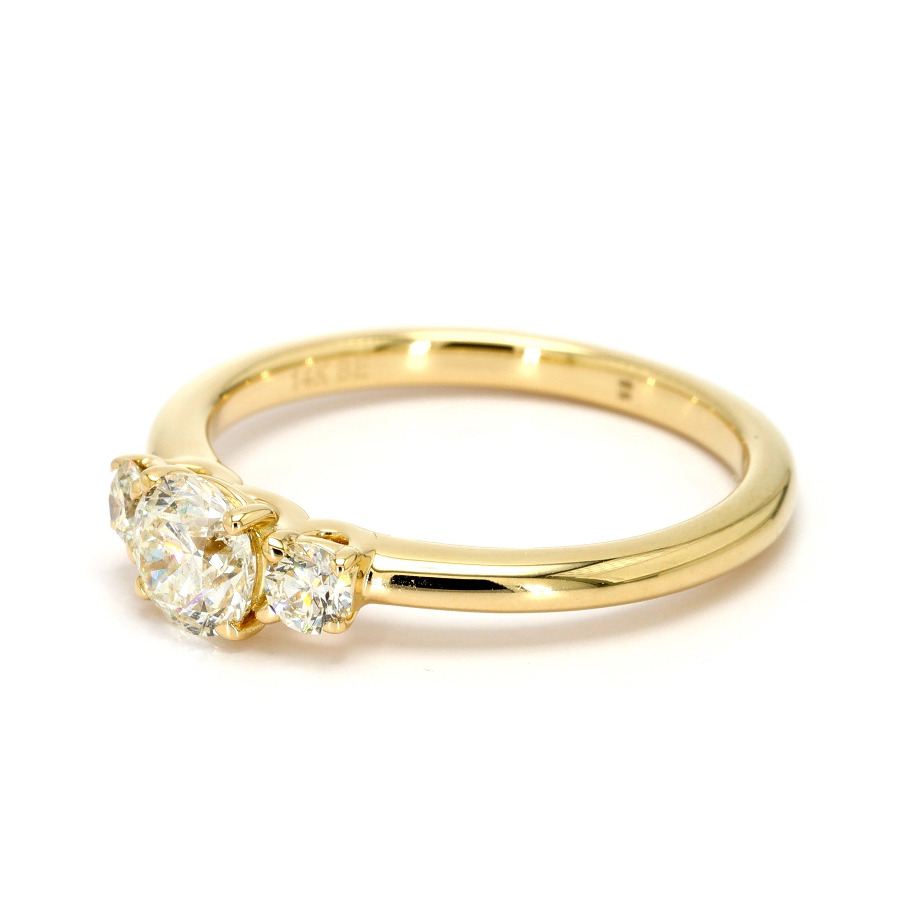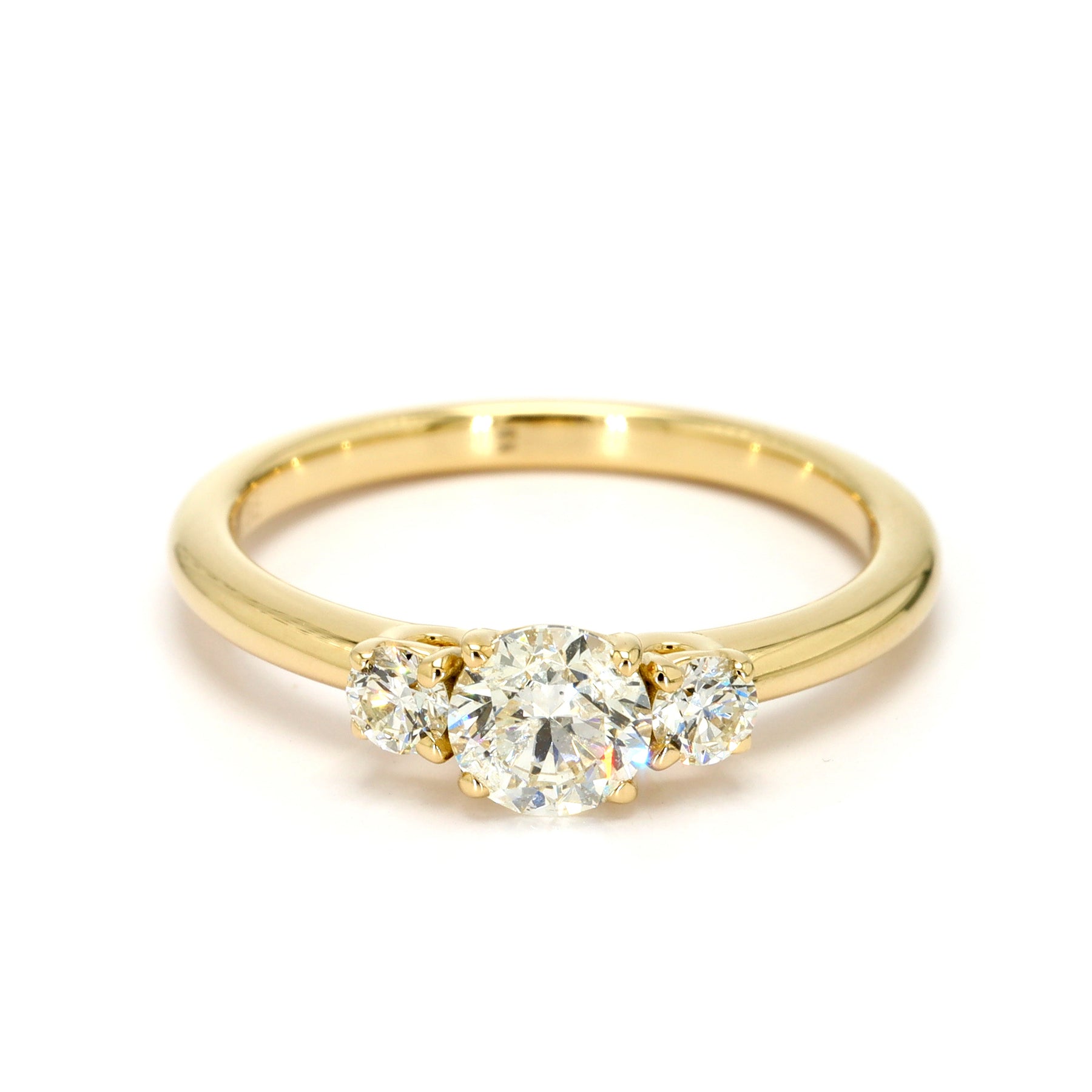 Three-stone engagement ring in 14-karat yellow gold featuring a 0.50 carat round brilliant cut Diamond center stone, accented with two round brilliant cut side Diamonds totaling 0.20 carats
