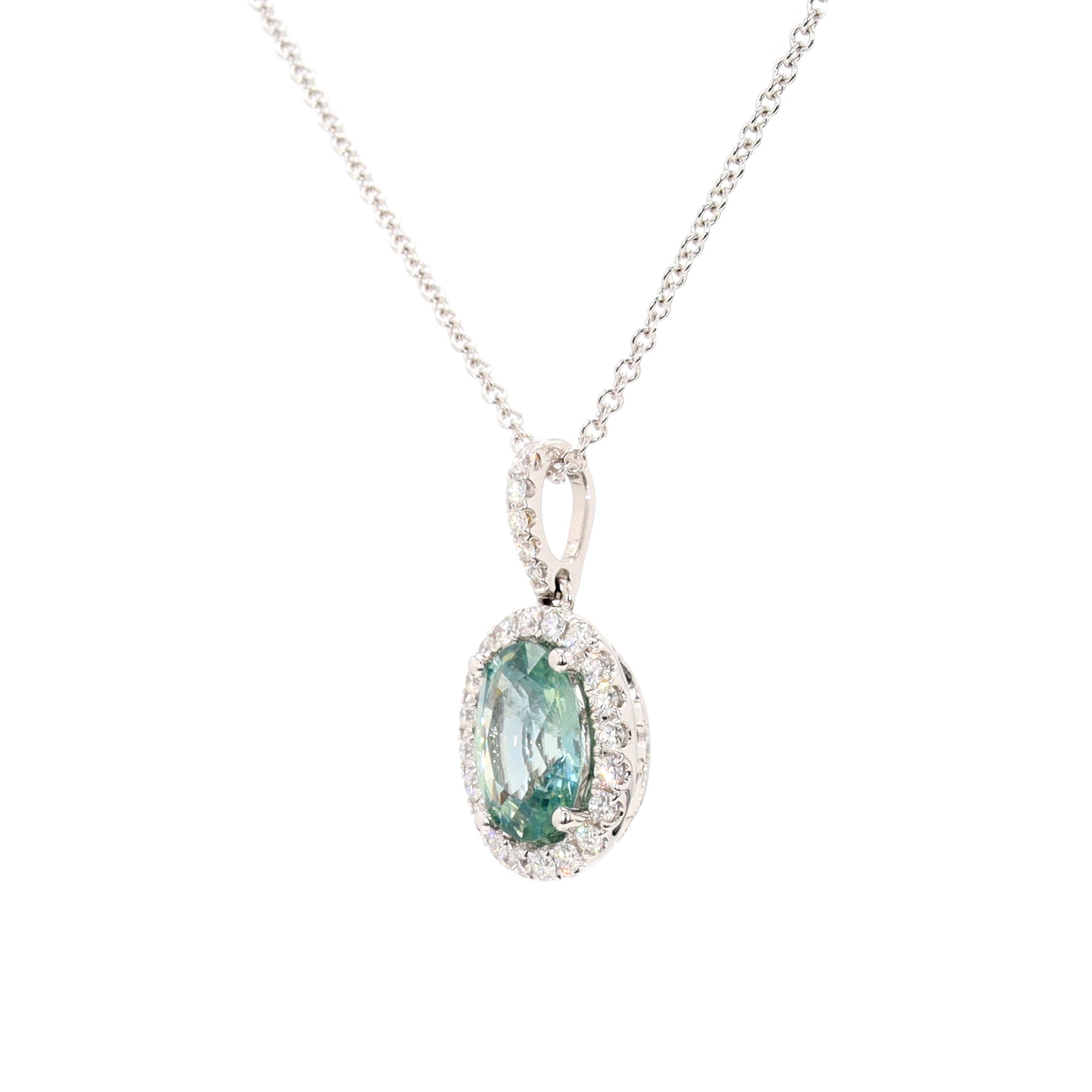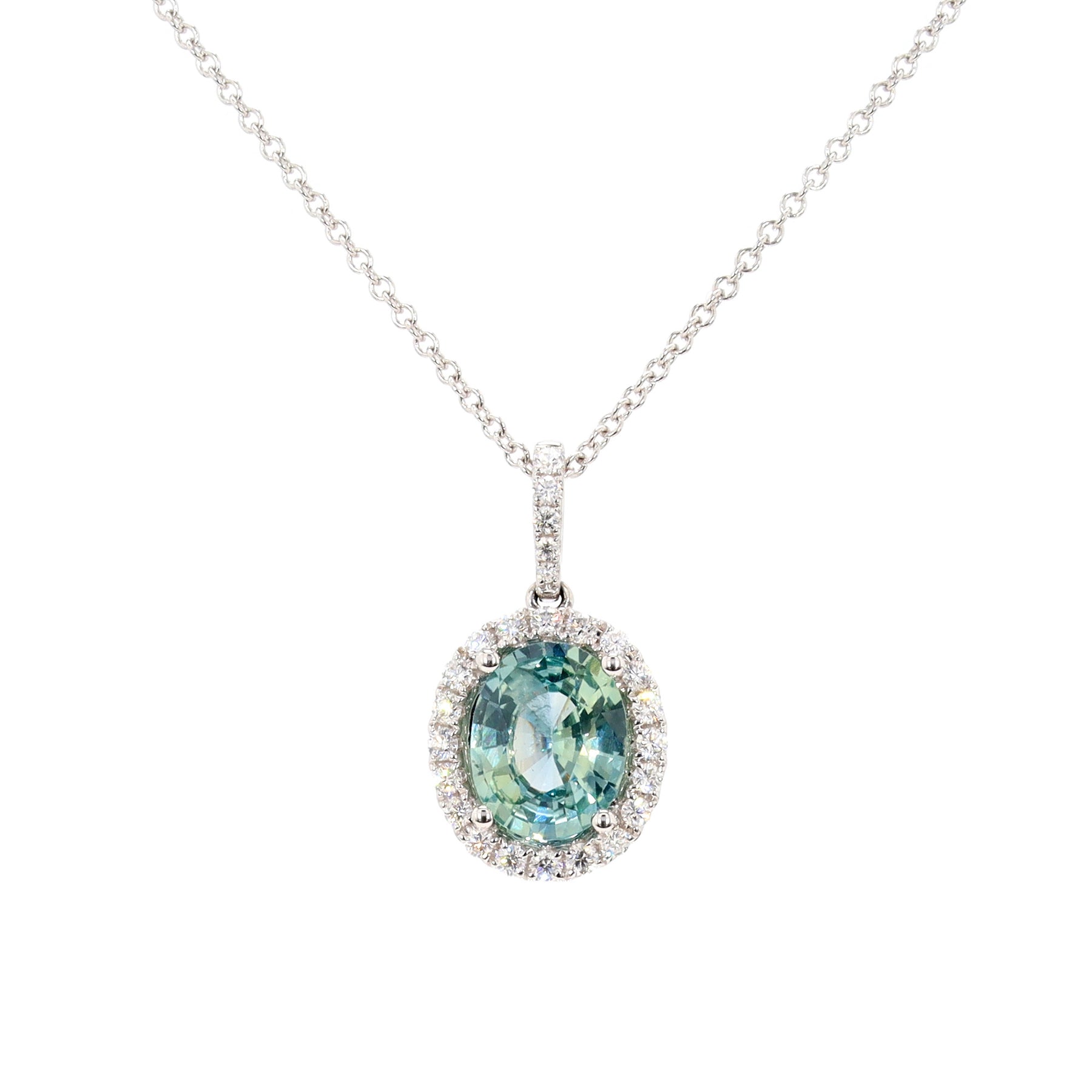 Halo pendant in 18-karat white gold, featuring a 2.22 carat oval cut blue-green Sapphire, accented with 25 round brilliant cut Diamonds totaling 0.32 carats, on an 18 inch chain.
