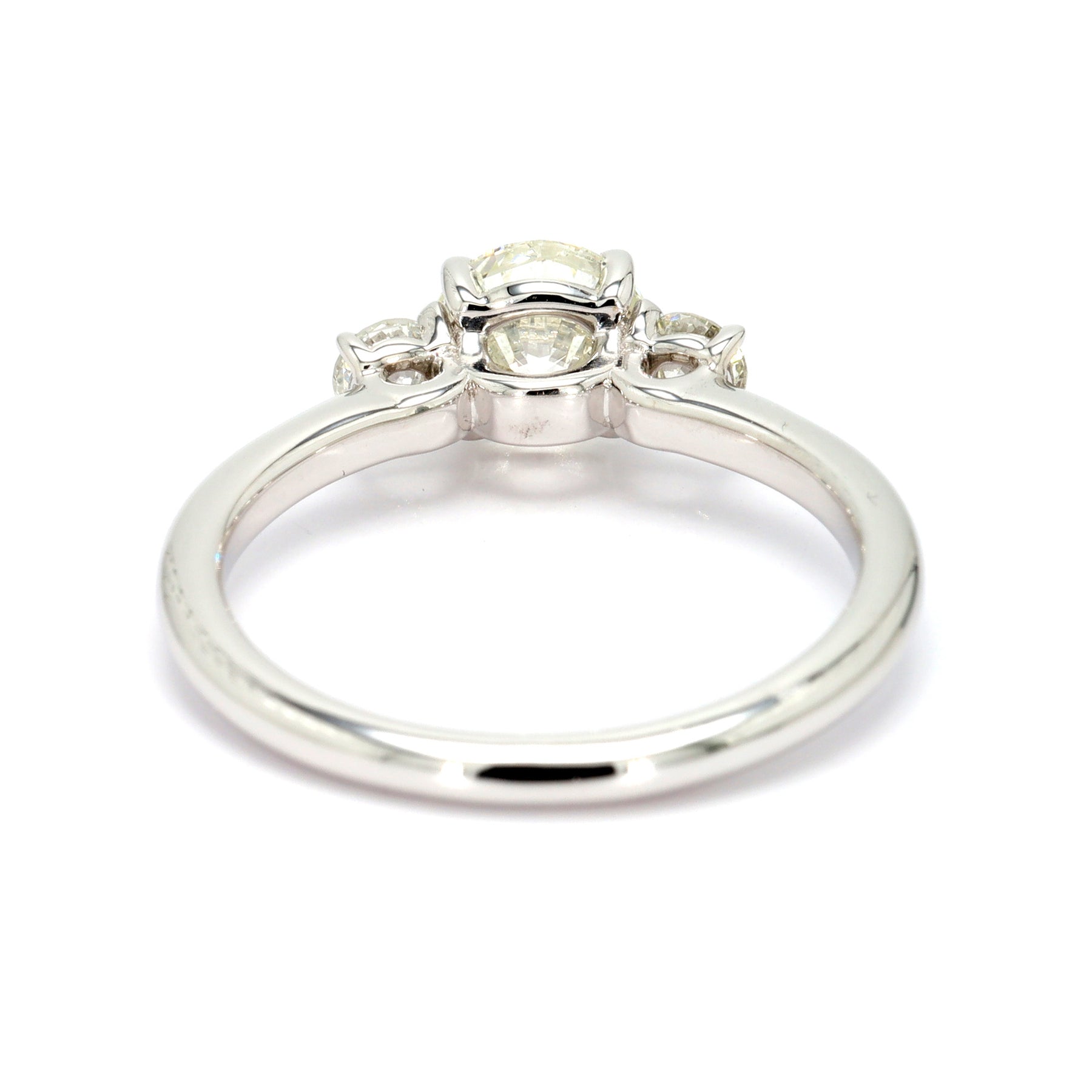 Three-stone engagement ring in 14-karat white gold featuring a 1.00 carat round brilliant cut Diamond and two side diamonds with a combined weight of 0.40 carats.