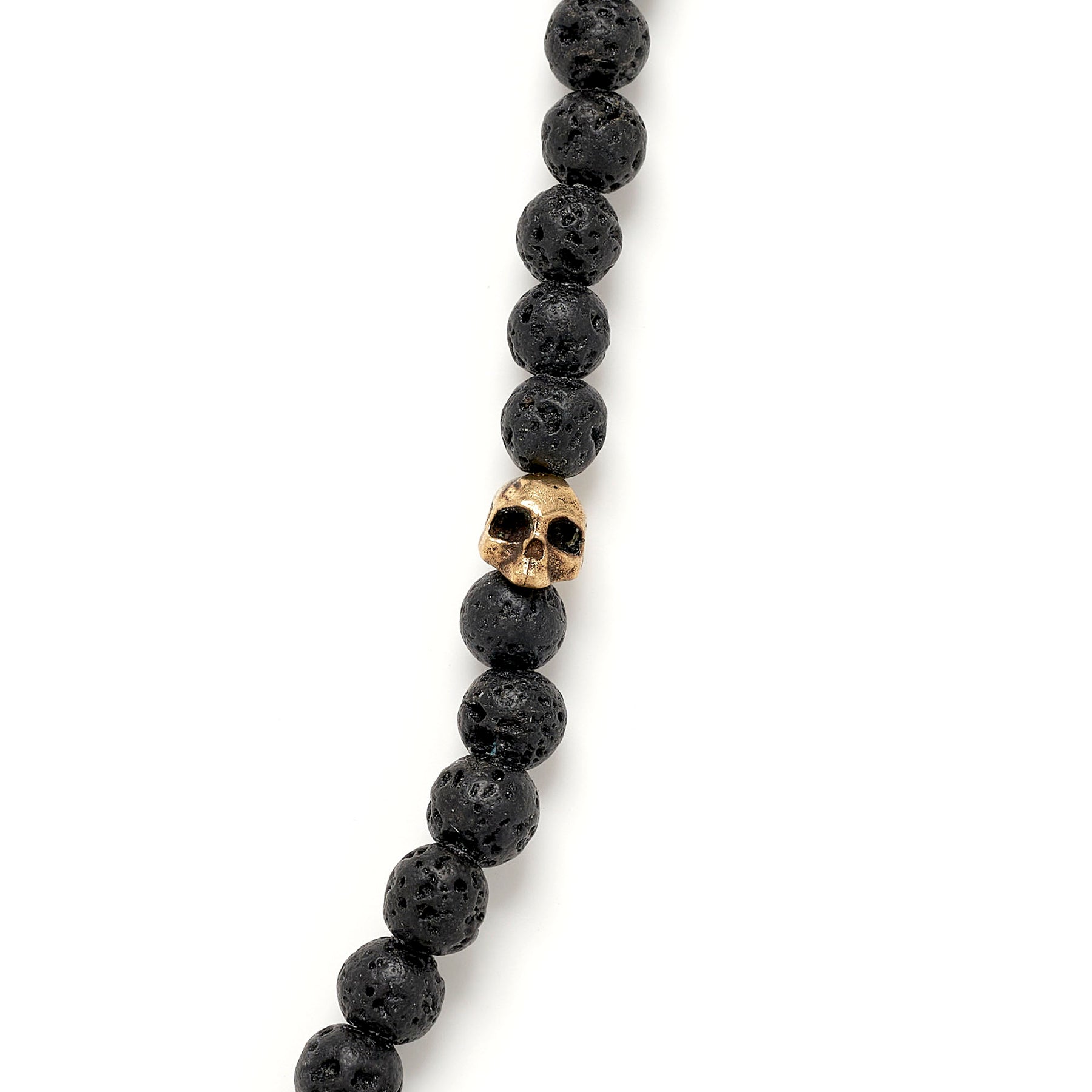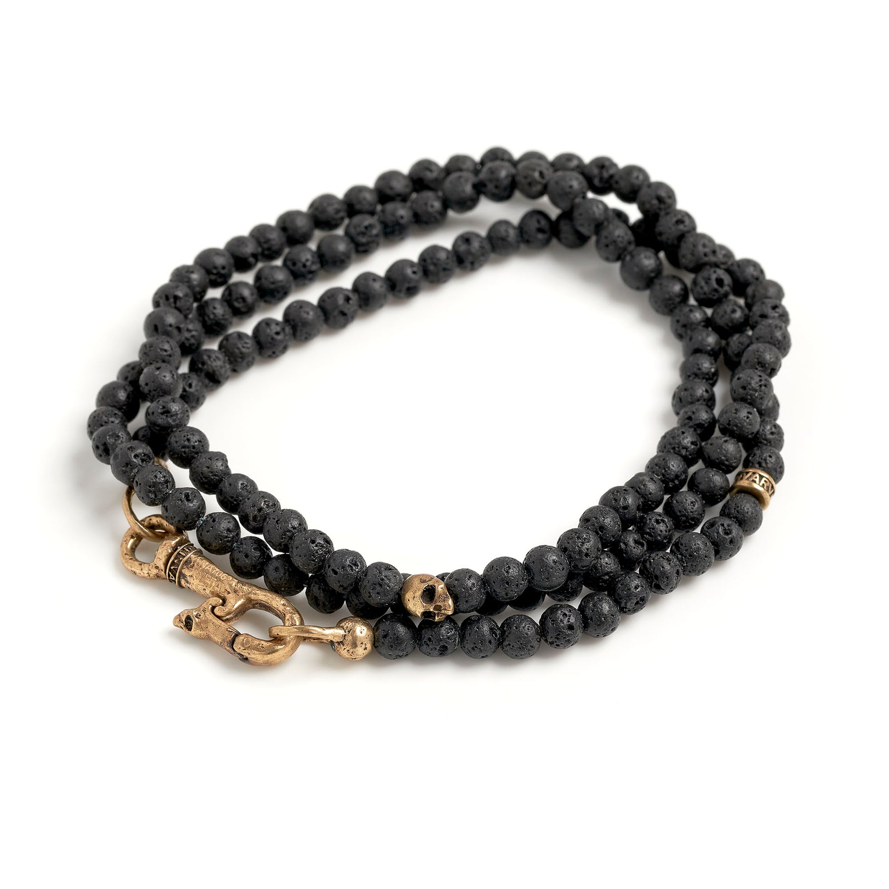 Capable of being worn as a necklace or wrapped around the wrist as a bracelet, this versatile piece is defined by its craftmanship and style. Handcrafted in Turkey, Black lava beads are offset with a single brass skull and clasp, capturing its refined, yet powerful impression.
