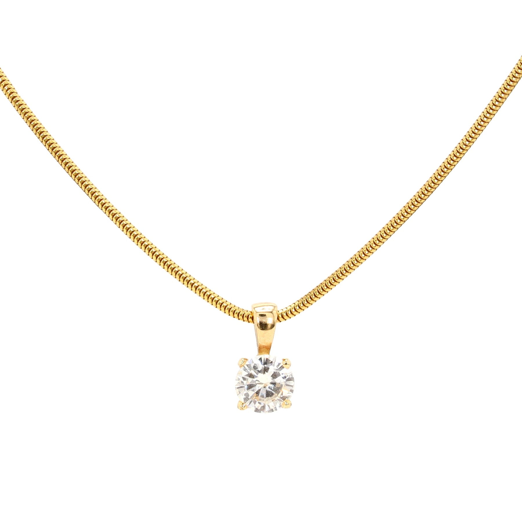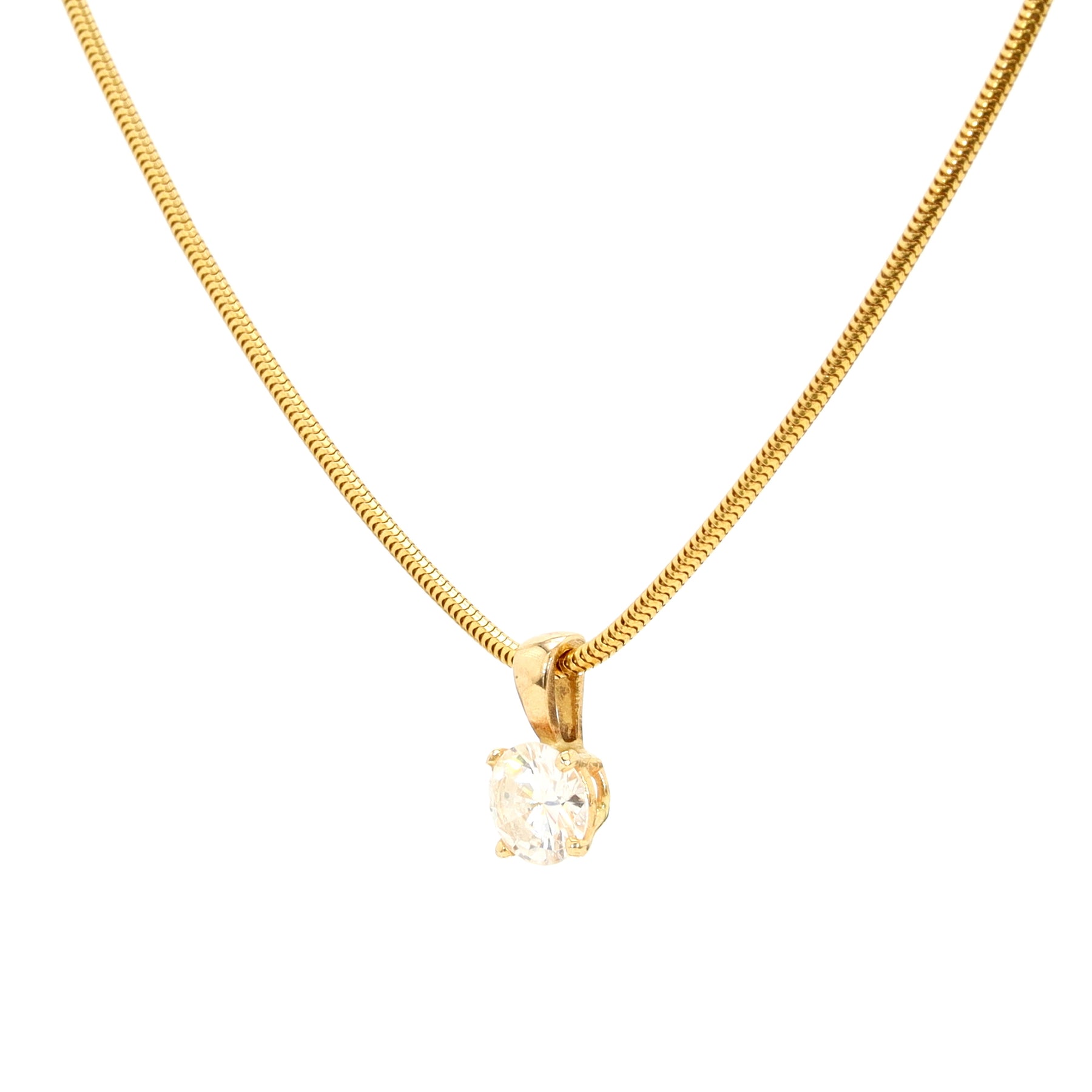 Solitaire pendant in 18-karat yellow gold, featuring a round brilliant cut Diamond (F SI1) weighing approximately 0.66 carats, on an 18" chain