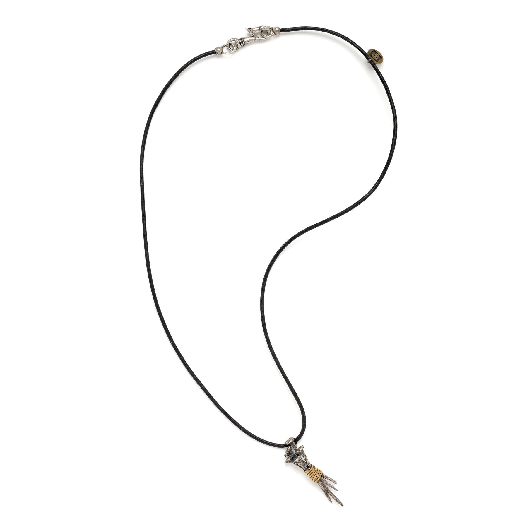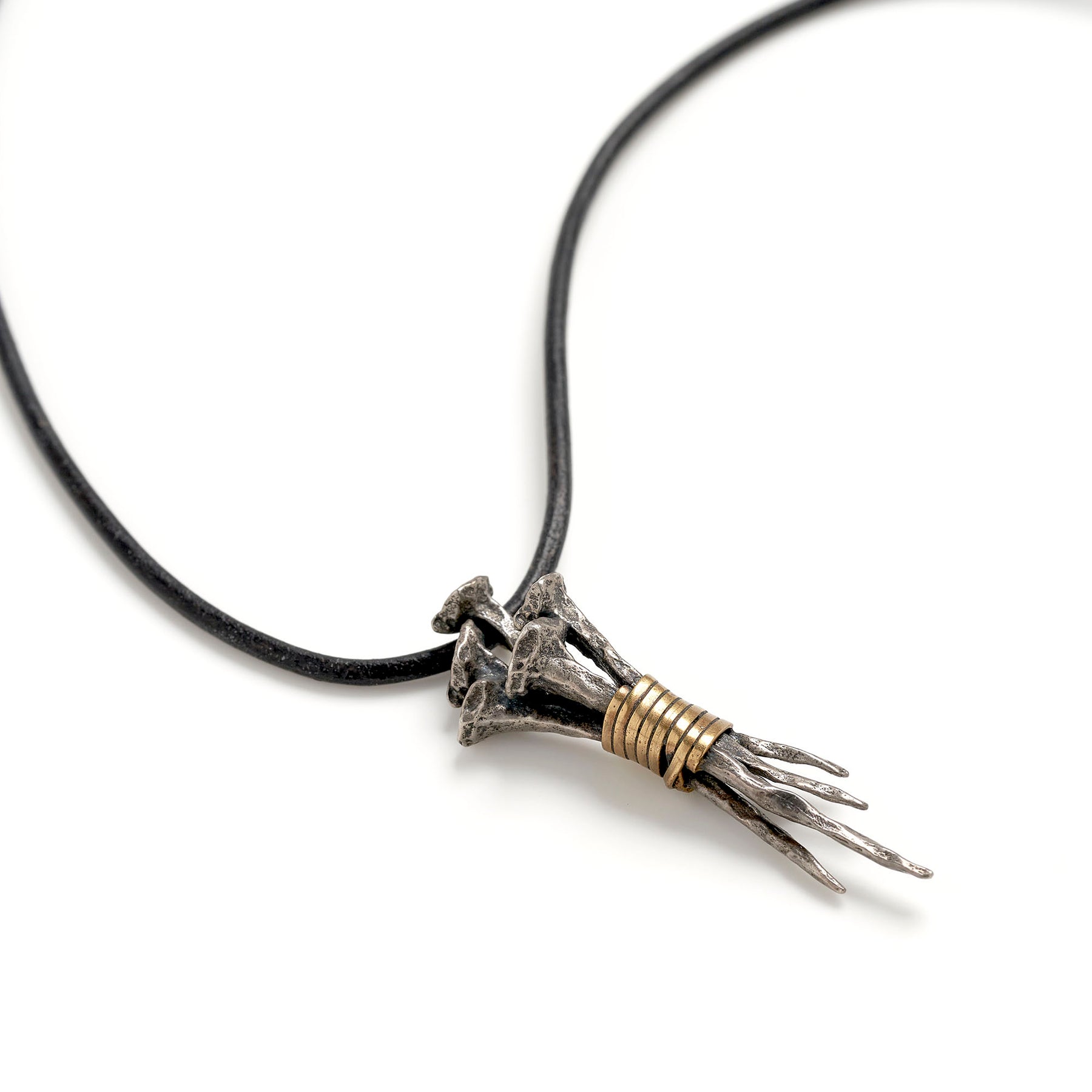 Mixed metals, this necklace features sterling silver nails bound by brass. Expertly crafted in Turkey, the unique pendant is strung on black cord and finished with our signature folding clasp in silver.