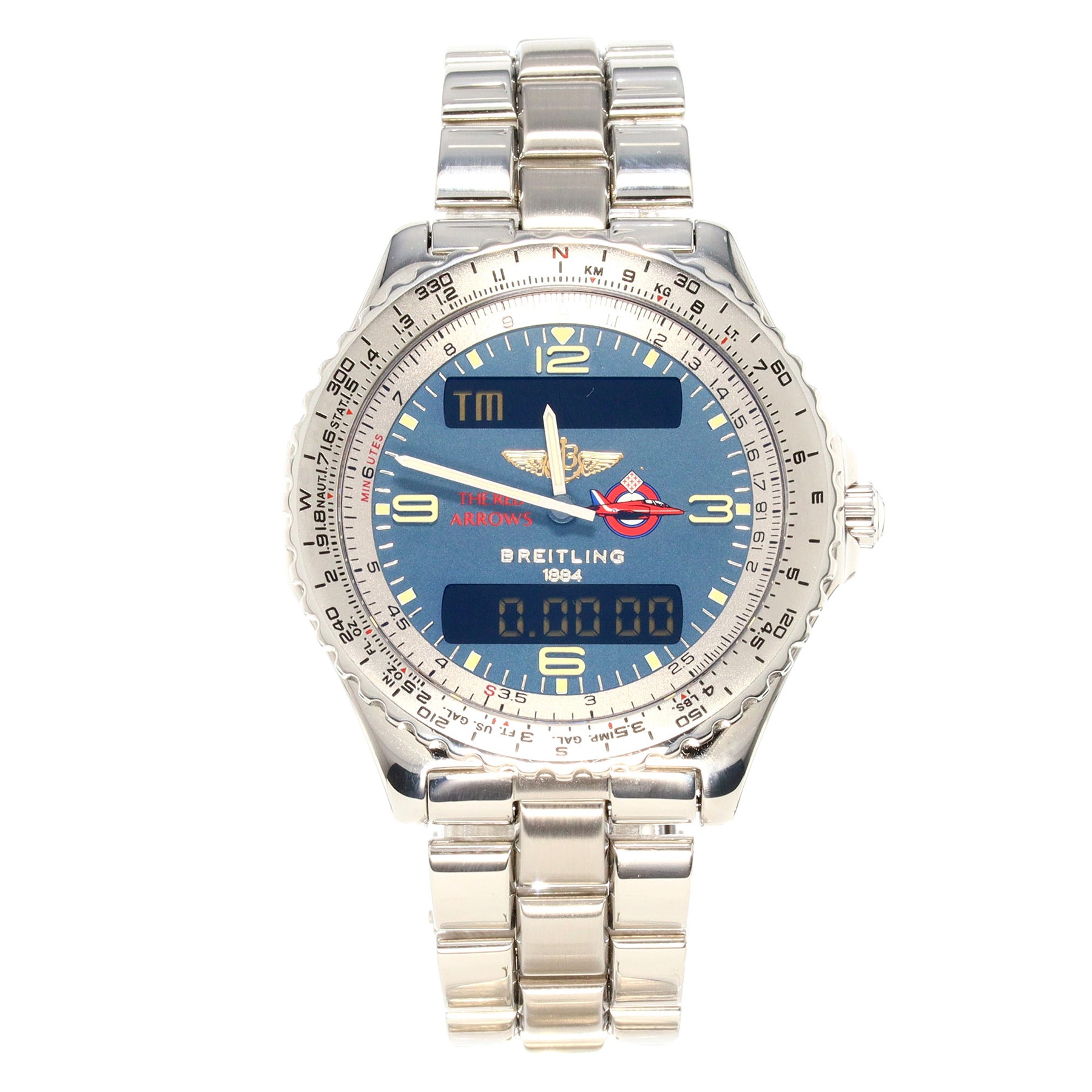 The Breitling Chronospace Red Arrows Special Edition is a rare and highly collectible timepiece that pays tribute to the legendary Royal Air Force aerobatic team. Crafted in stainless steel, this model combines aviation-inspired functionality with bold design. Its robust case houses a striking dial featuring the Red Arrows insignia, making it a standout piece for enthusiasts of military and aviation history.