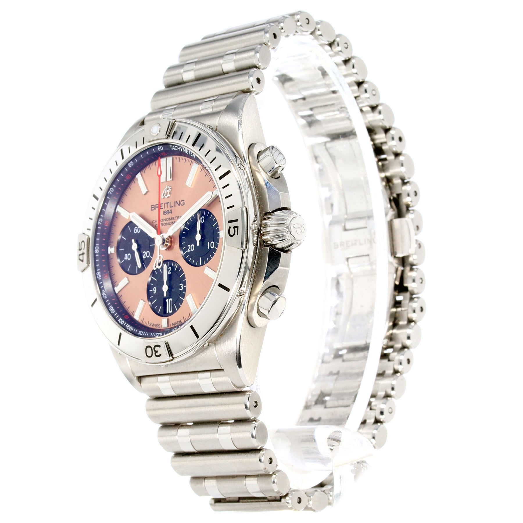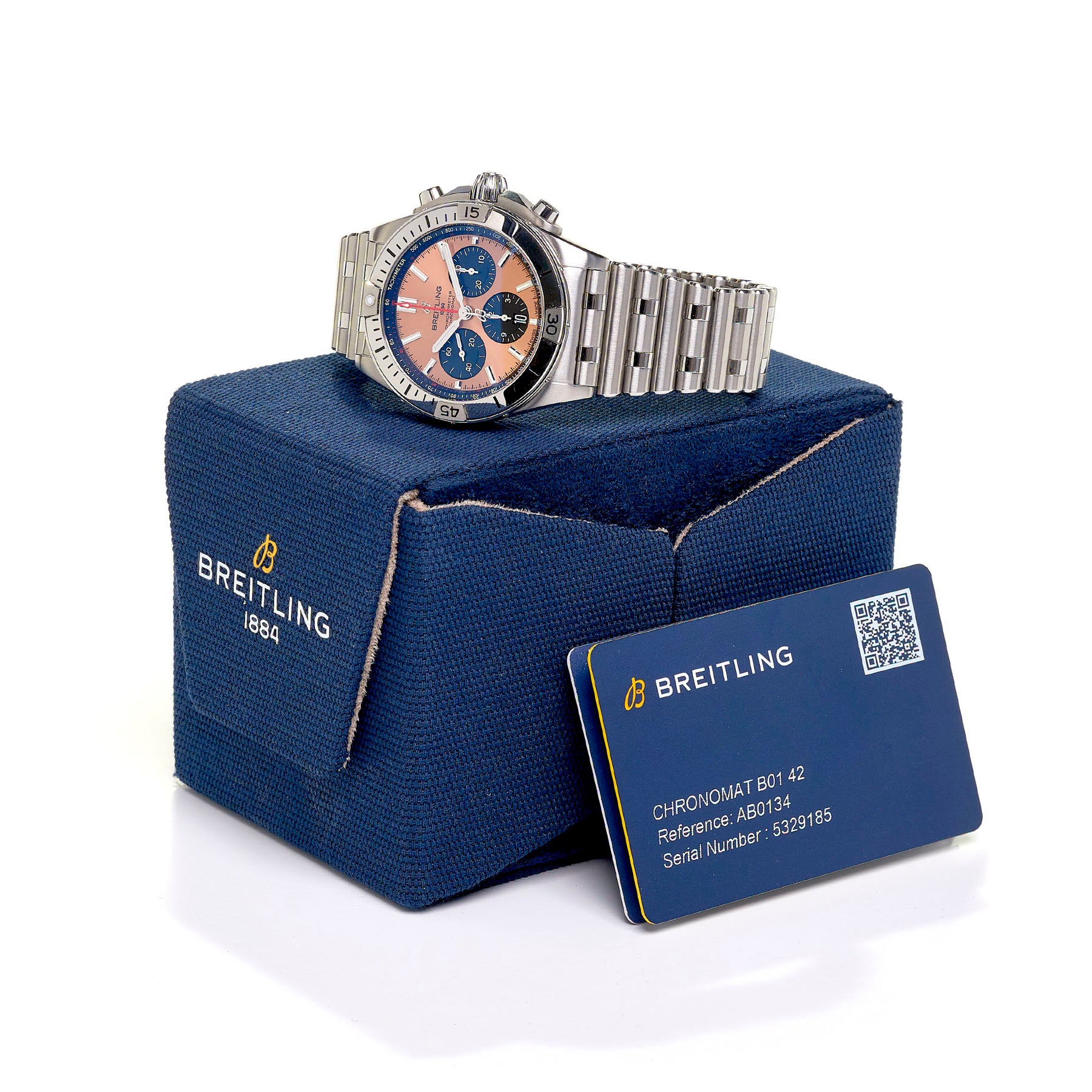 Pre-owned Breitling Chronomat 42mm Automatic Chronograph (Ref. AB0134101K1A1) with Salmon Dial, Stainless Steel case and Bracelet, in excellent condition with box and papers.