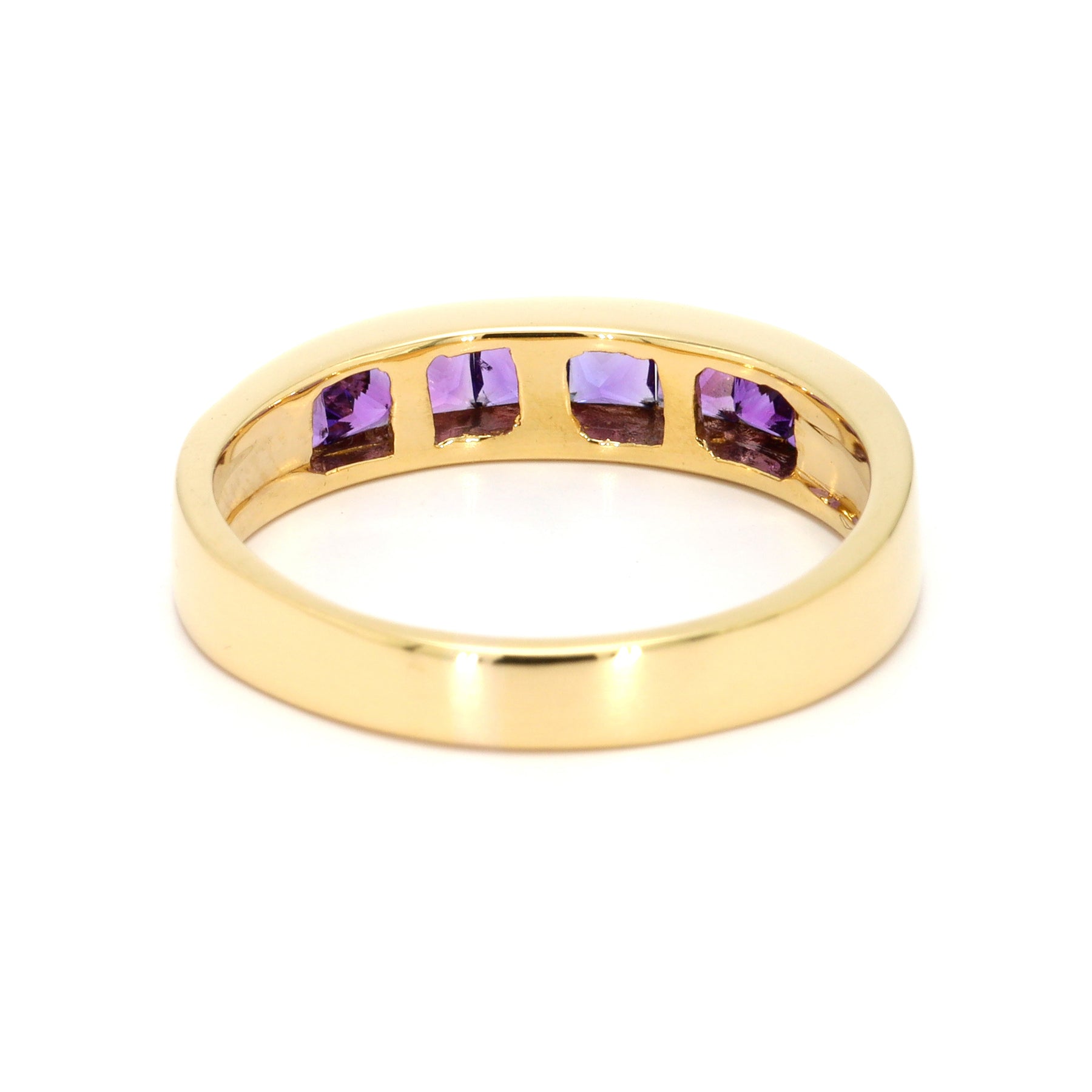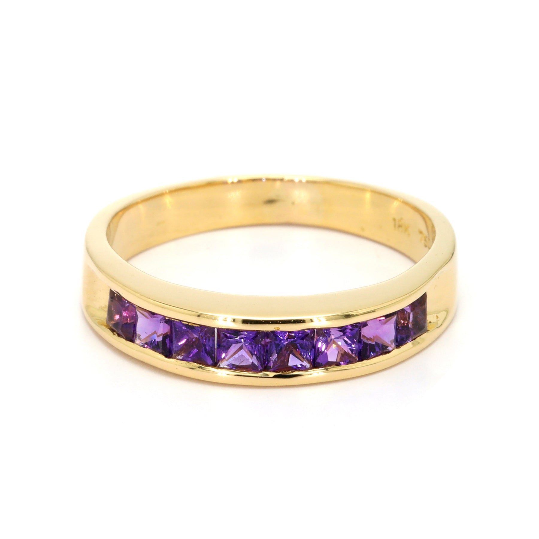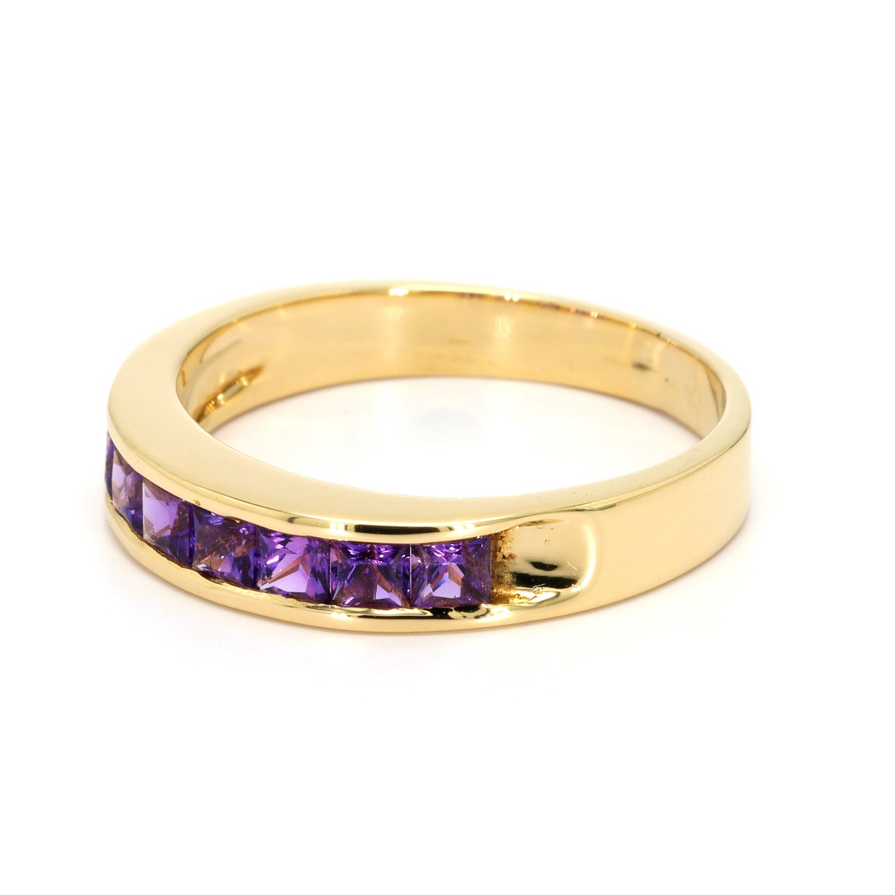 Single-row fashion band in 18-karat yellow gold featuring 8 princess-cut amethysts with a combined weight of approximately 0.50 carats.