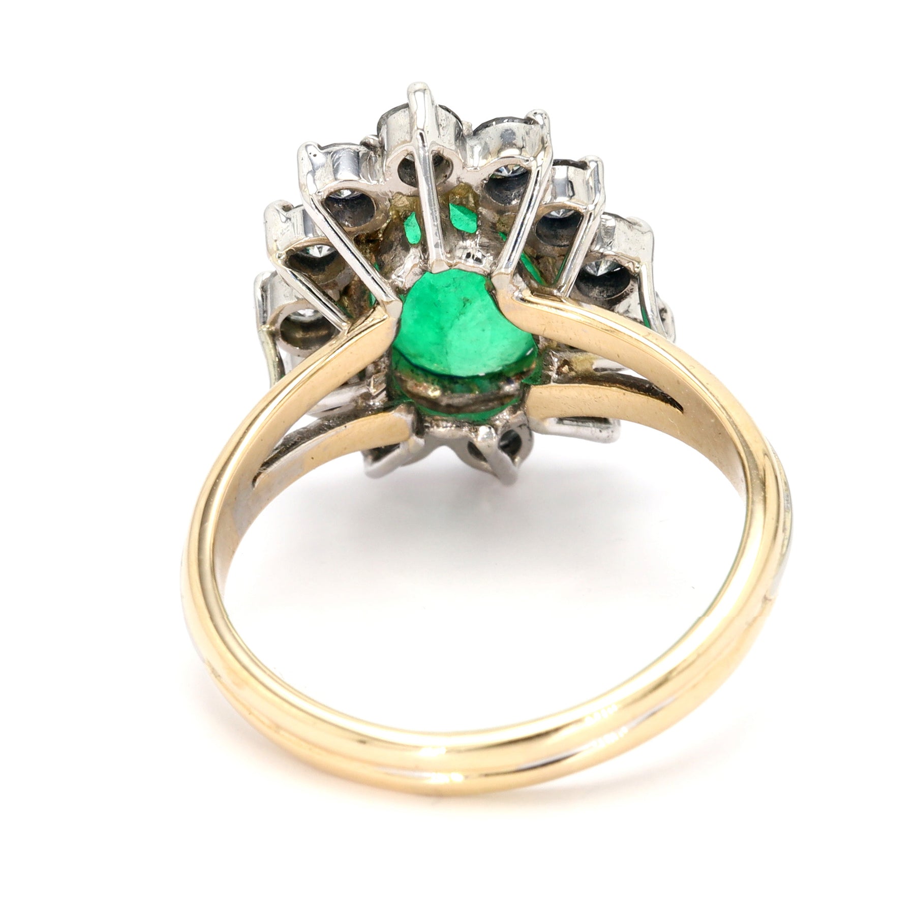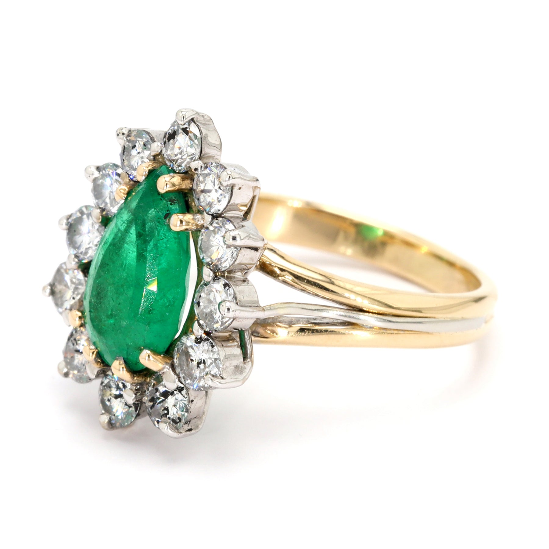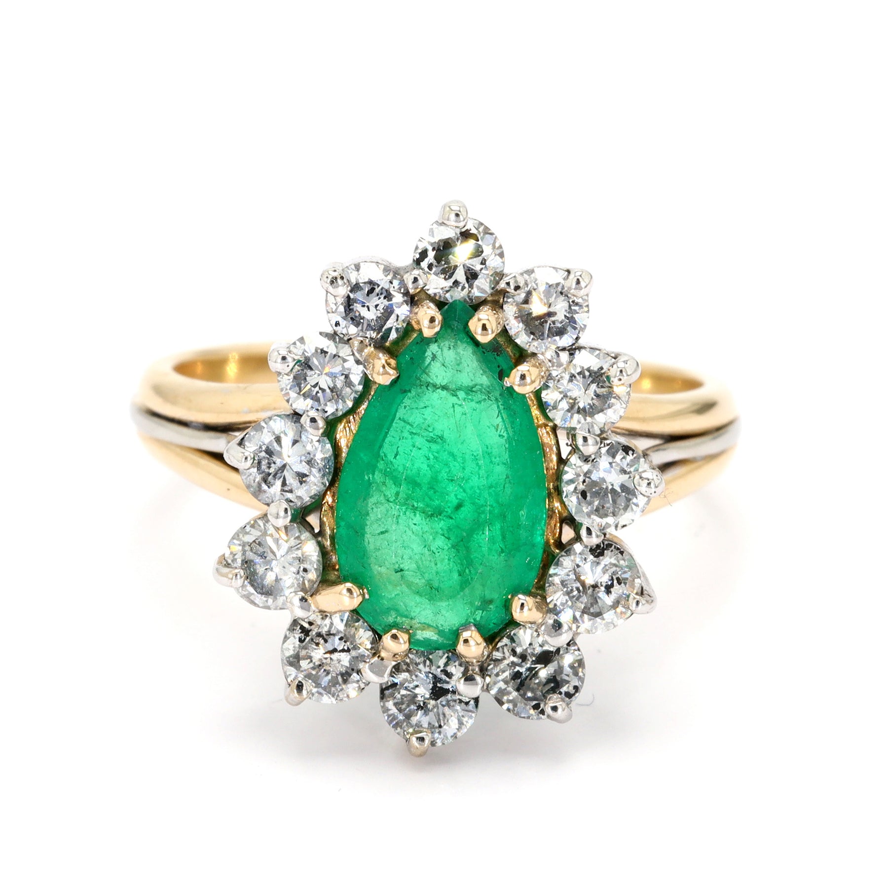 Halo fashion ring in 14-karat yellow gold featuring 1 pear-shaped emerald weighing approximately 1.50 carats and 12 round brilliant diamonds (H/I, SI) with a combined weight of approximately 1.30 carats.