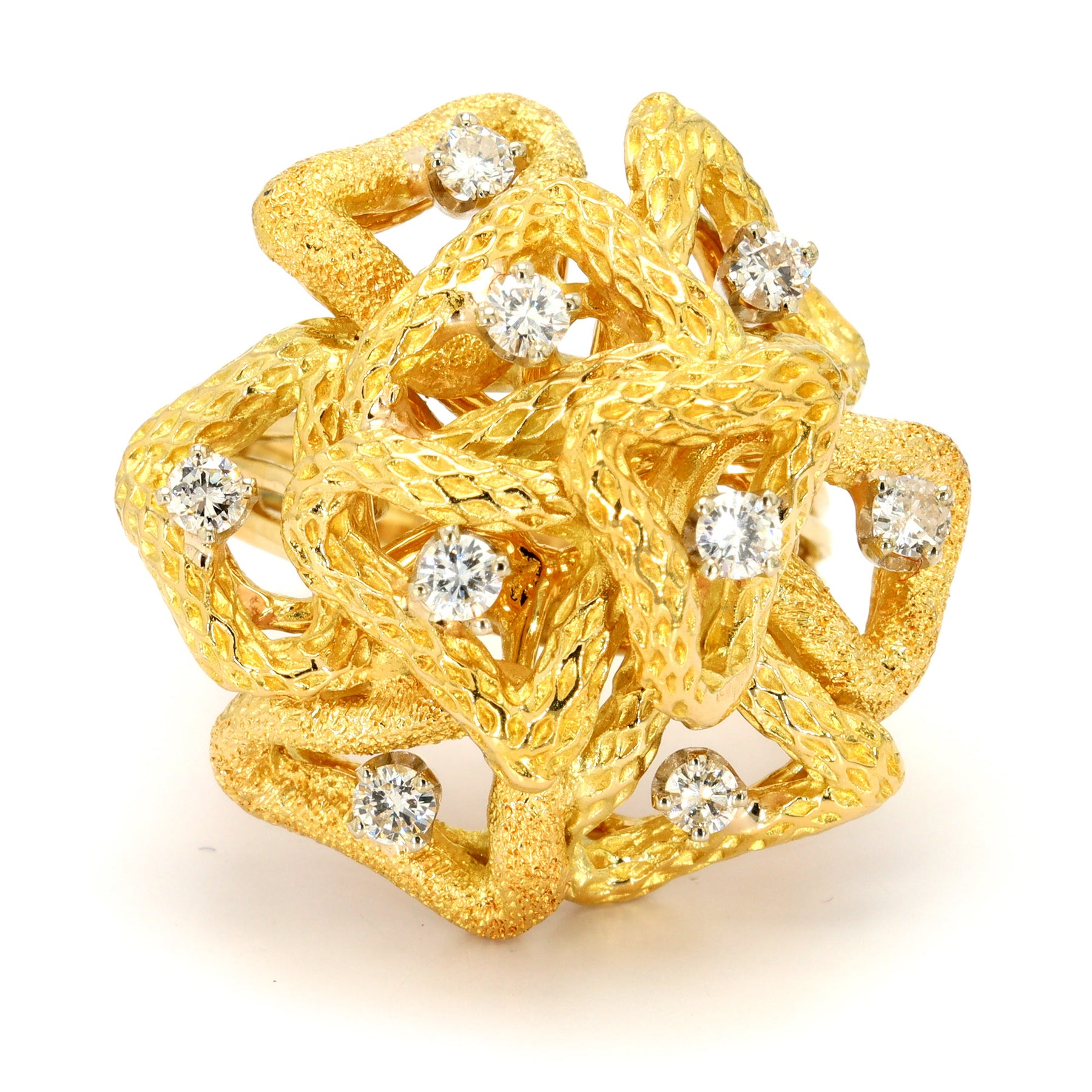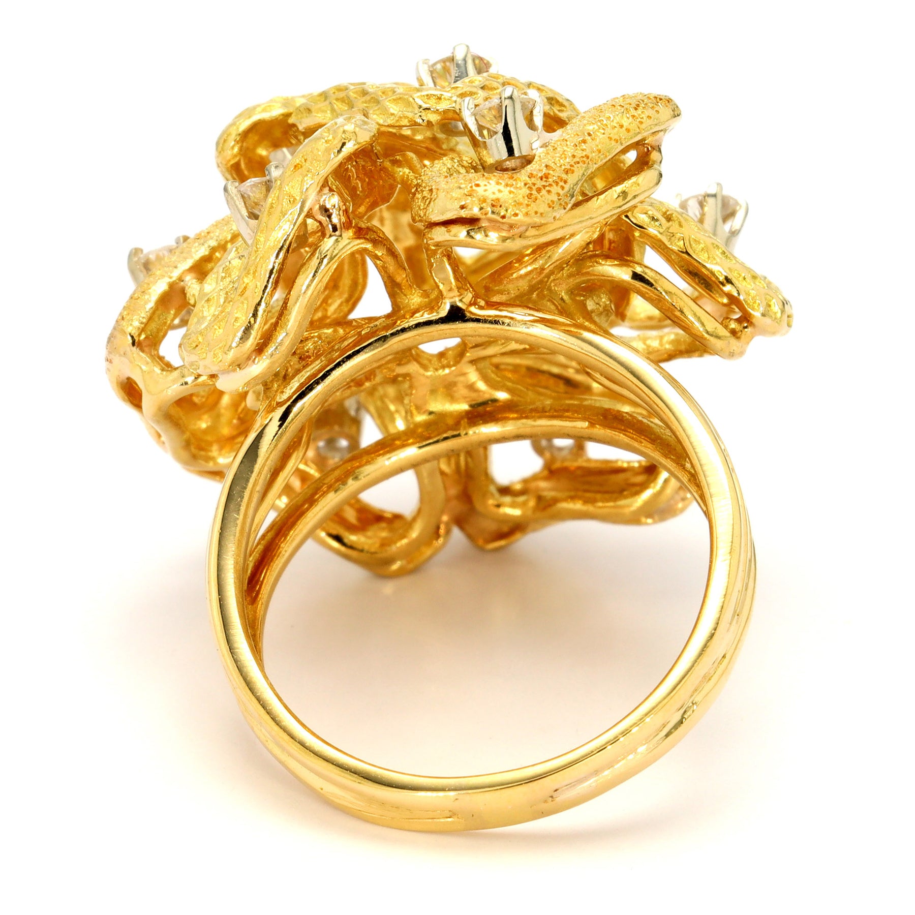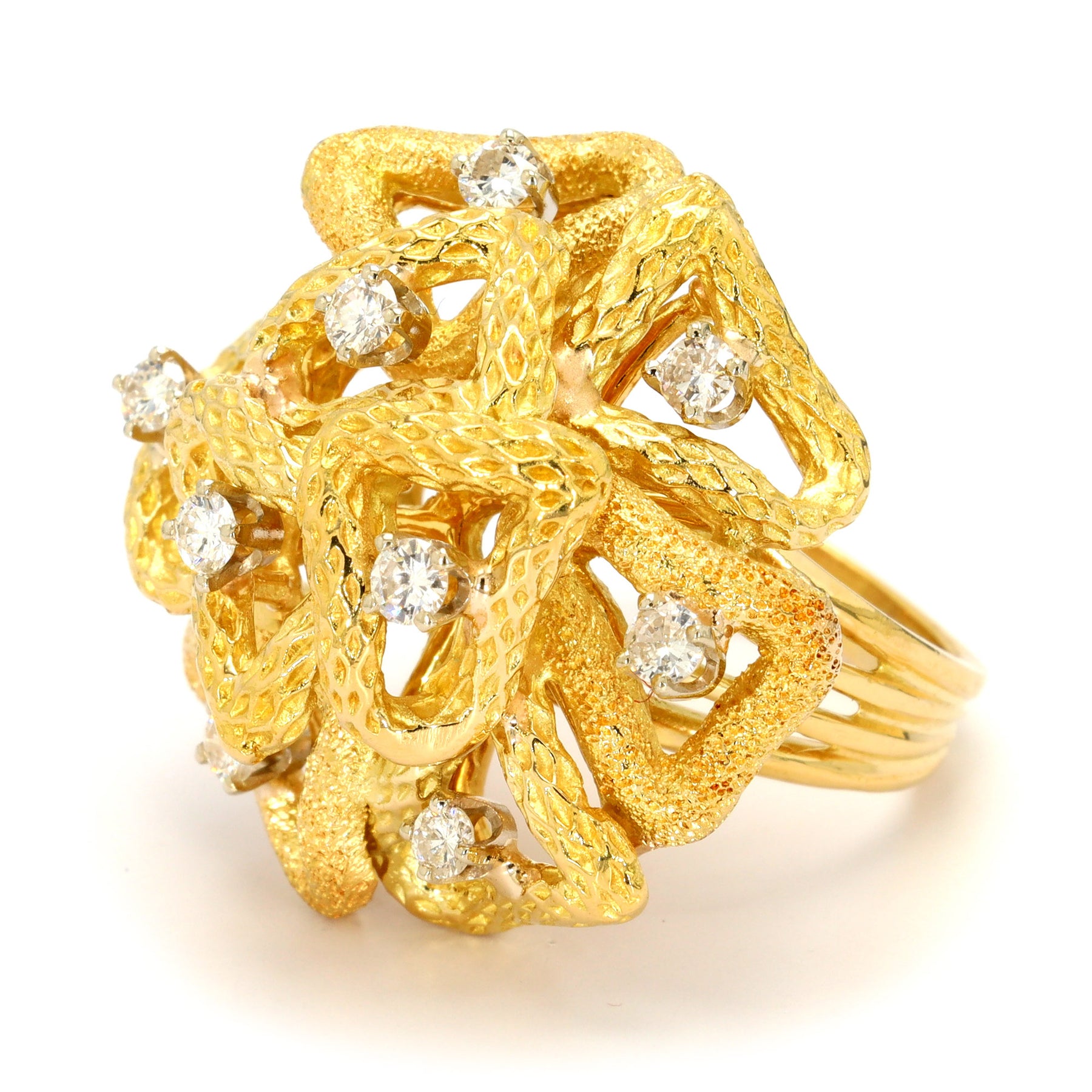Mid-century fashion ring, circa 1960, size 6.5, in 18-karat yellow gold featuring 9 round brilliant diamonds (G/H, VS2/SI1) with a combined weight of approximately 0.50 carats.