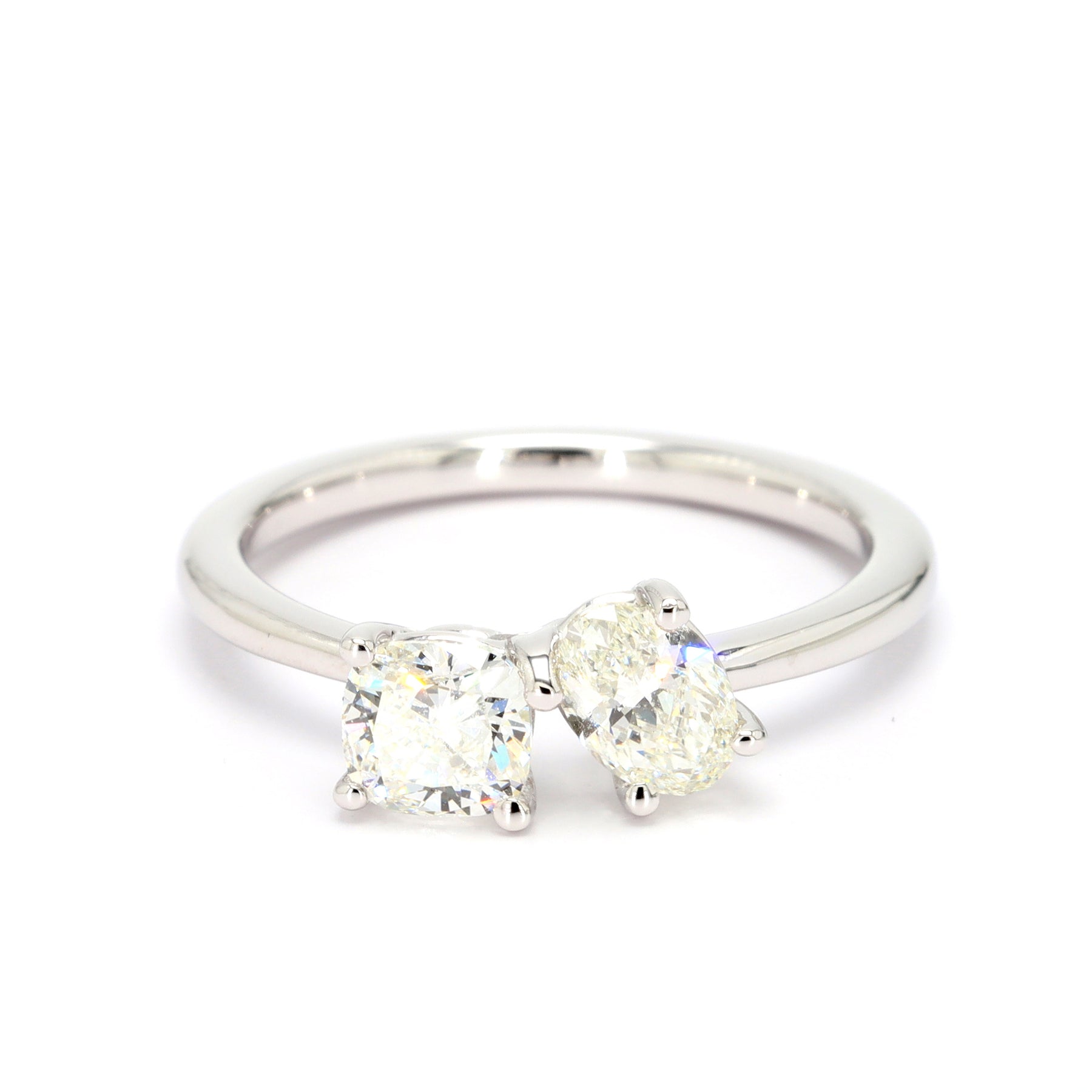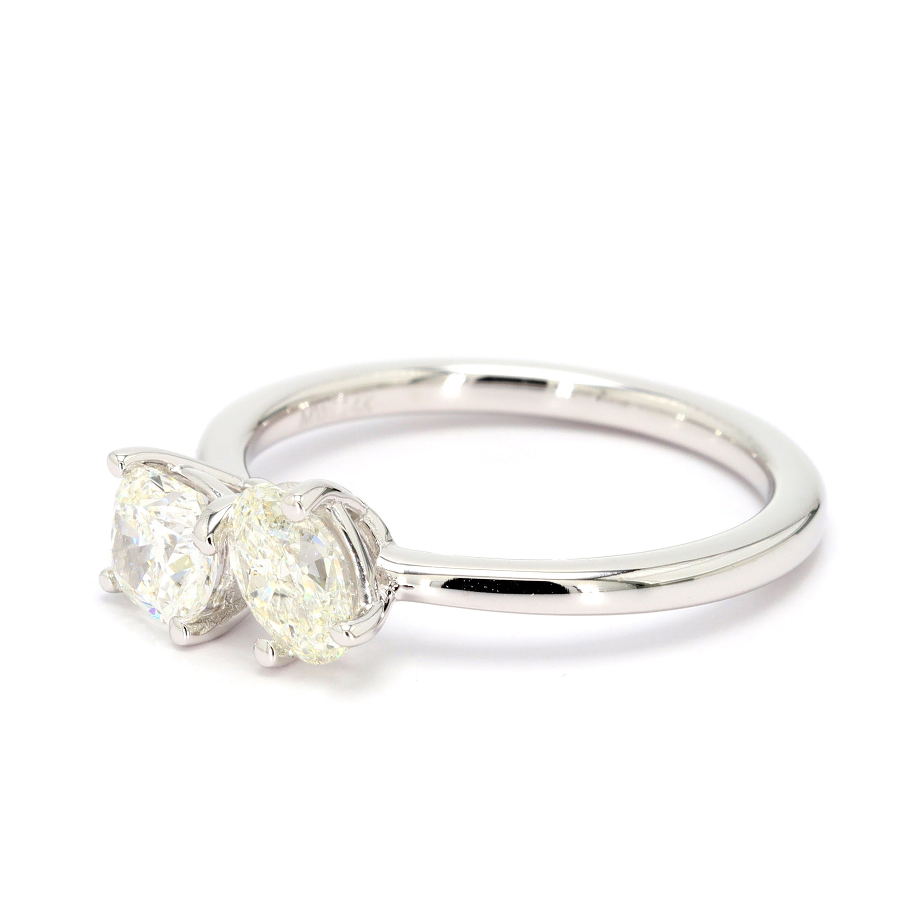 Moi et toi fashion ring in 14-karat white gold featuring one oval diamond and one round brilliant diamond (I/J, SI) with a combined weight of 1.10 carats.