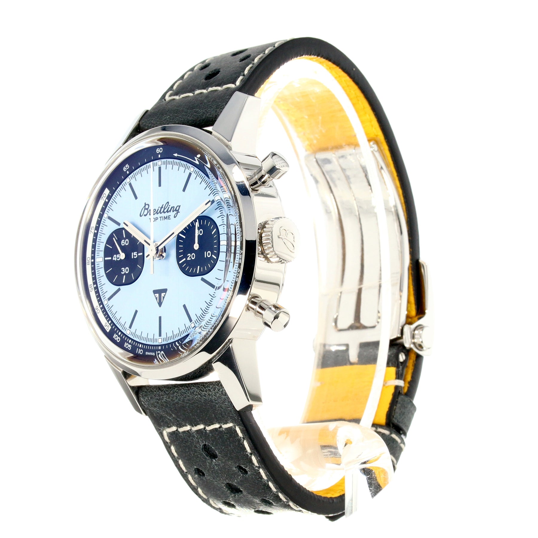 The Top Time Triumph features a distinctive ice-blue dial, a nod to the iconic Triumph motorcycles, and is powered by the reliable Breitling Caliber 23 automatic movement. Its stainless steel case and racing-themed leather strap evoke a sense of speed and style, perfect for enthusiasts of both horology and motorsport.