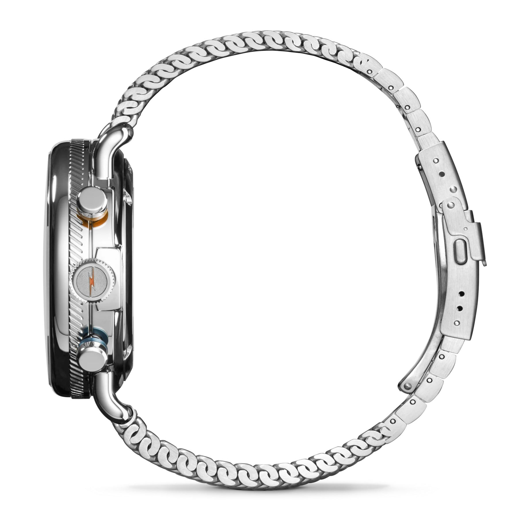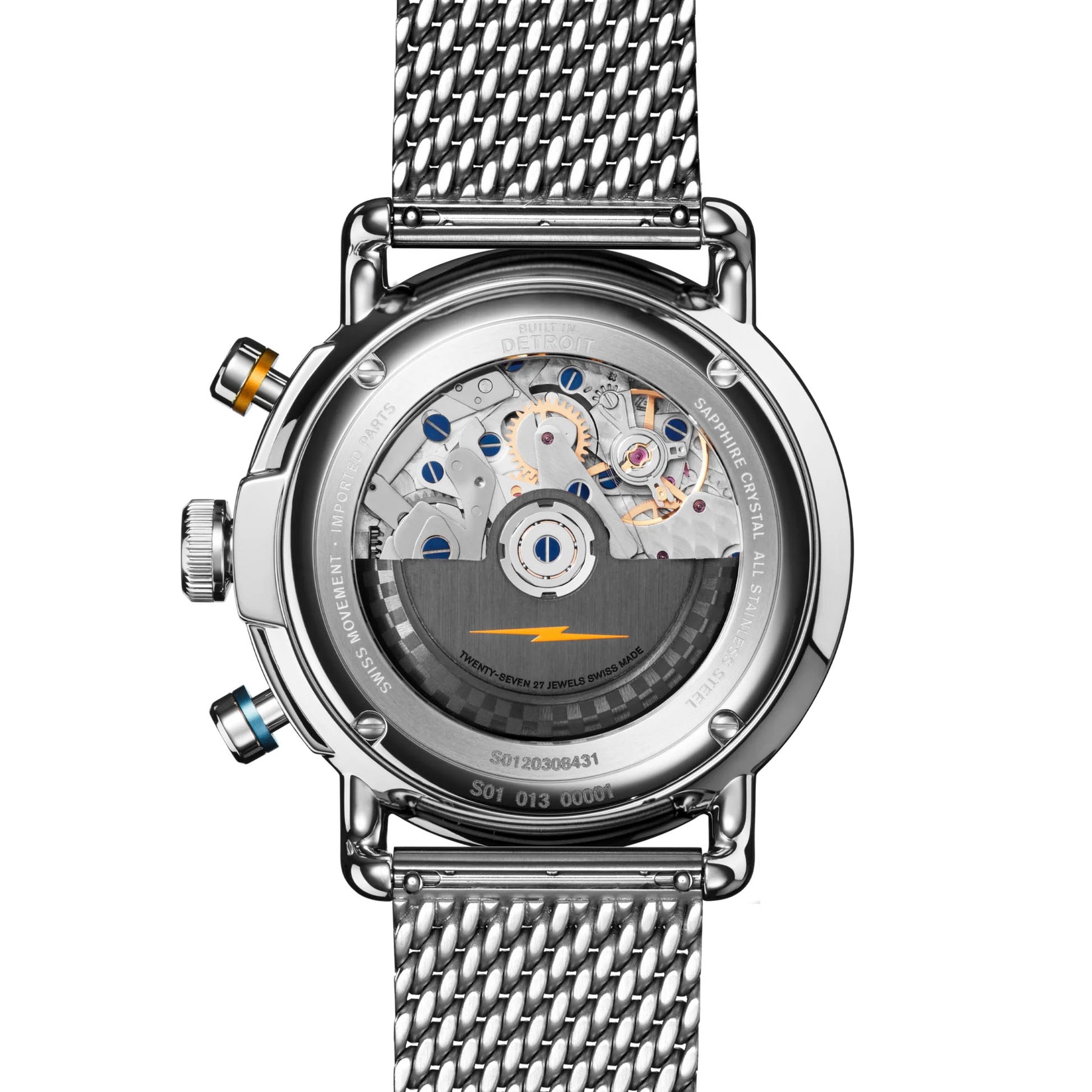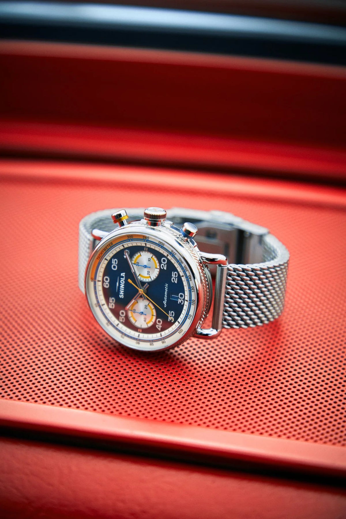 Canary yellow detailing and two silver sub dials punctuate the sunray-finish midnight blue dial. The 44mm polished stainless steel case features a striking coin edge and colorful anodized aluminum collars on the pushbuttons. View the Swiss-made automatic Sellita movement at work through the exhibition caseback window. It’s all brought together by the mesh stainless steel bracelet—elevated and svelte, like your favorite hotrod.