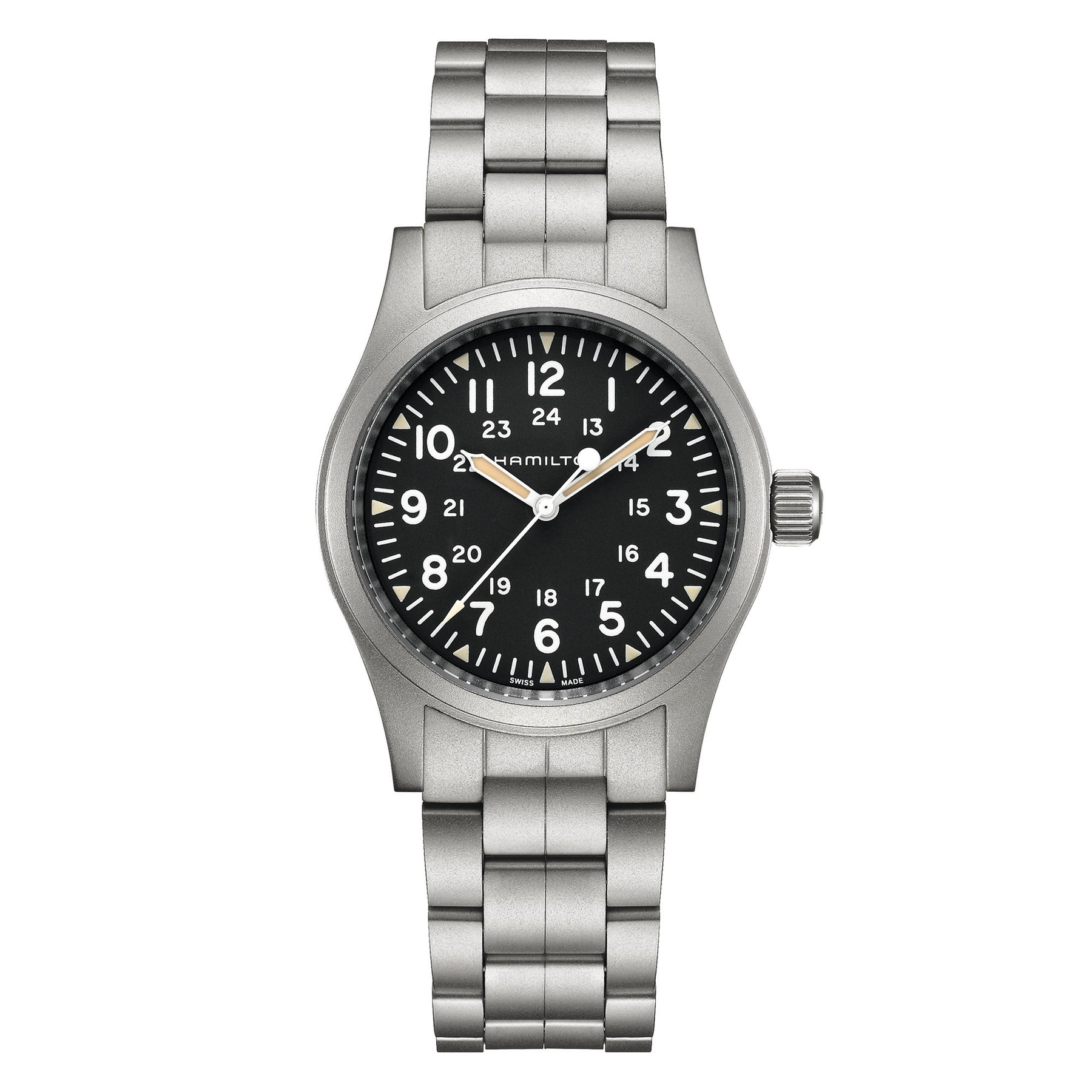 The original soldier’s watch is sportier than ever with a comfortable stainless steel bracelet. Powered by our exclusive H-50 handwinding movement, our latest Khaki Field Mechanical style won’t let you down. Rugged and reliable, this 38mm field watch is ready for an adventure.
