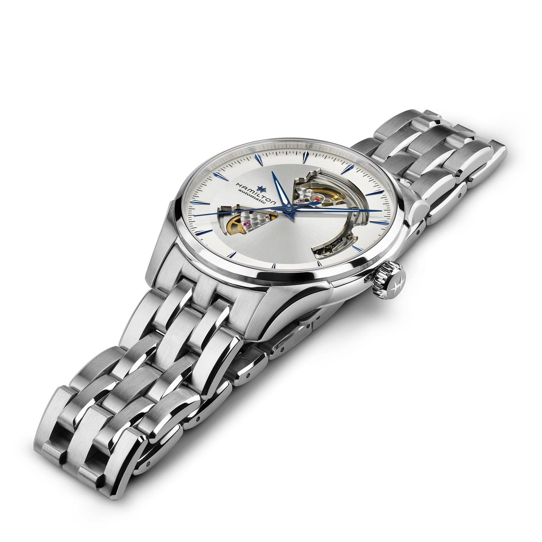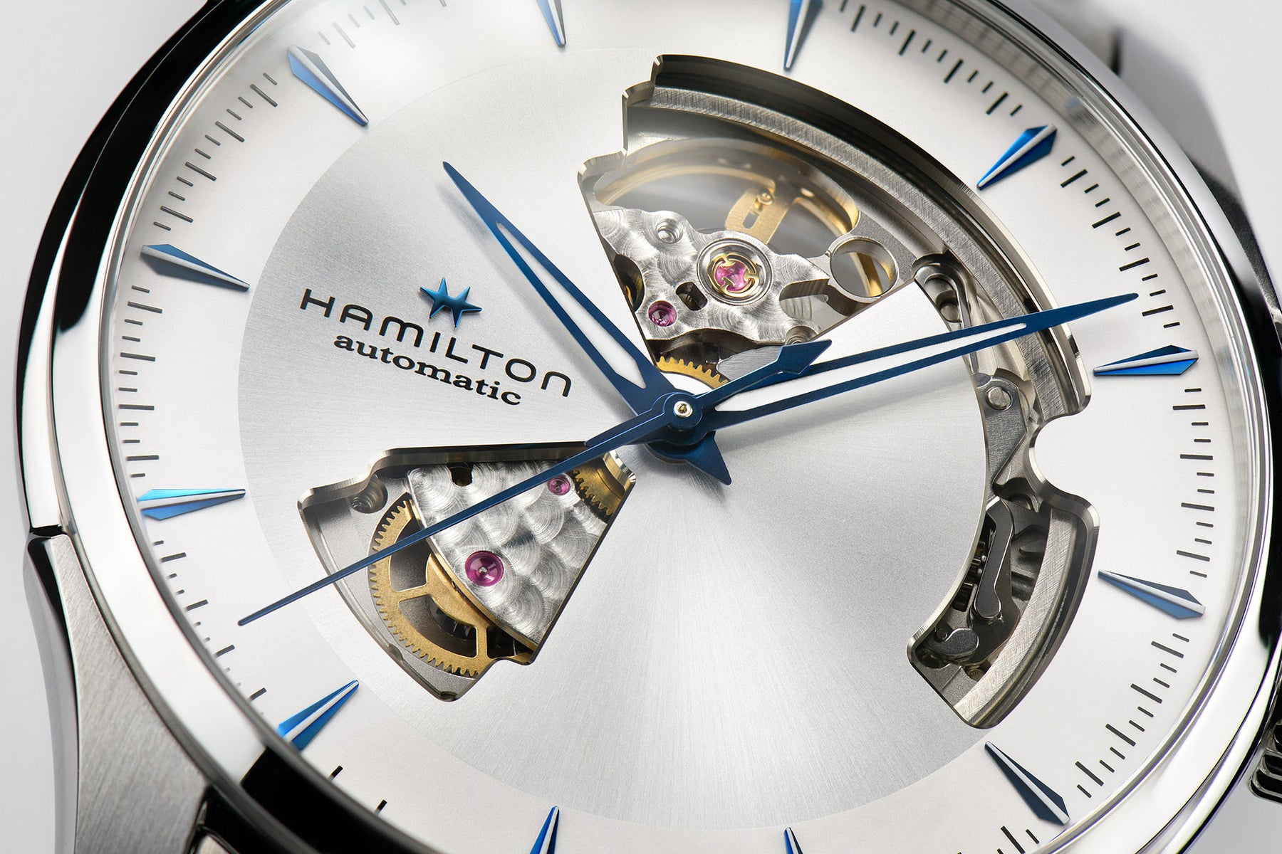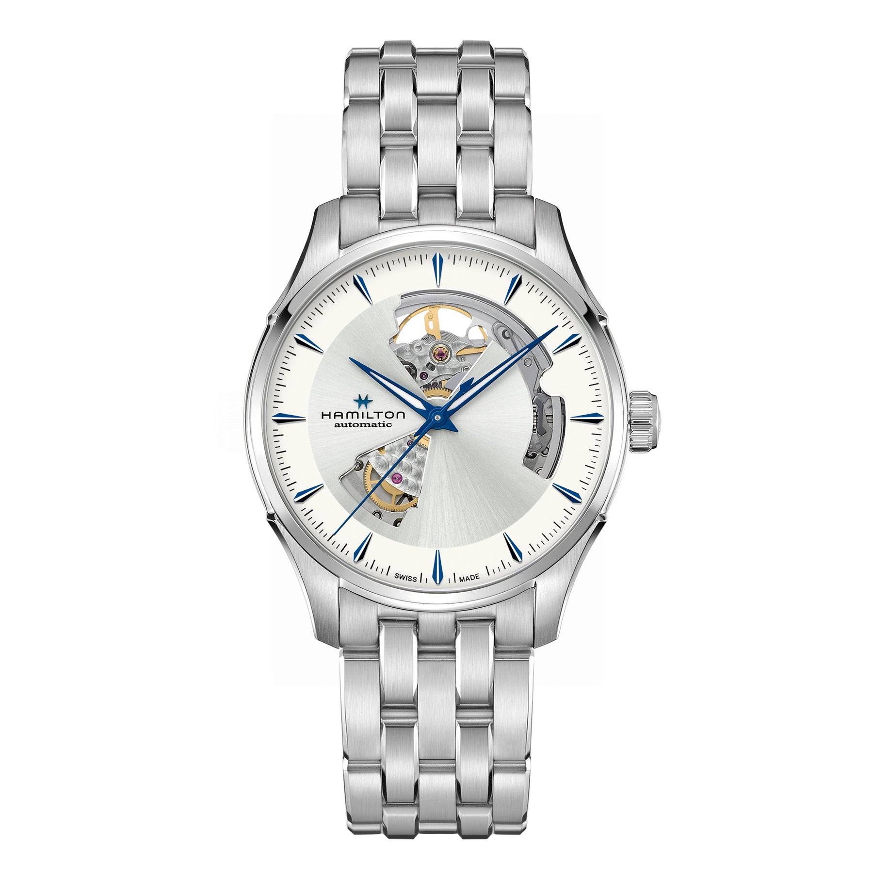Classic watchmaking meets contemporary design in this blue and silver Jazzmaster Open Heart Automatic. Precision cutouts in its 40mm dial offer a glimpse at the Swiss-made movement inside and give this sophisticated timepiece a powerful personality all its own. Reference No. H32675150