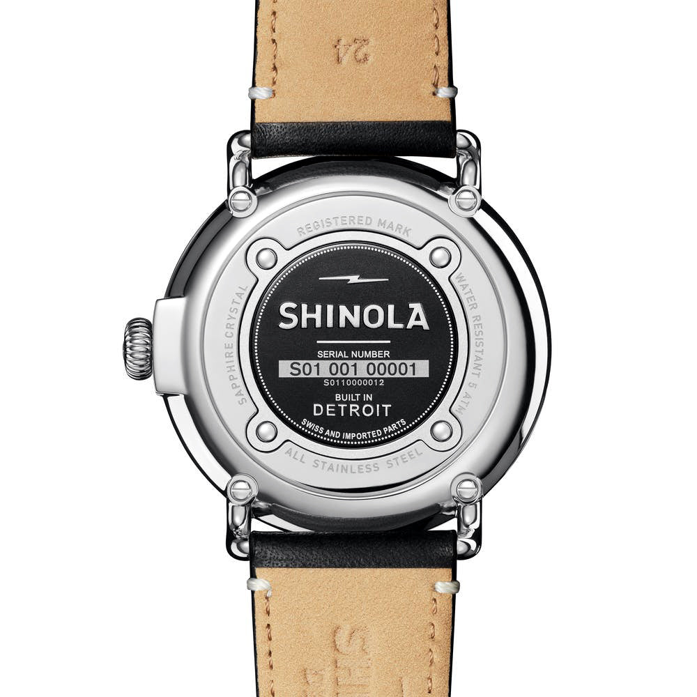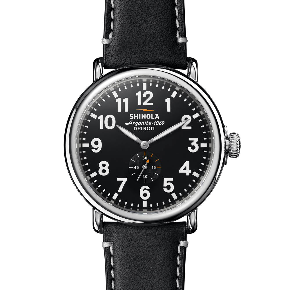 Built to last, named accordingly, this Runwell sports a supremely classic color palette. Two hands and a sub dial are driven by Shinola's Argonite 1069 high-accuracy quartz movement. Double-domed sapphire crystal protects the timepiece from scratches. With the stunning black dial, Super-LumiNova details, the shiny stainless steel, and the leather strap with striking contrast stitching, quality is this timepiece's most apparent characteristic.