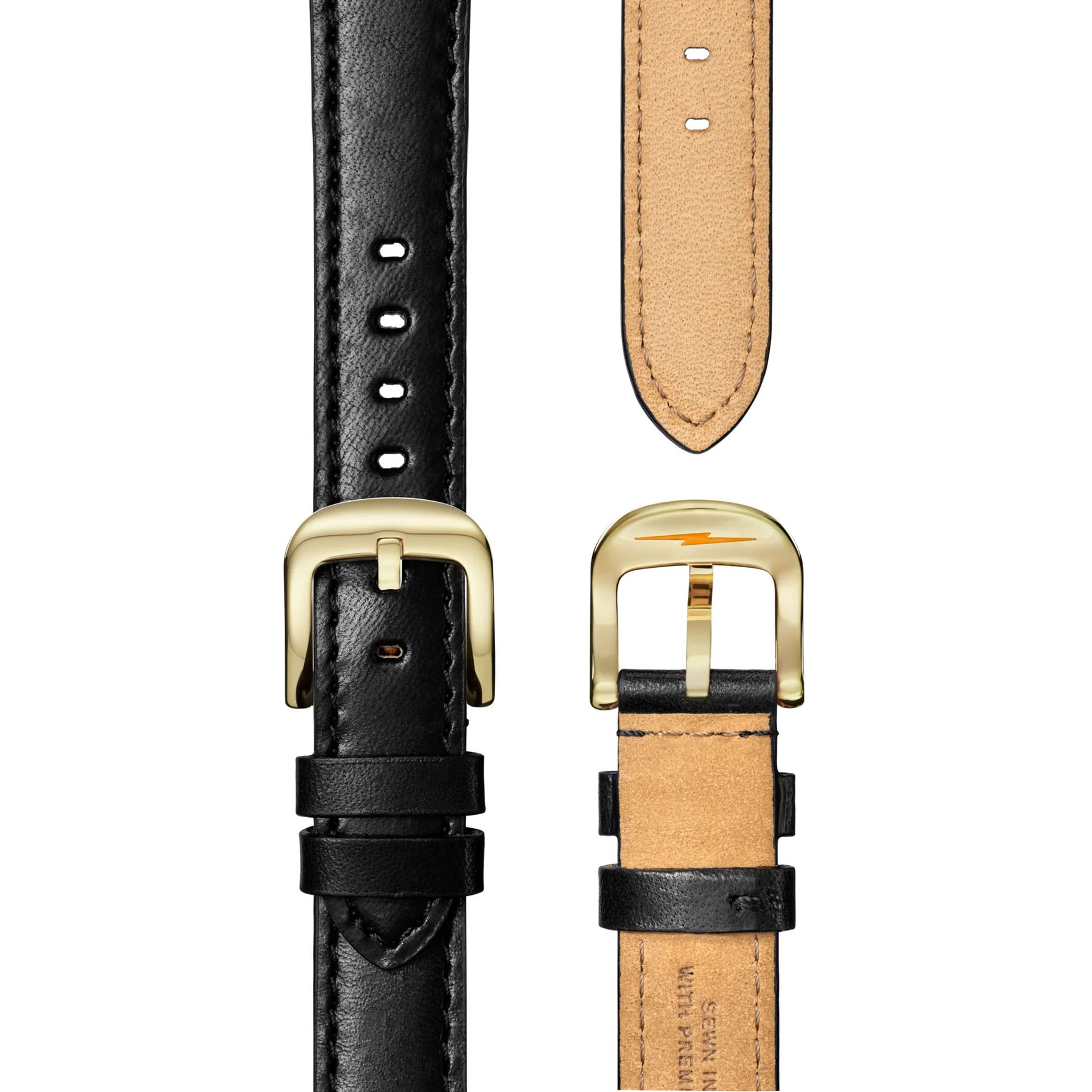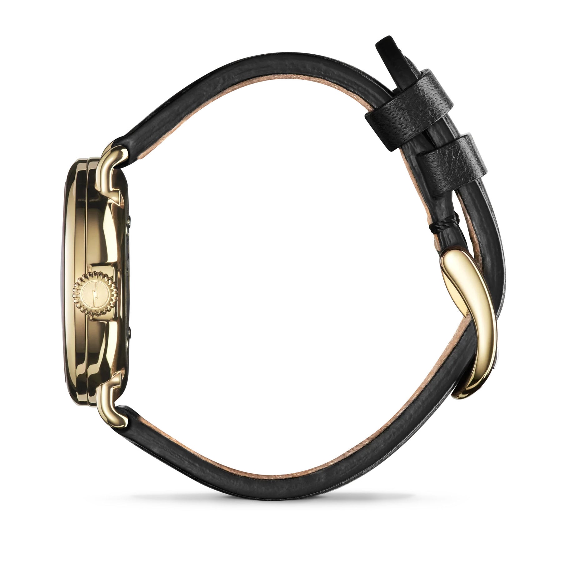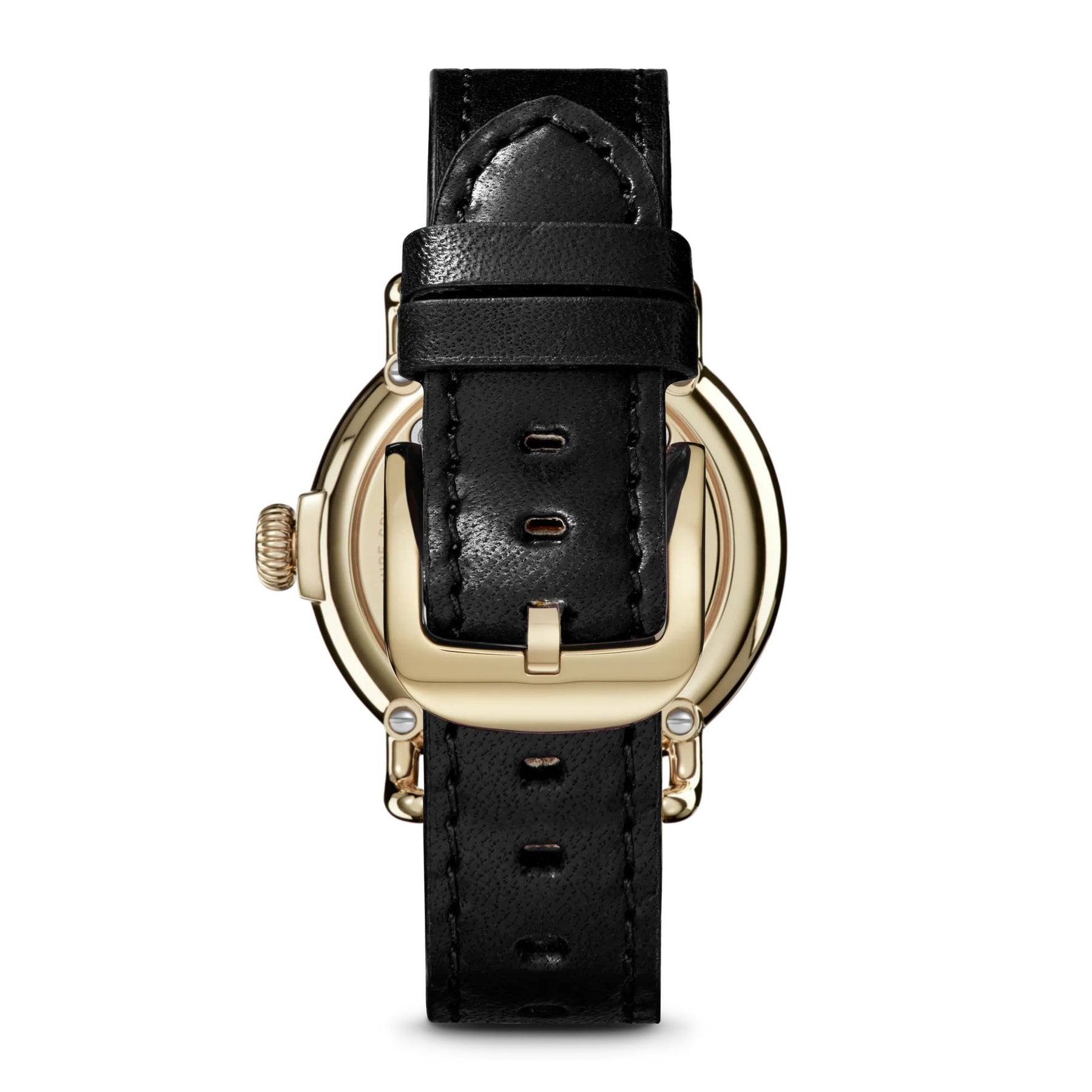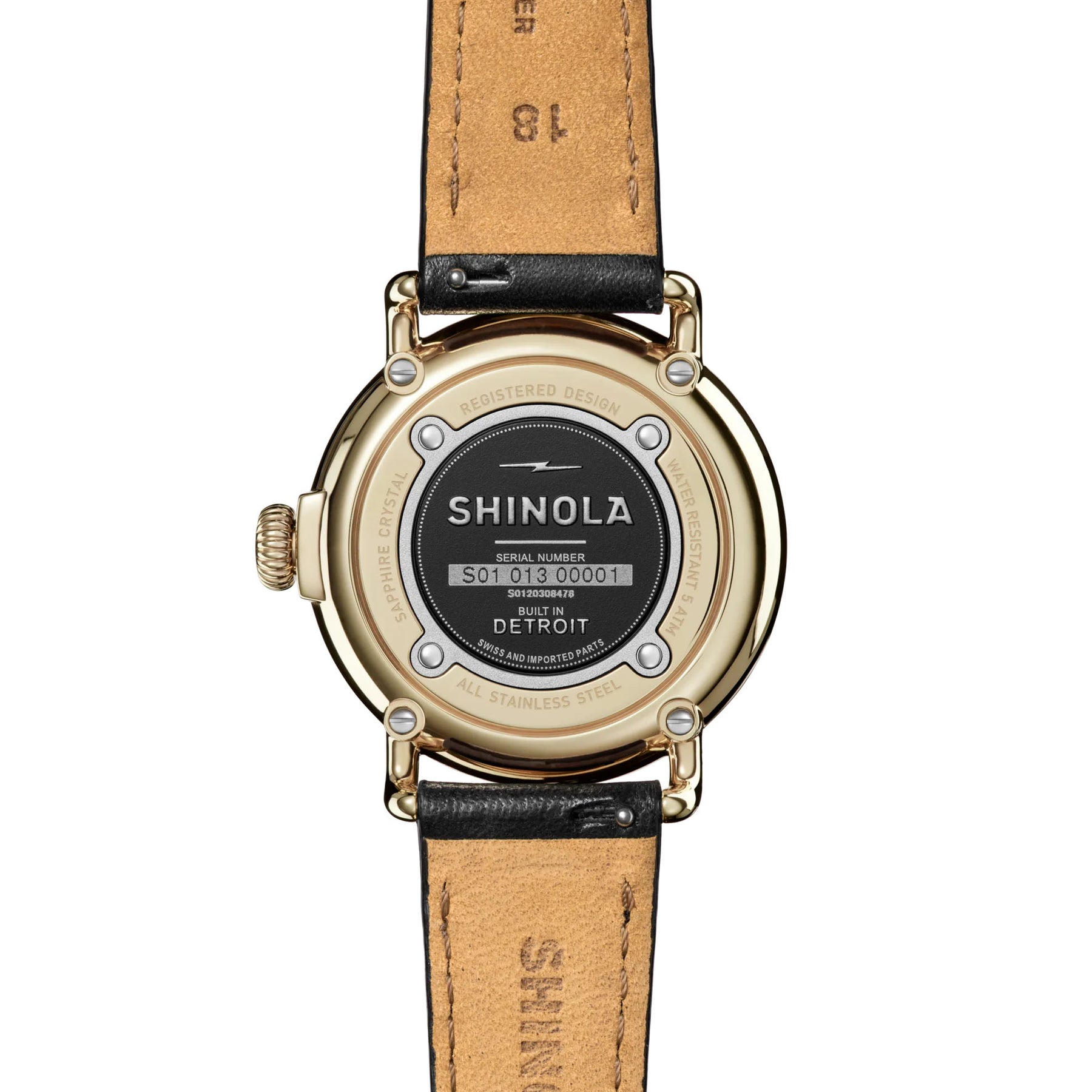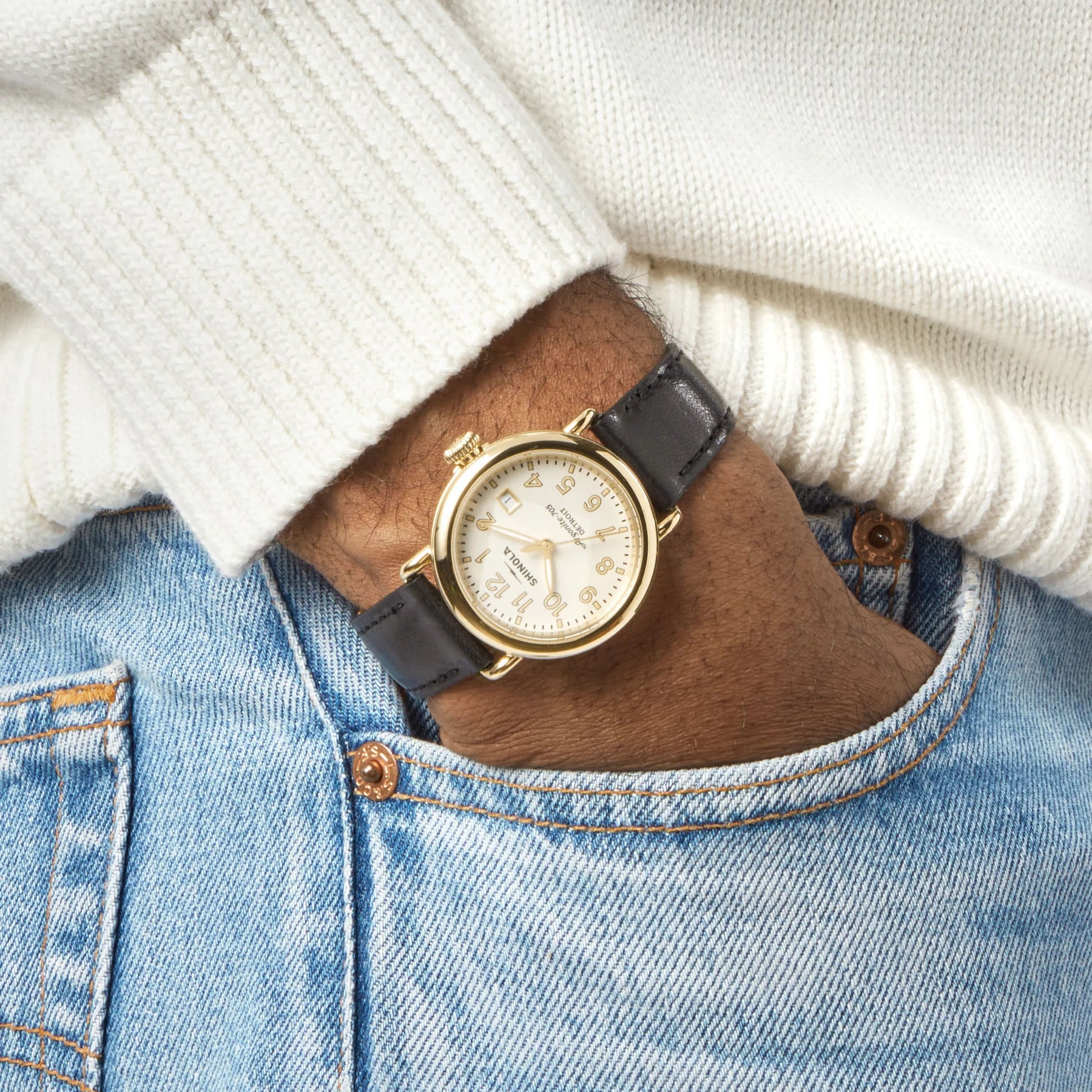 Shinola's flagship timepiece in a scaled-down size that complements any wrist. Built to last and named accordingly, this Runwell is a classic no matter how you wear it. Polished gold hands and shiny cream indexes with a dark brown outline pop against the matte alabaster dial. The look is brought together by the warm tones of the gold stainless steel case and refined black leather strap. The hands and calendar aperture are powered by the Argonite 705 movement. And like every Runwell, it features our signature calling cards: Wire lugs, a pumpkin crown, iconic caseback—and is proudly designed and assembled in Detroit