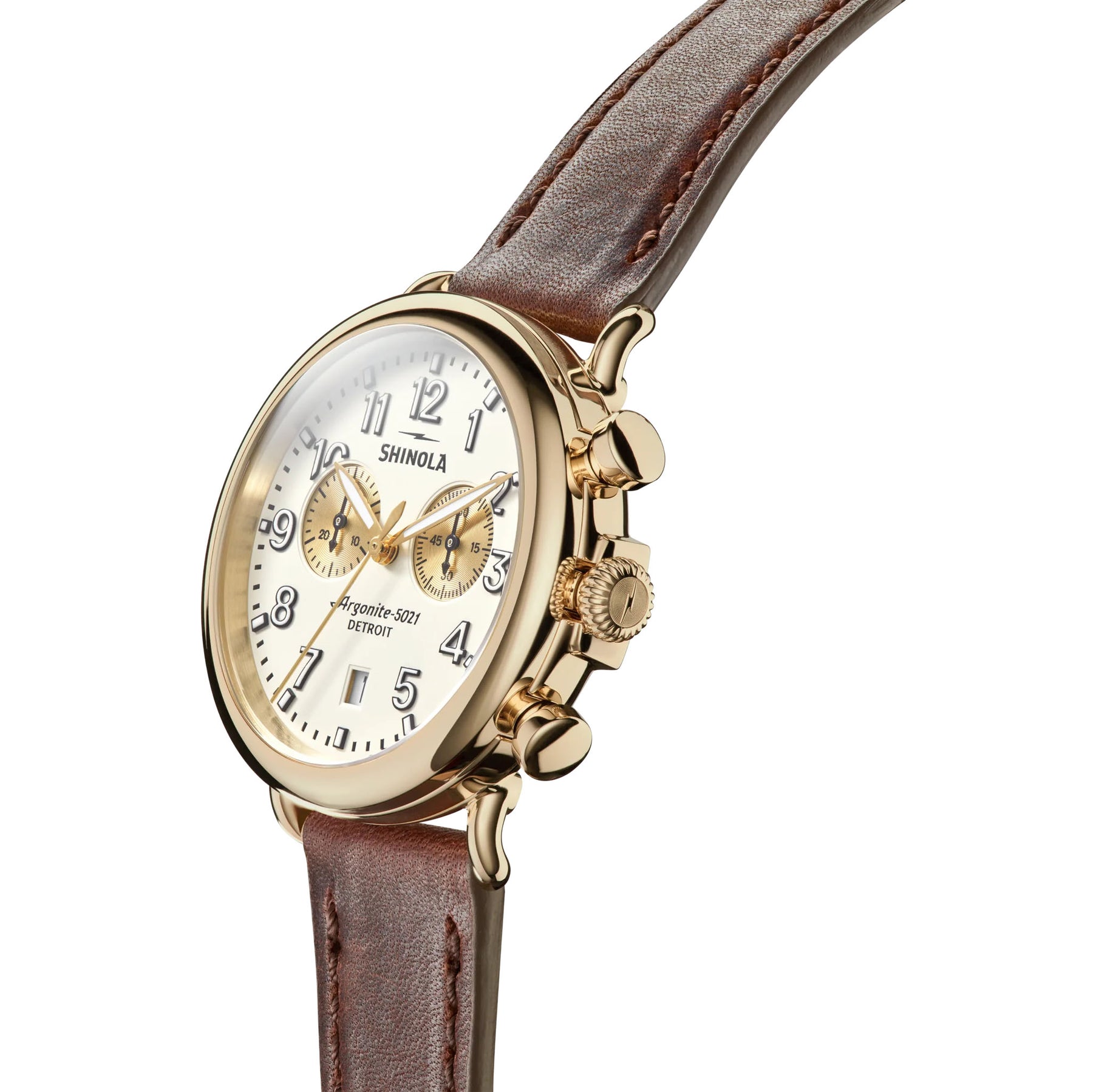 Put it on for the first time, but feel like you've had it forever. With a polished gold PVD case and two gold-toned sub-dials, this 41mm Runwell Chrono is a timepiece that has a generational appeal. Its warm matte ivory velvet dial is punctuated by a calendar aperture and gold-toned Super-LumiNova hands. A rich cattail brown leather strap adds even more character to this casually captivating timepiece.