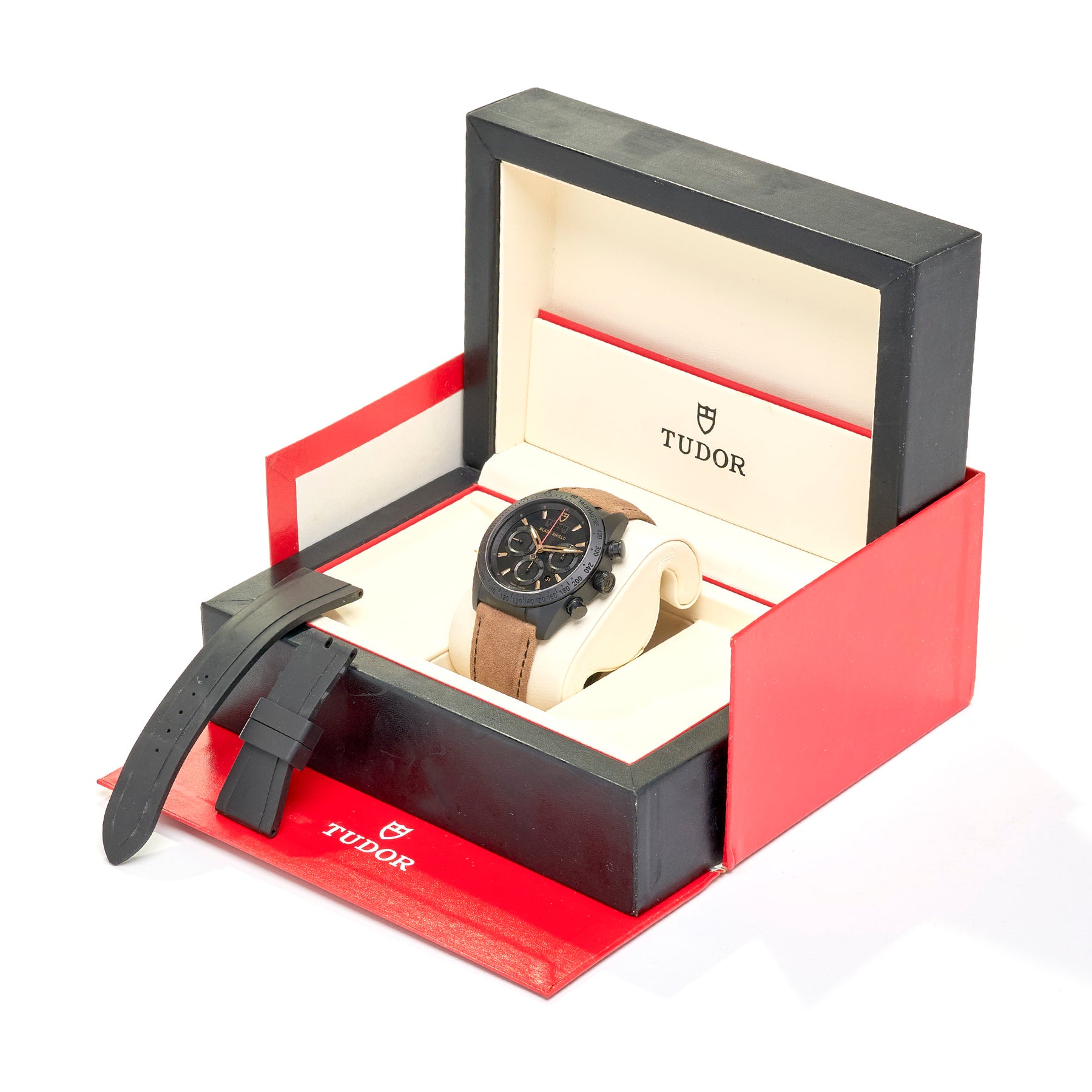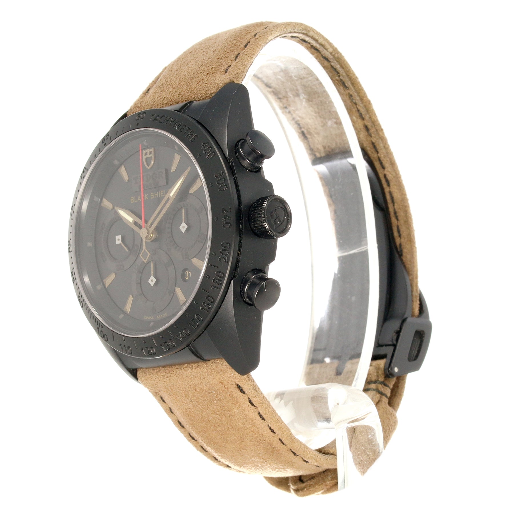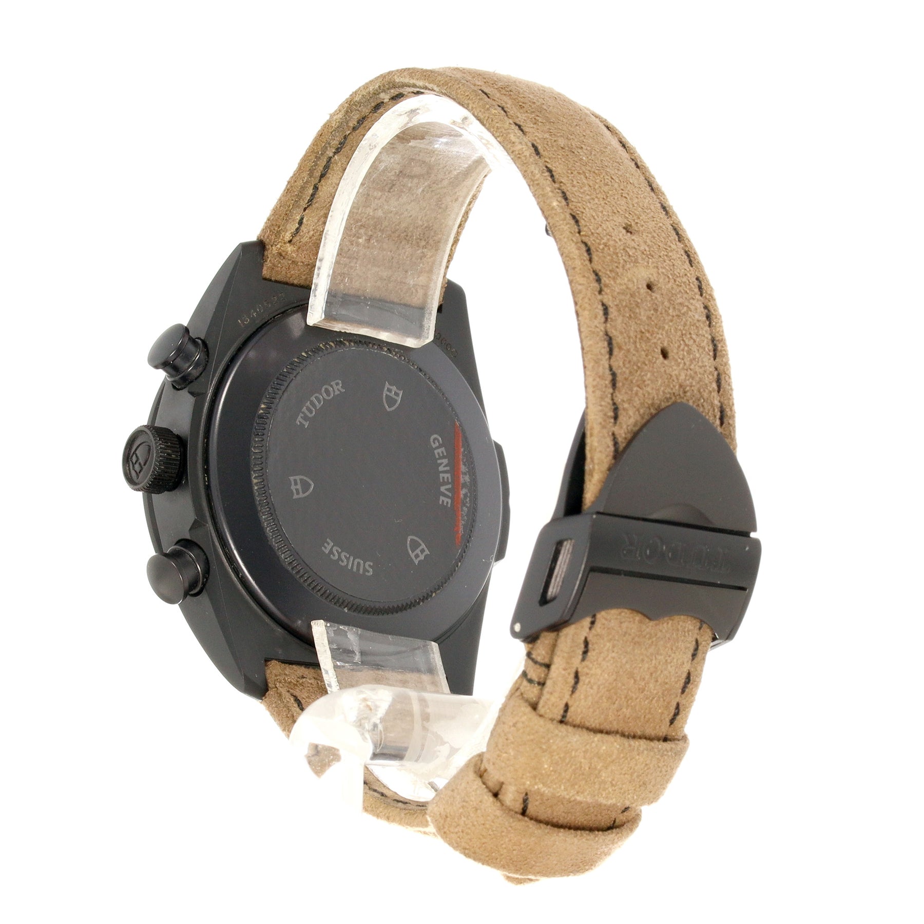 Tudor Fastrider Black Shield Automatic Chronograph (Ref. 42000CN) in black ceramic on a tan suede strap. Excellent condition with box.