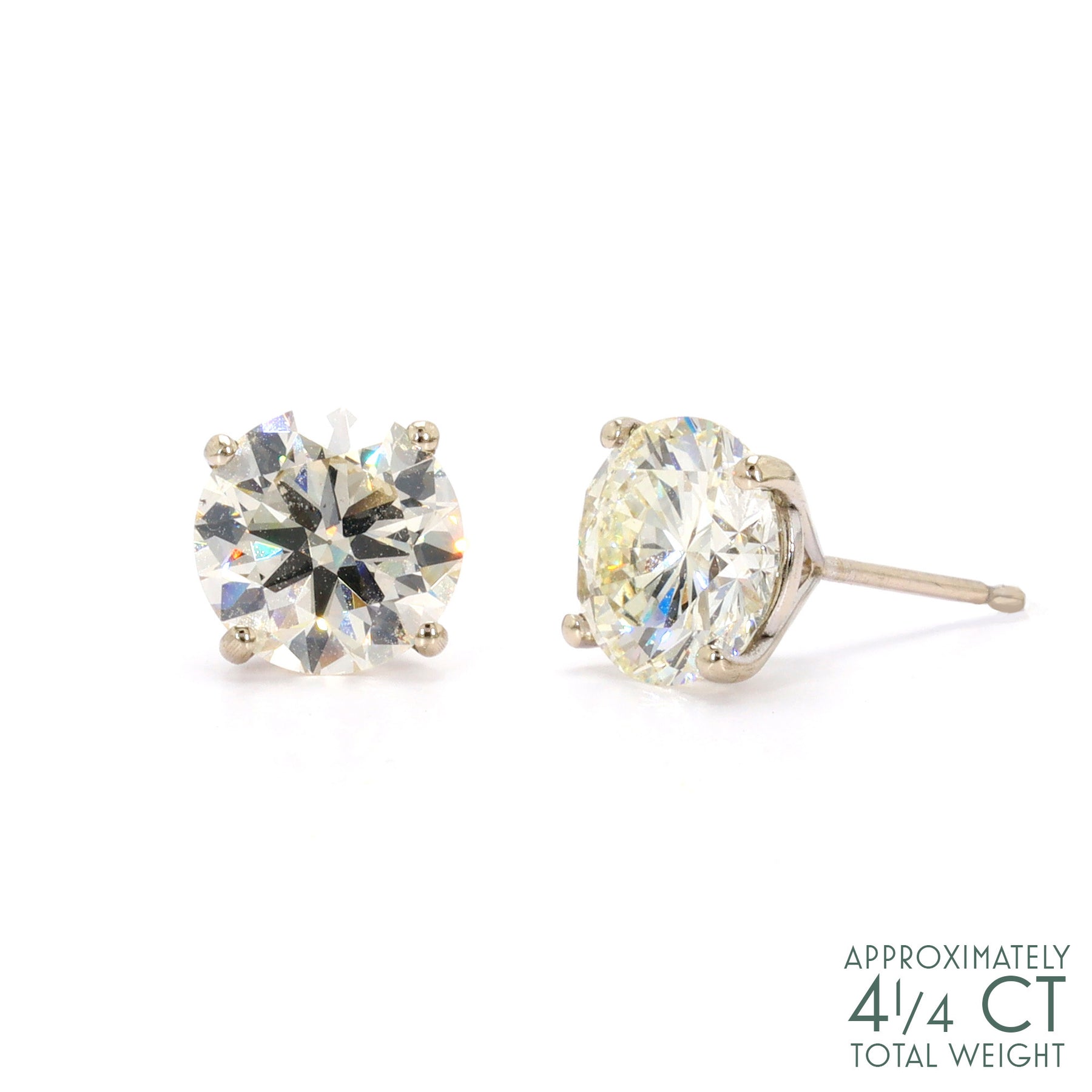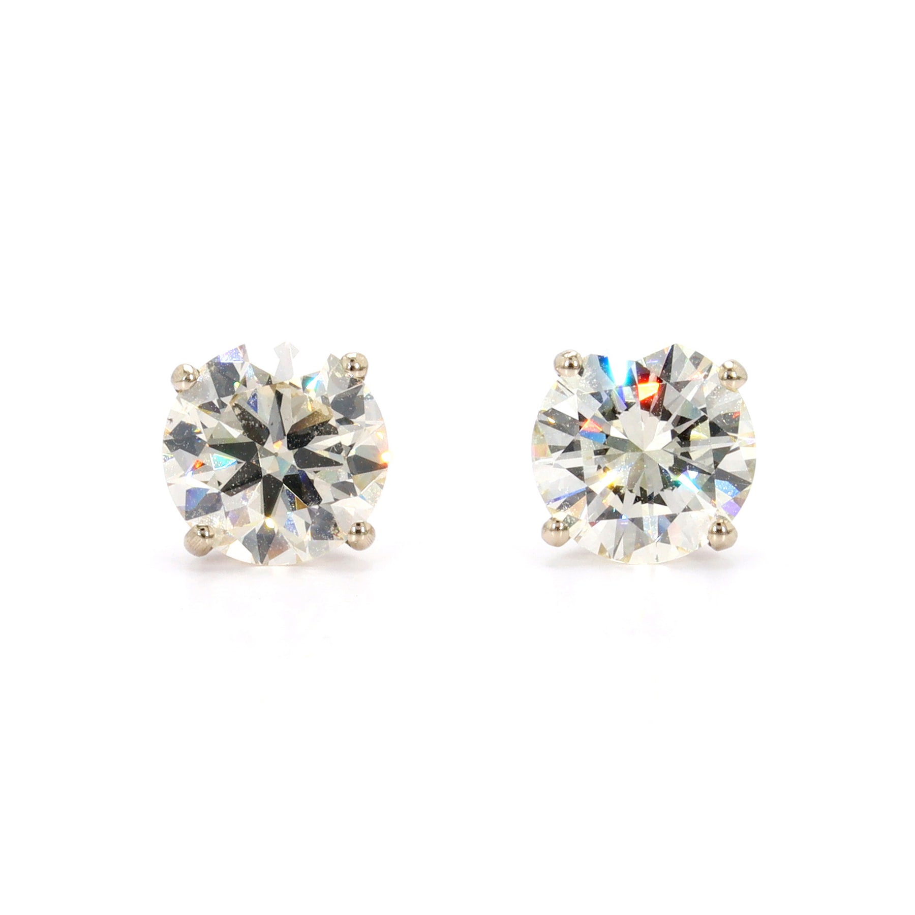 Diamond four-prong stud earrings in 14k white gold, featuring two round brilliant cut Diamonds with a combined weight of 4.28 carats.