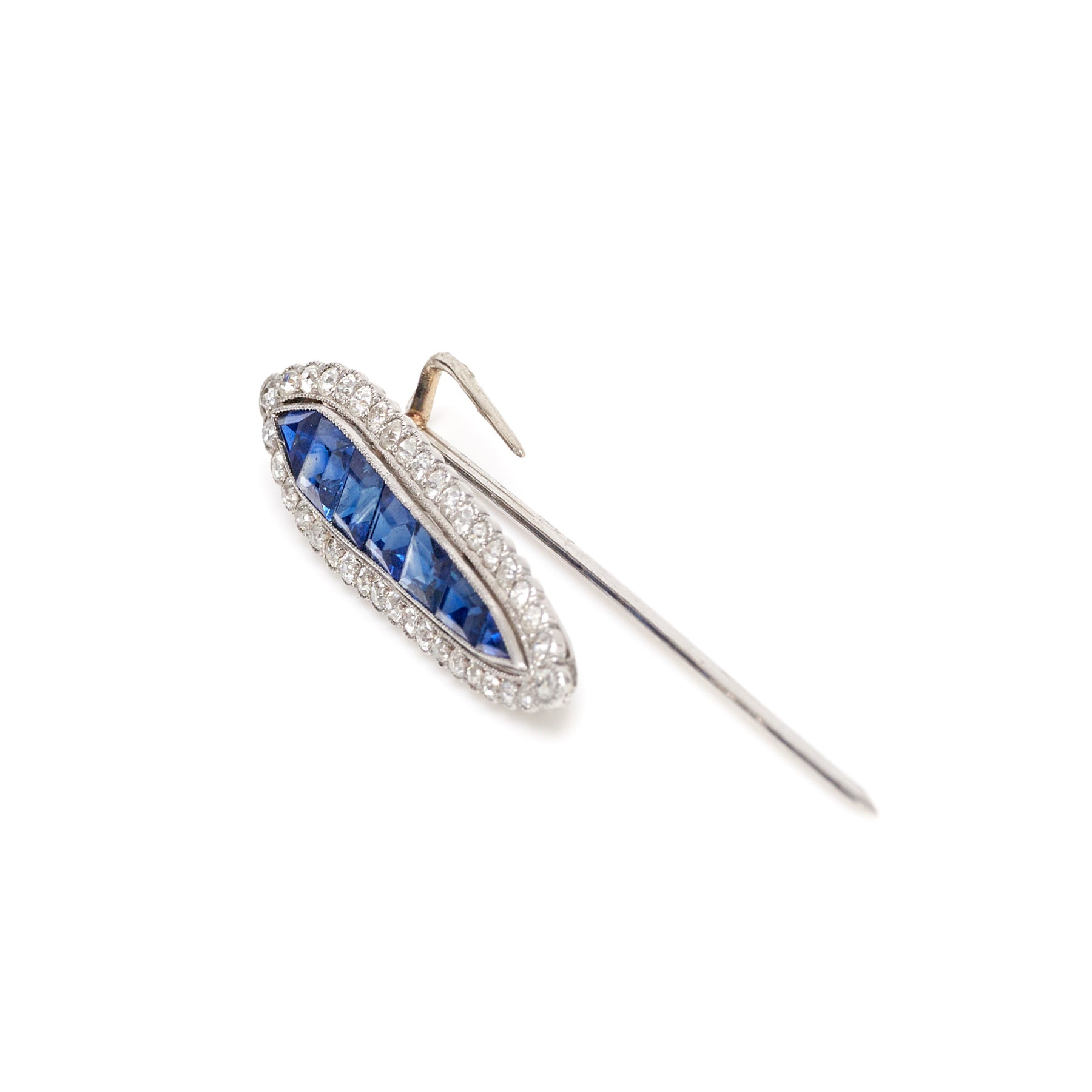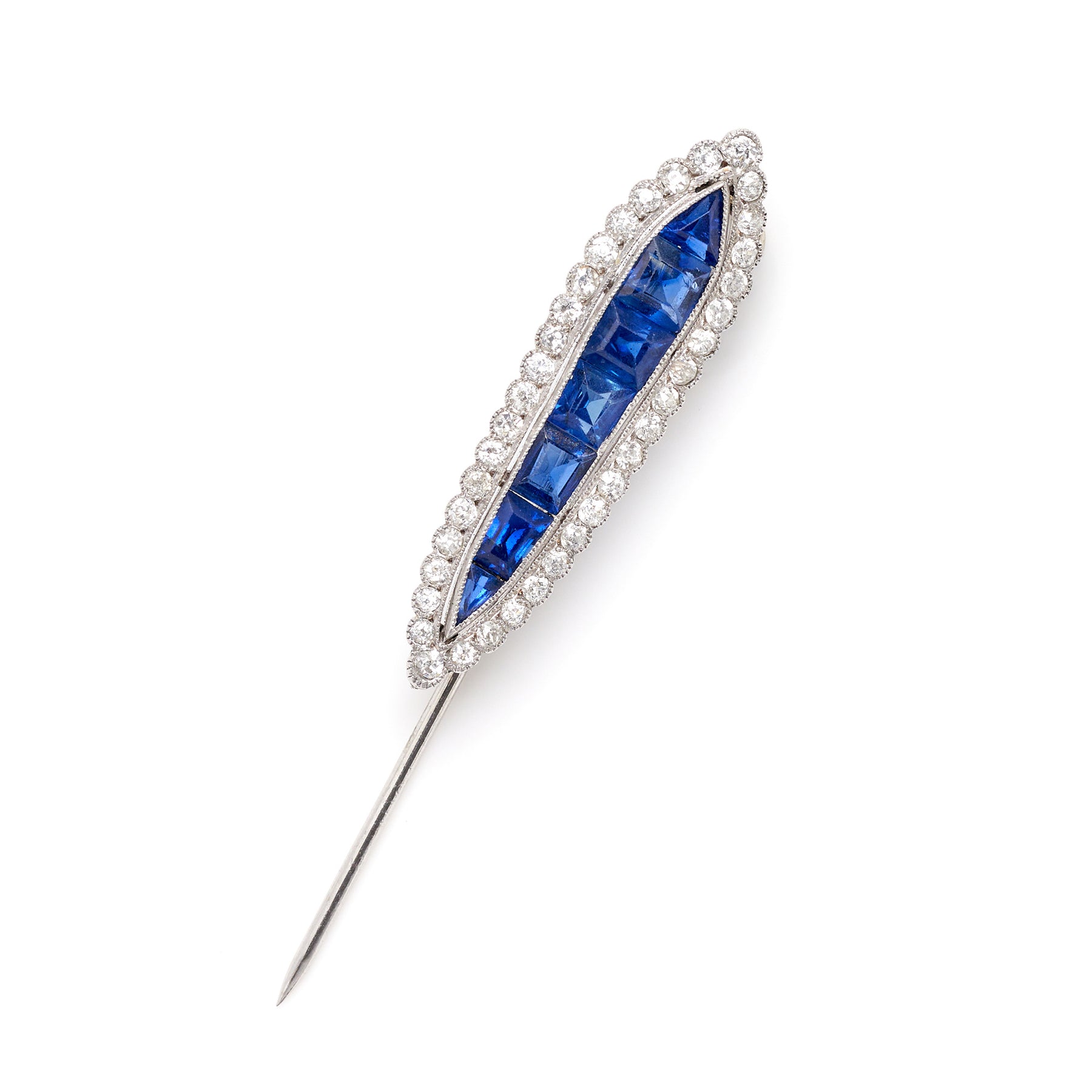 Art Deco pin in platinum featuring 7 blue sapphires with a combined weight of approximately 1.50 carats and 38 diamonds (G-I, VS-SI) with a combined weight of approximately 0.61 carats.