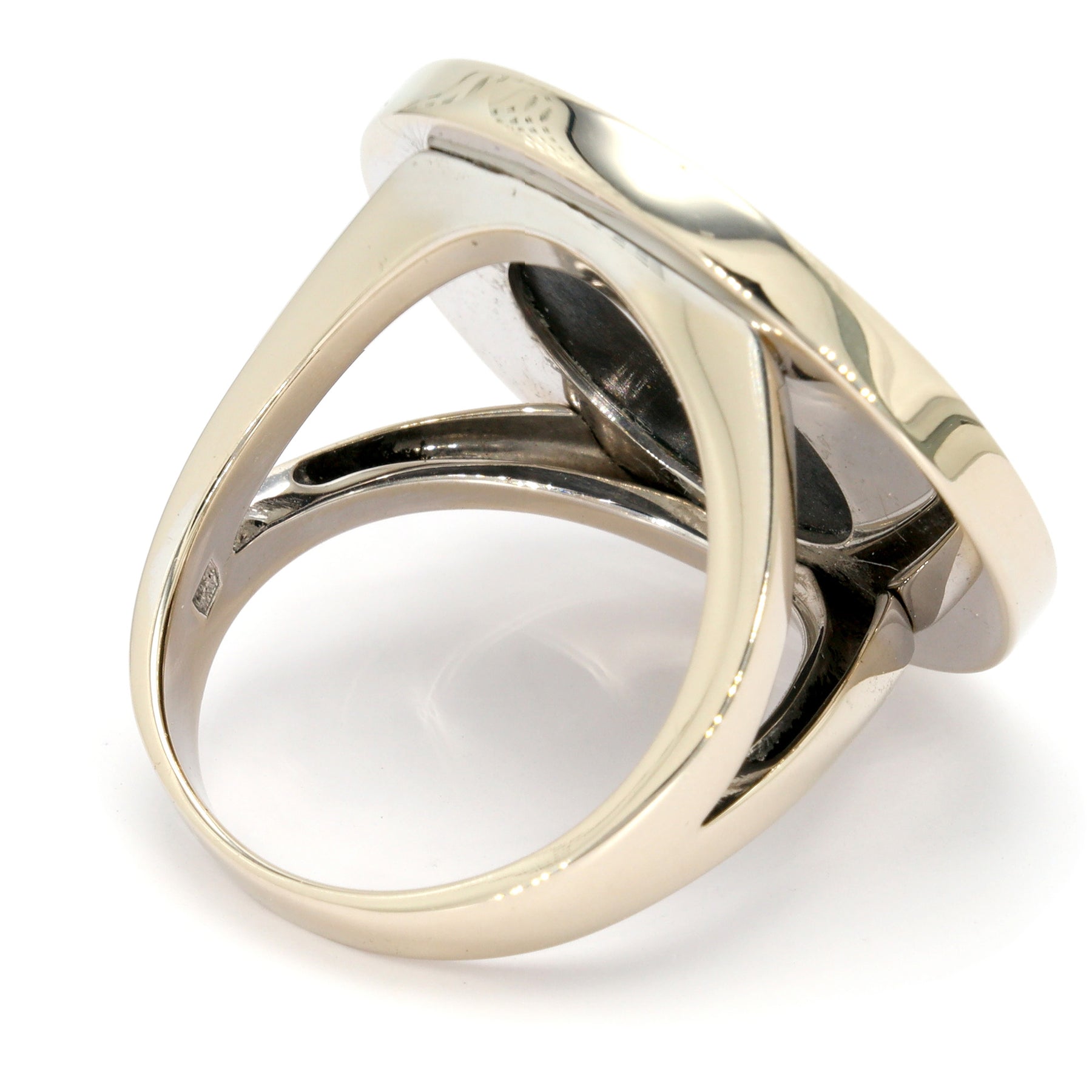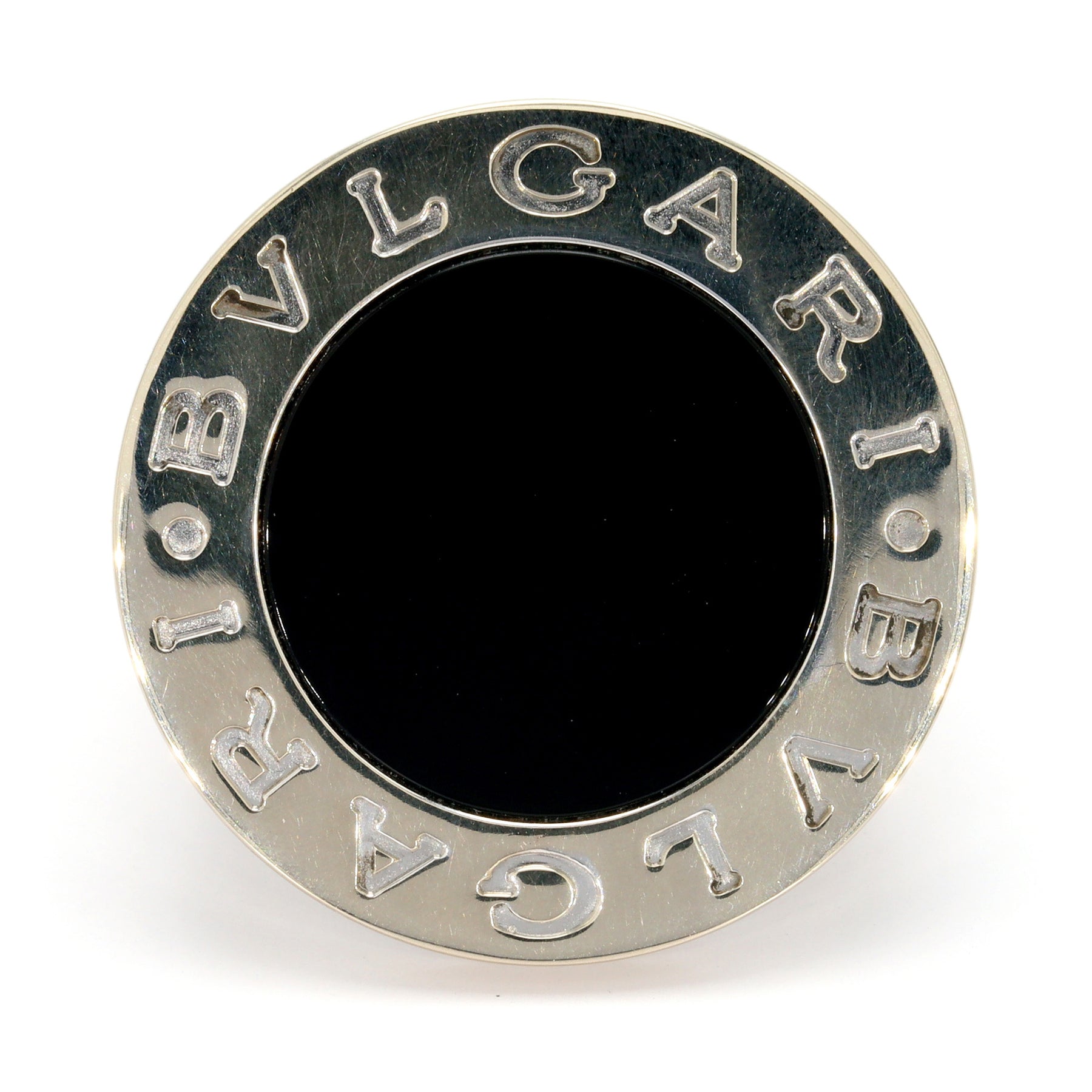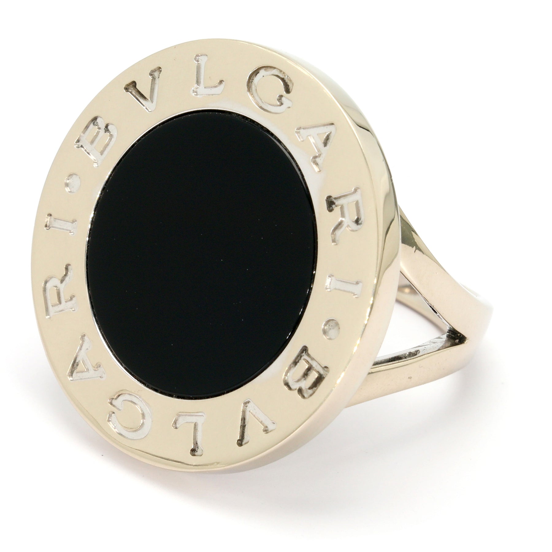 Bulgari split-shank fashion ring in 18-karat white gold featuring a 9mm black Onyx disc with a BVLGARI stamped bezel.