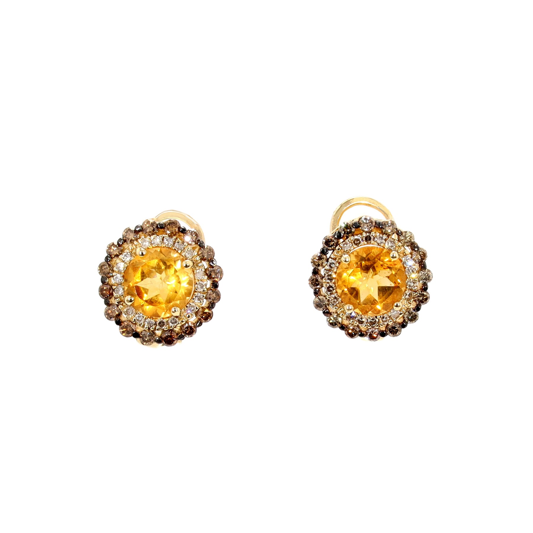 Halo earrings with omega backs in 14-karat yellow gold featuring 2 citrines with a combined weight of approximately 2.50 carats, 36 H/I diamonds with a combined weight of approximately 0.15 carats, and 32 light brown diamonds with a combined weight of approximatley 0.56 carats.