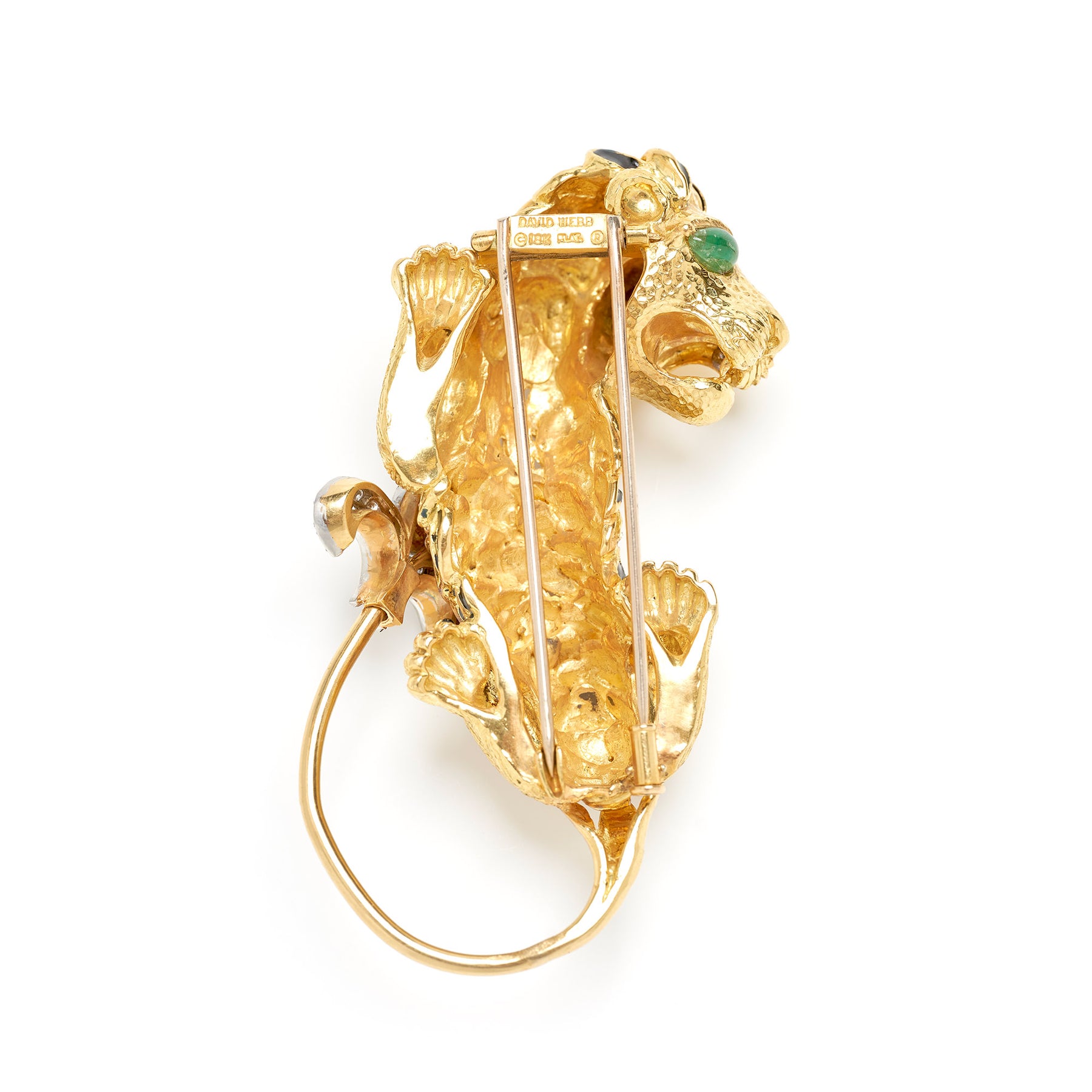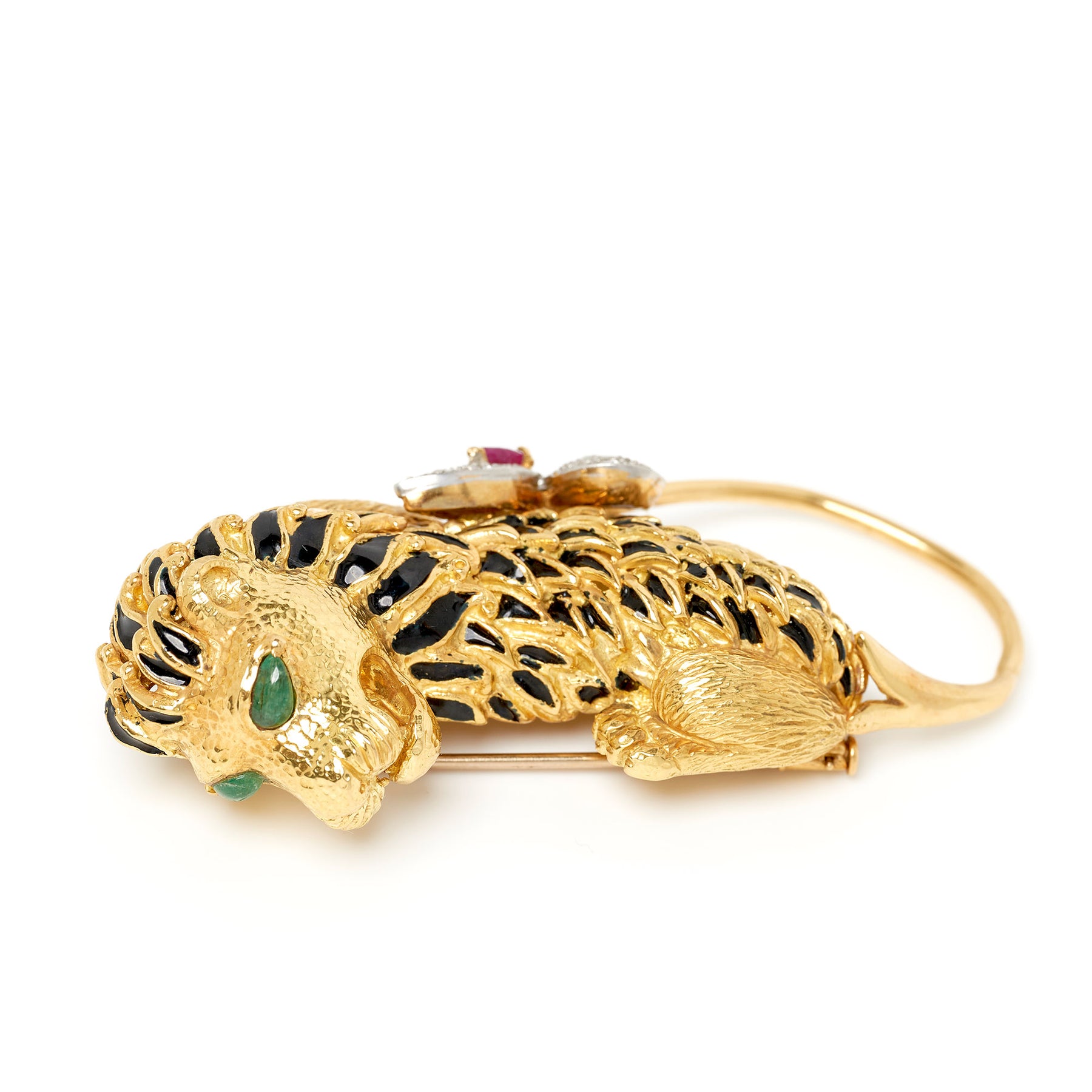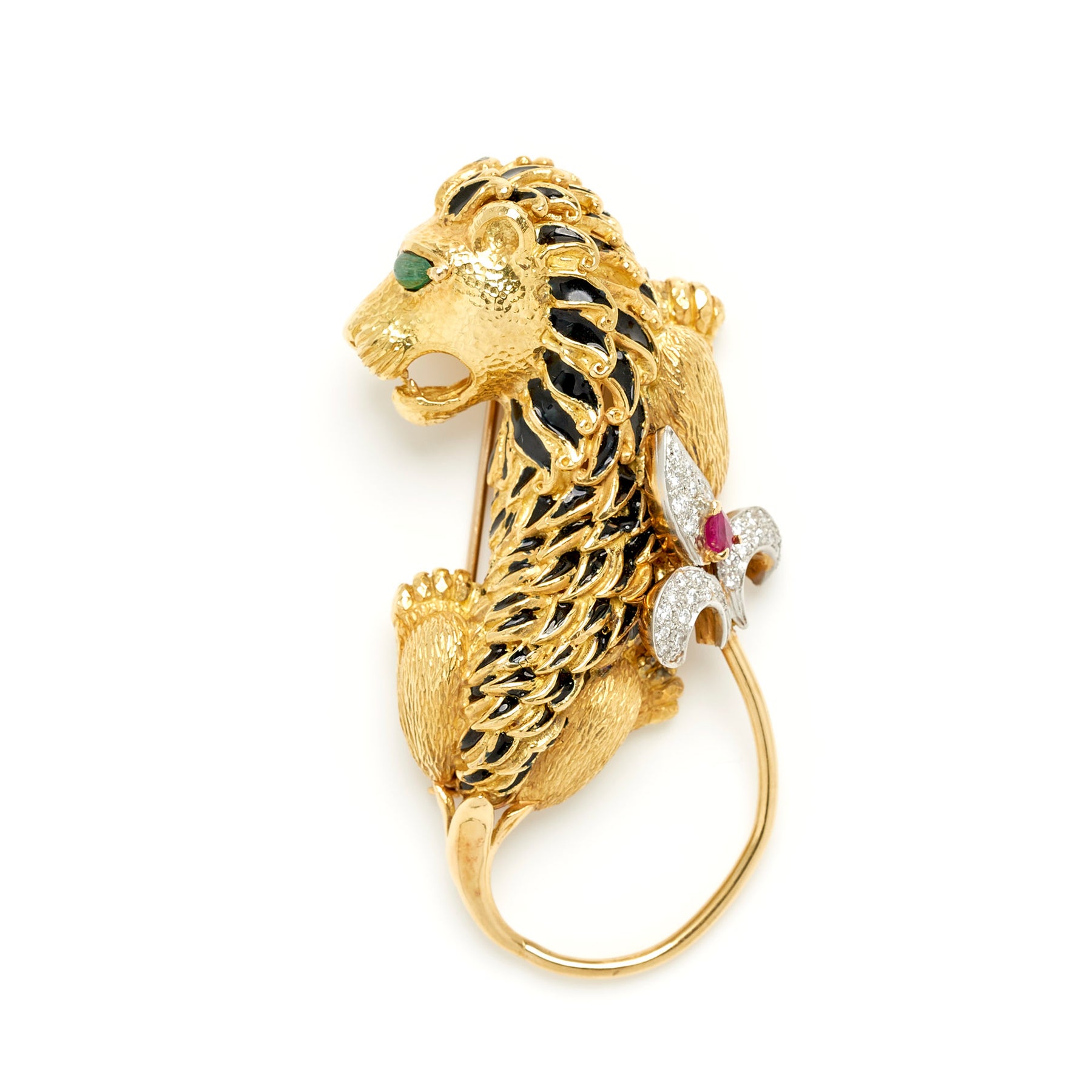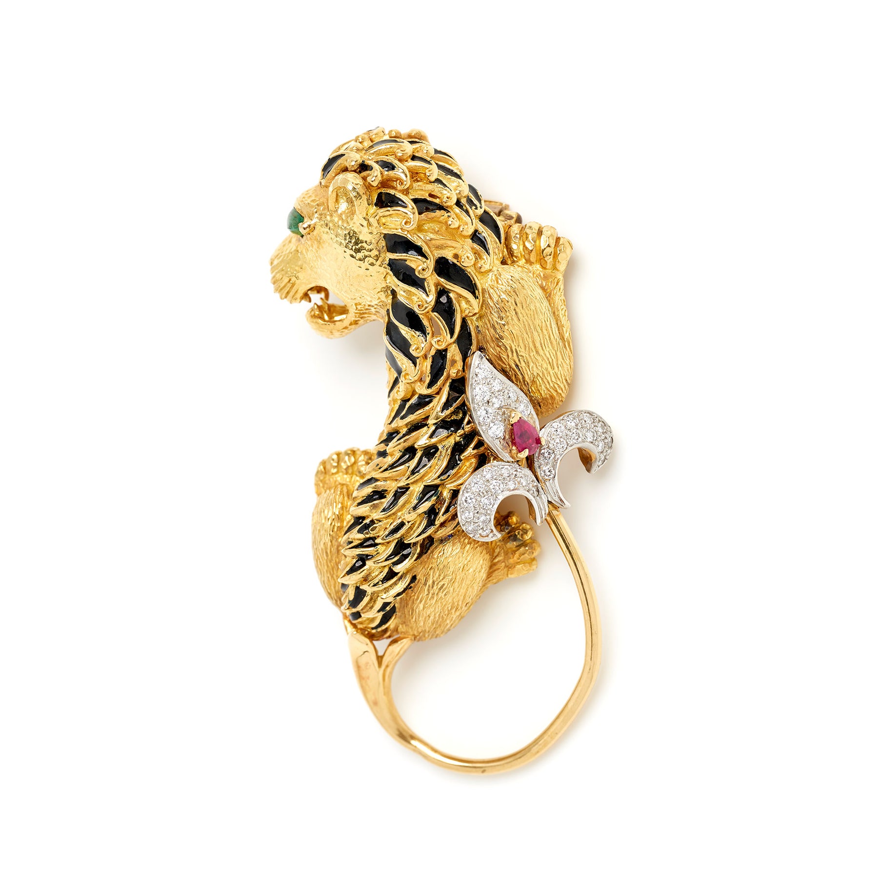 "David Webb" lion pin in 18-karat yellow gold and platinum, featuring 32 round brilliant cut Diamonds totaling approximately 0.75 carats, a pear-shaped Ruby weighing approximately 0.30 carats, and two Emerald cabochons totaling 0.70 carats.