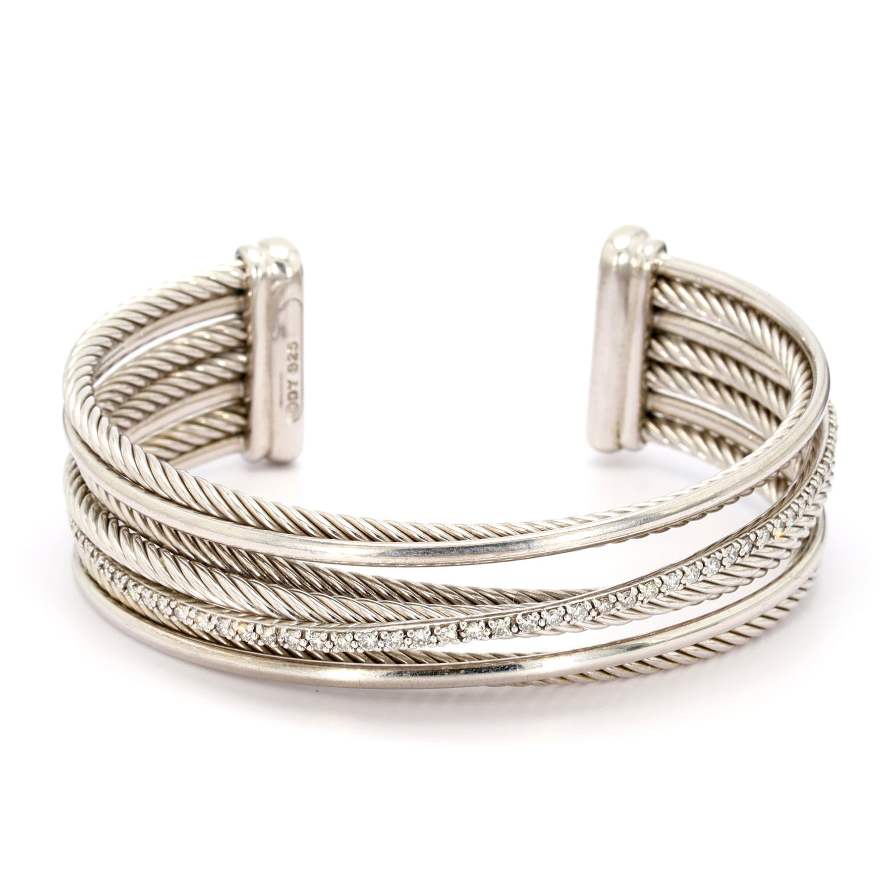 "David Yurman" crossover cuff in sterling silver, size 6.5, featuring 50 diamonds (G/H, SI) with a combined weight of approximately 0.60 carats.