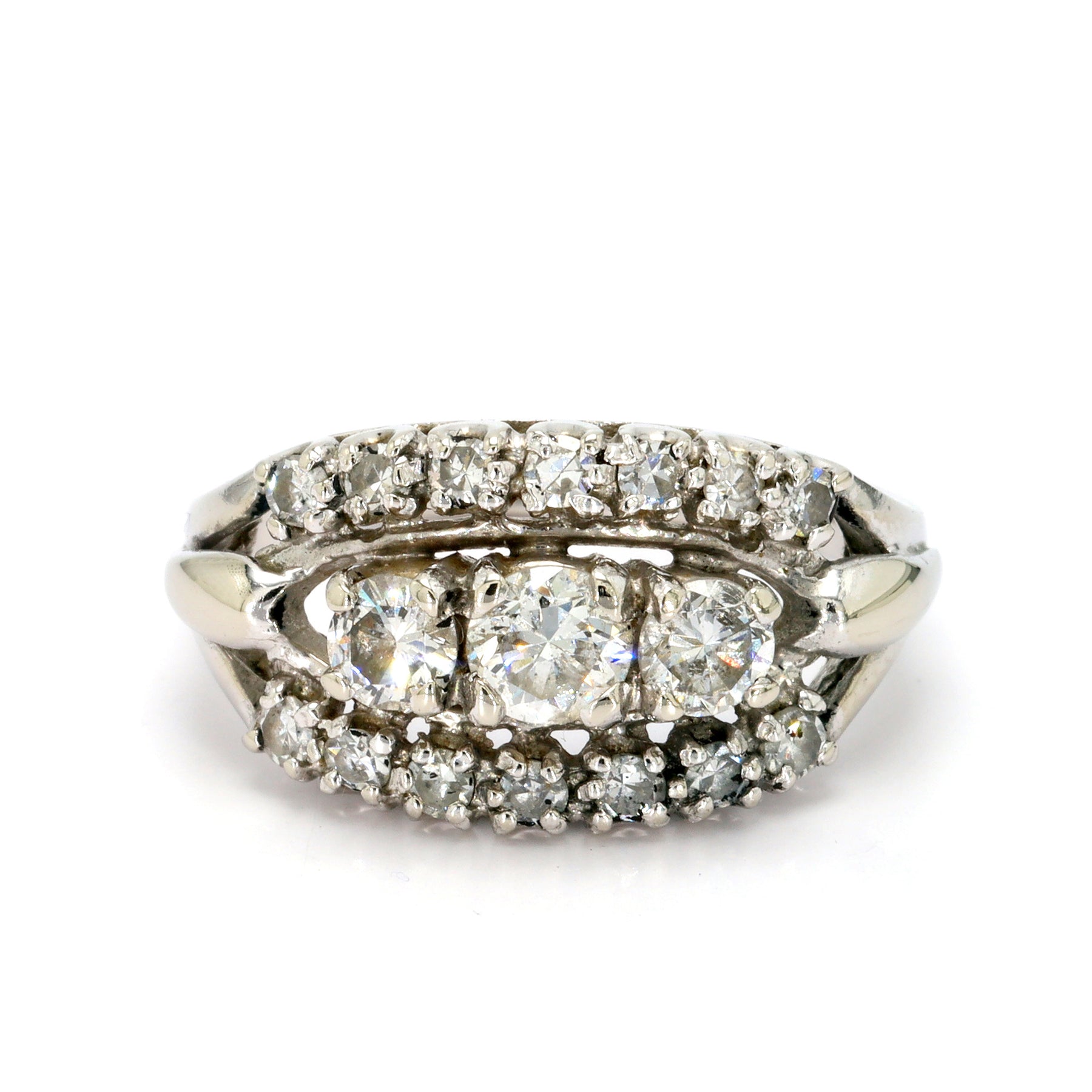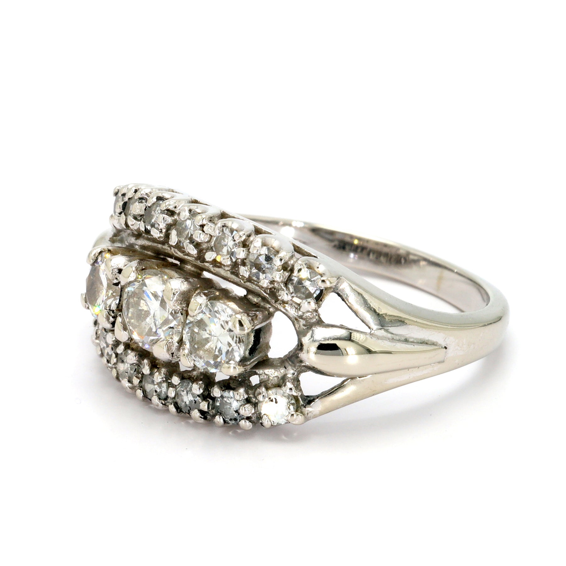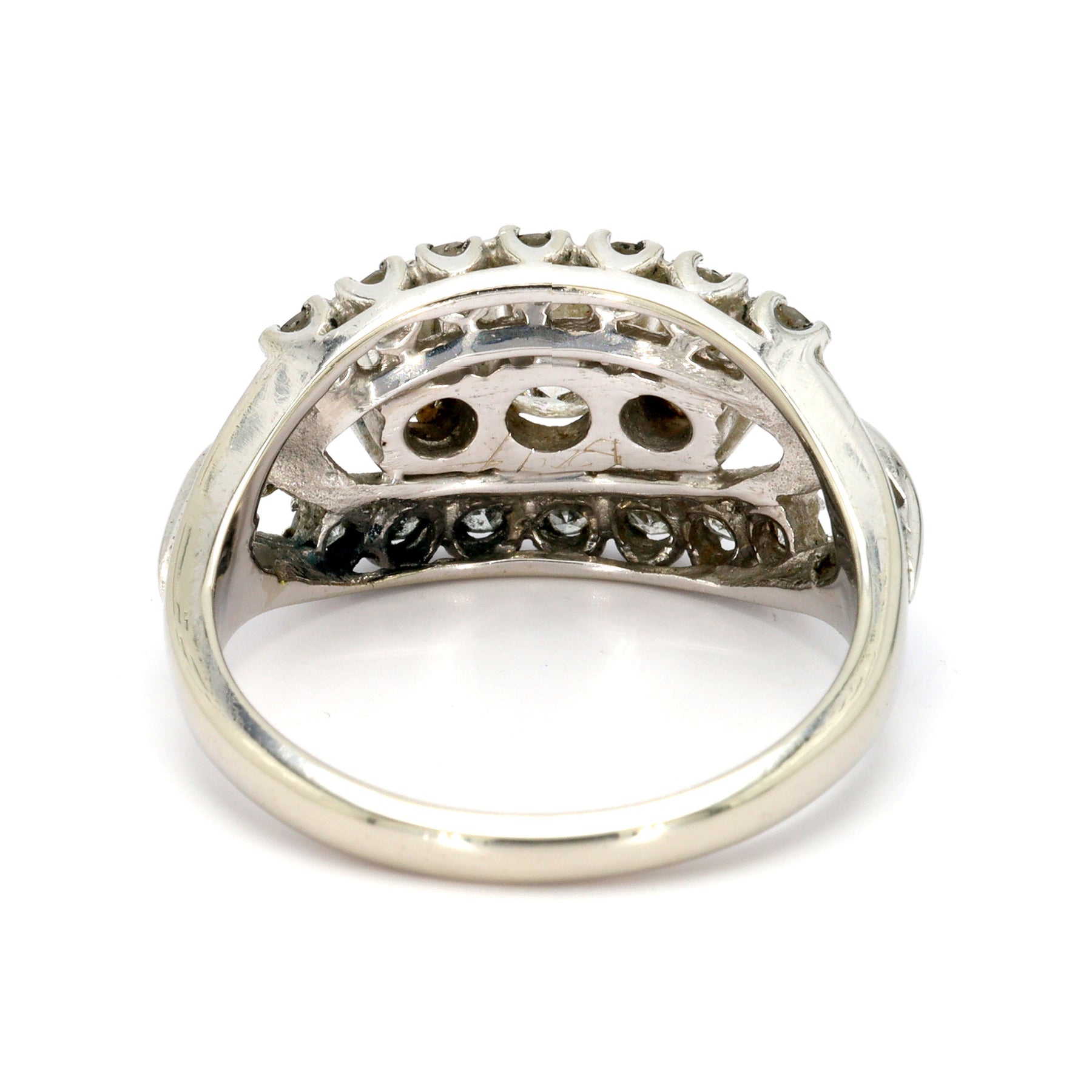 Fashion ring in 14-karat white gold, size 6.5, circa 1950, featuring 19 diamonds with a combined weight of approximately 1.00 carat.